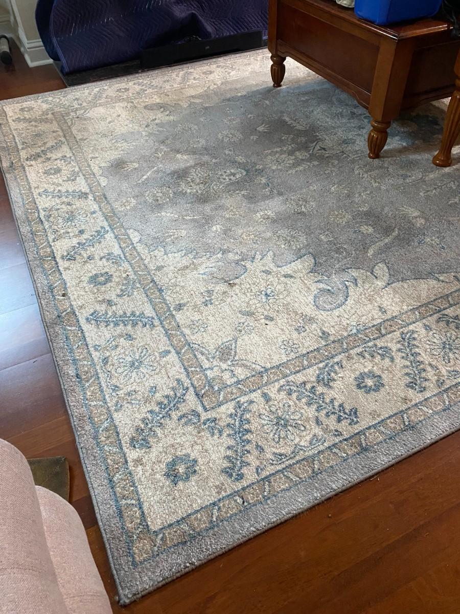 8' x 11' area rug, soft muted colors of gray, light blue, tan & off-white. Very good condition.