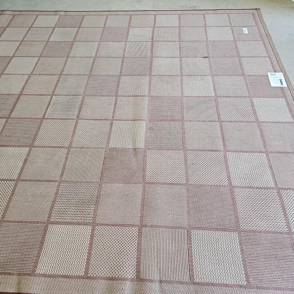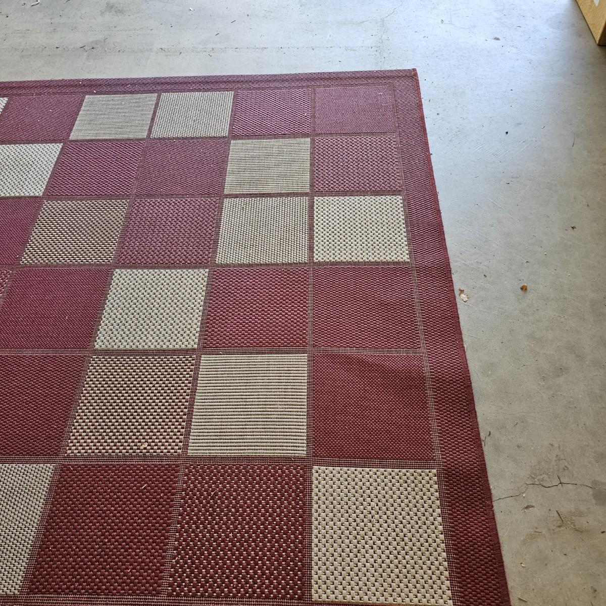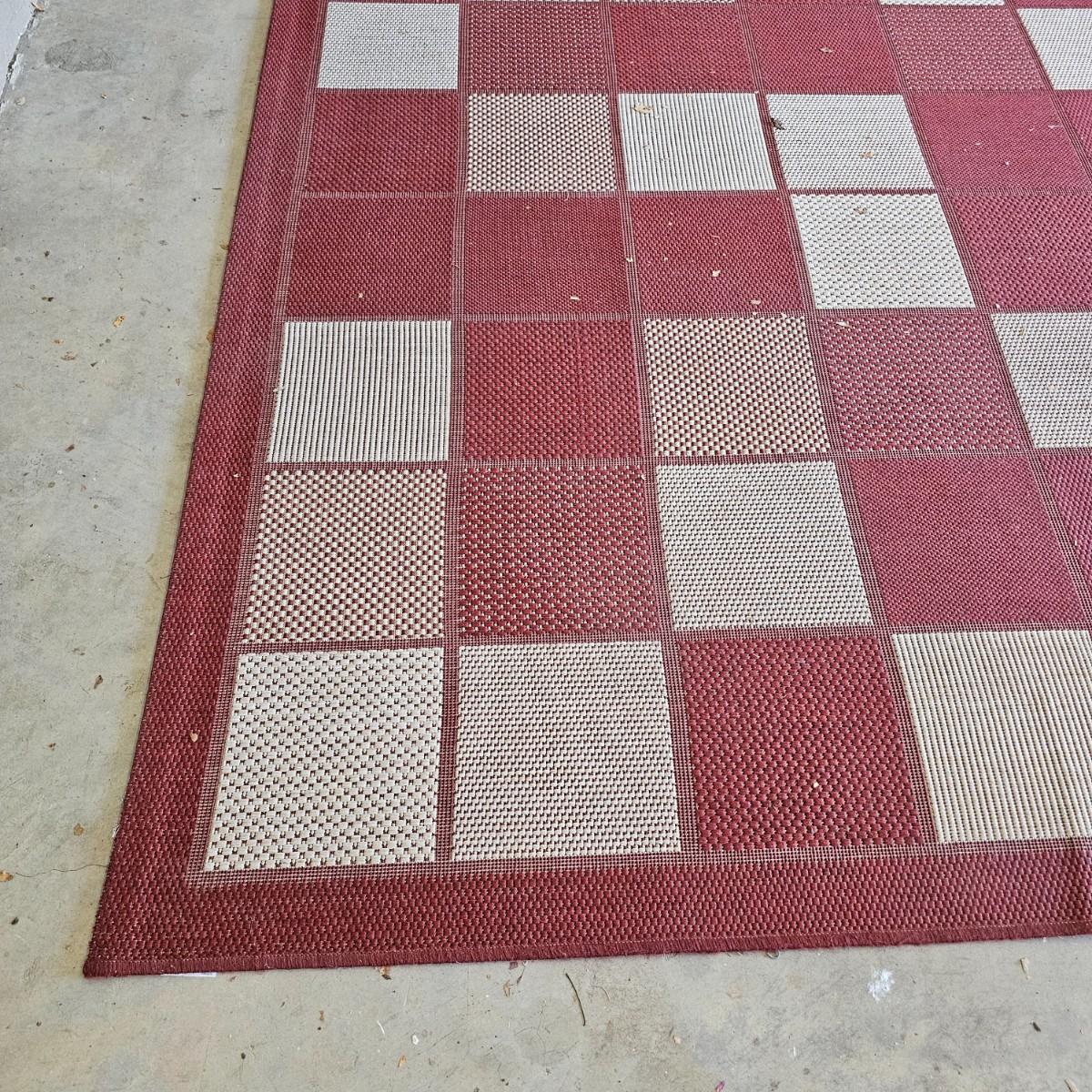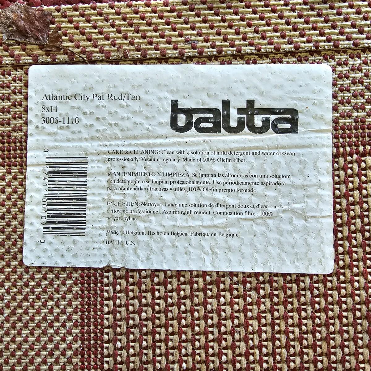 Red and tan squares and border patterns on this 8' x 11' Balta rug. Alternating solid/pattern squares. 100% Olefin fiber. Rug has been used in a garage and needs cleaning. See photos for details. Local pickup only.