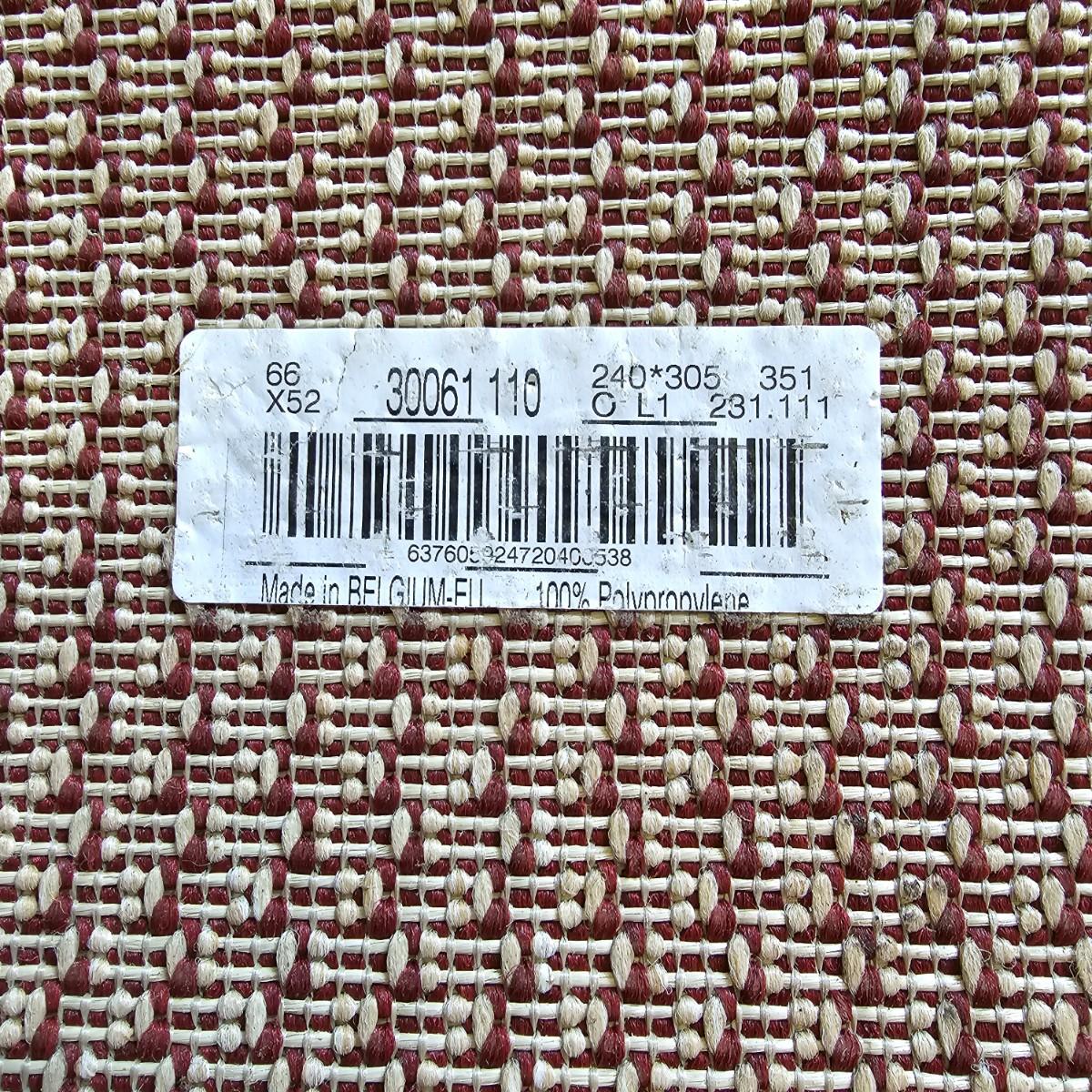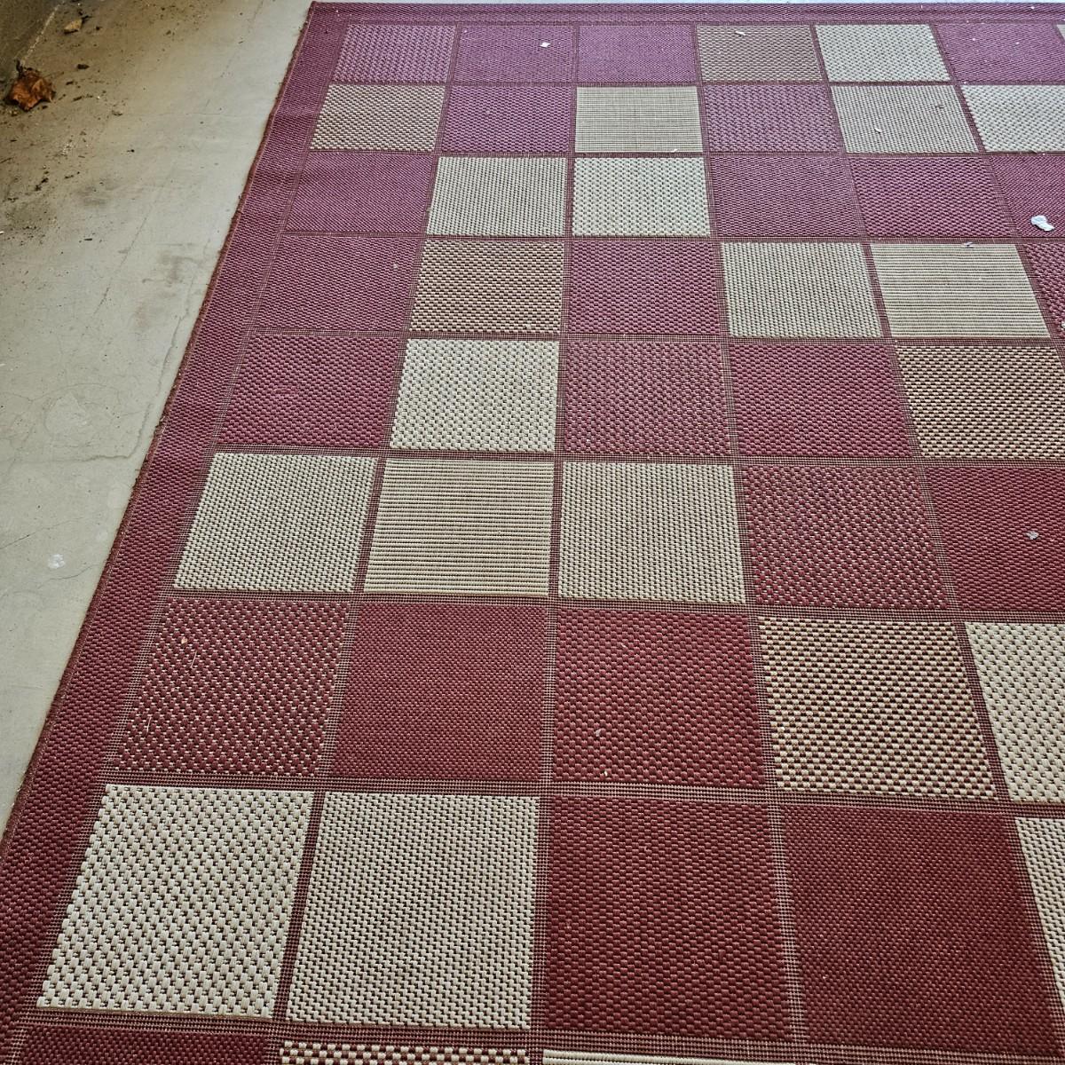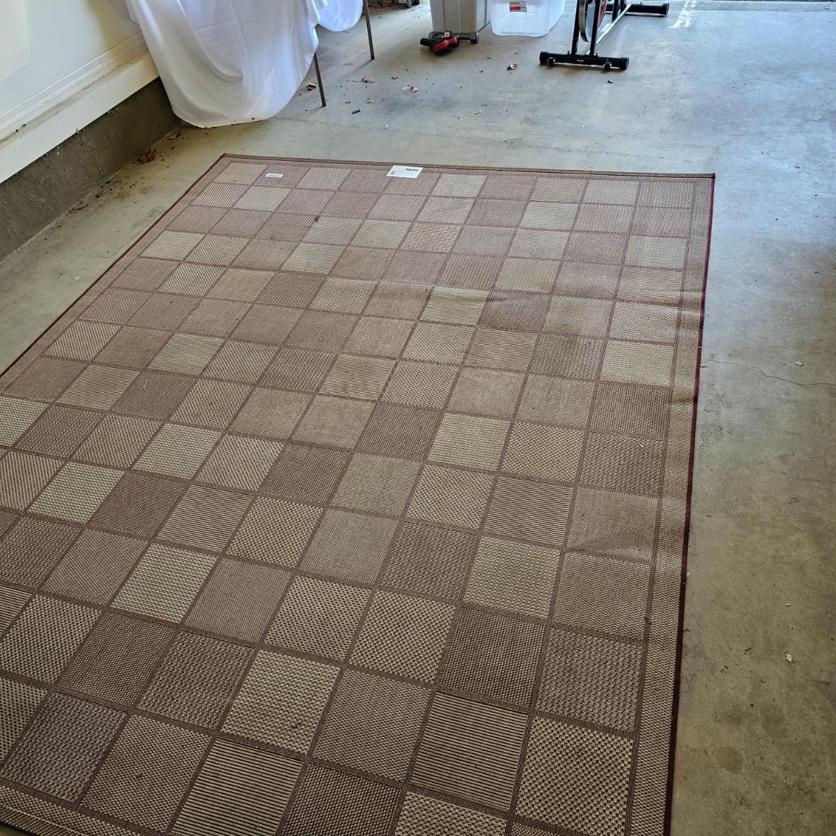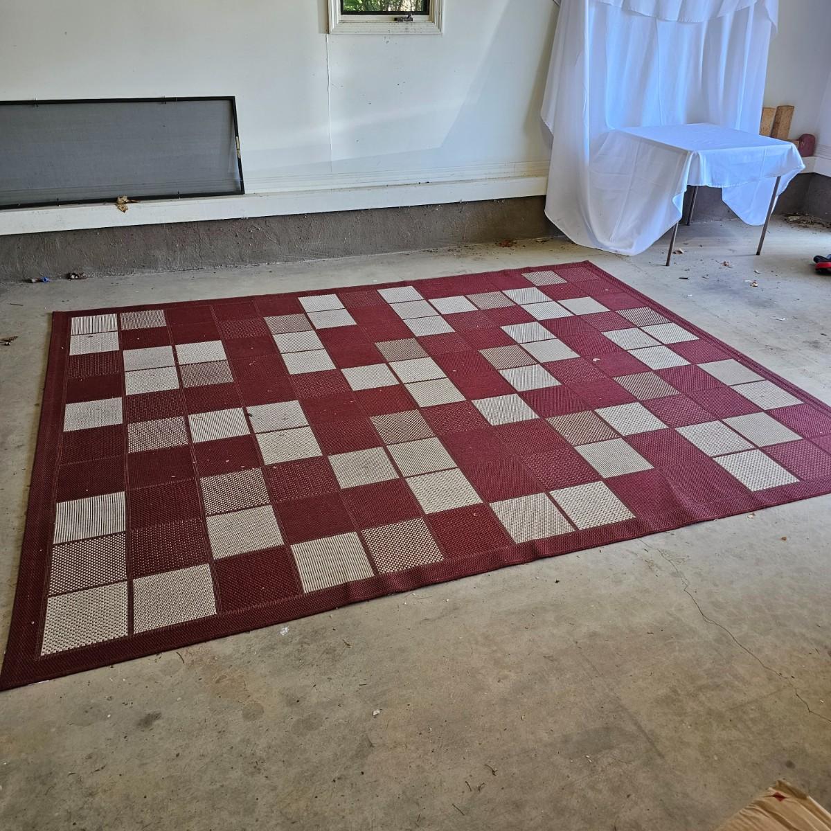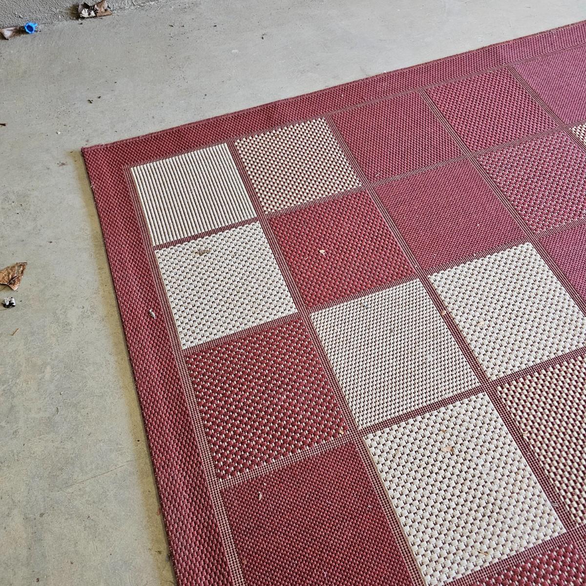 Red and tan squares and border patterns on this 8' x 11' Balta rug. Alternating solid/pattern squares. 100% Olefin fiber. Rug has been used in a garage and needs cleaning. See photos for details. Local pickup only.