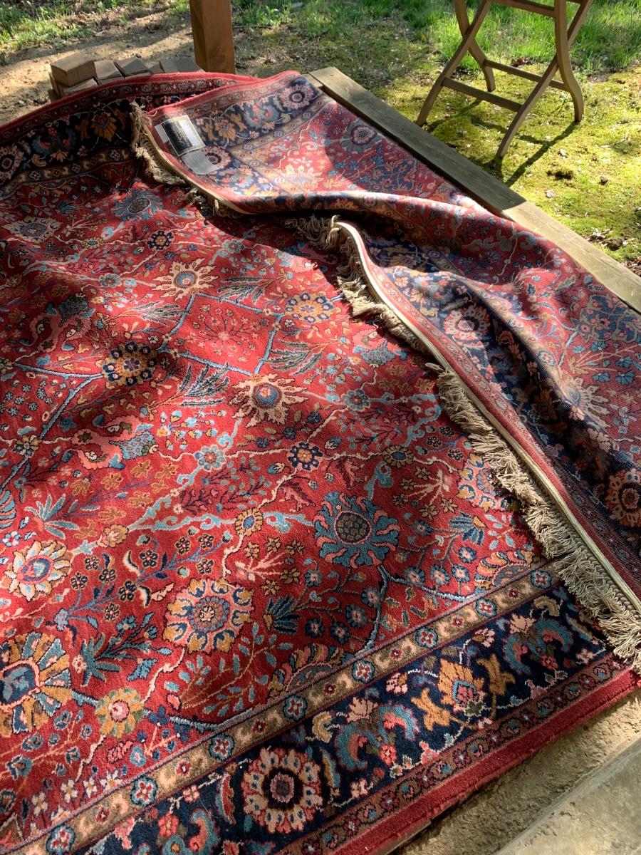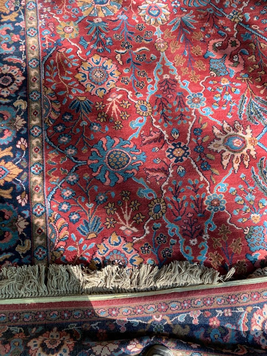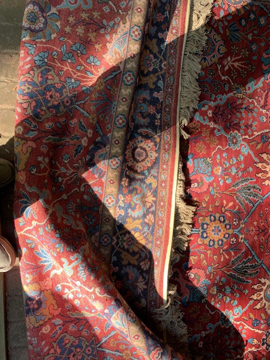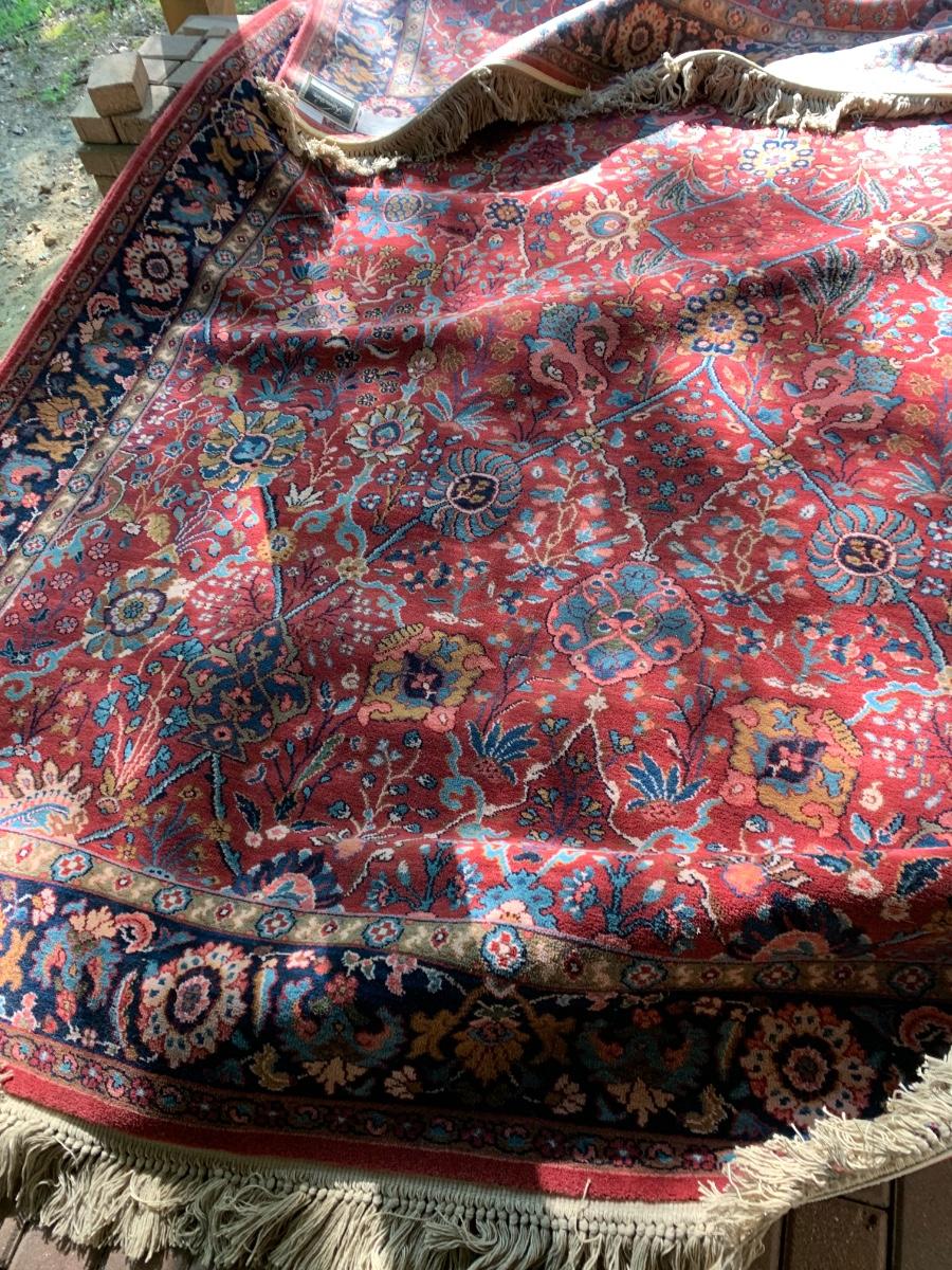 Just one of MANY Oriental Rugs we have in this wonderful estate. This rug was rolled up in the basement many years so was taken to the back patio for more light to photograph. Sorry about the shade / sun but the yard has many trees. These rugs are nice quality but we would recommend a professional cleaning since they have been stored in a rolled state downstairs for years. See ALL photos for measurements, patterns and condition. All are being offered with NO RESERVE, NO BUYERS PREMIUMS, NO CREDIT CARD FEES. Buying as is, as found in the estate - see all photos.