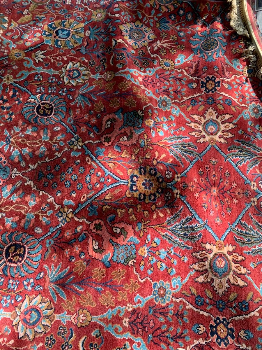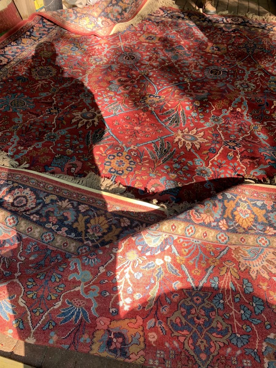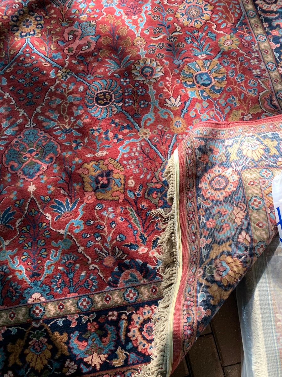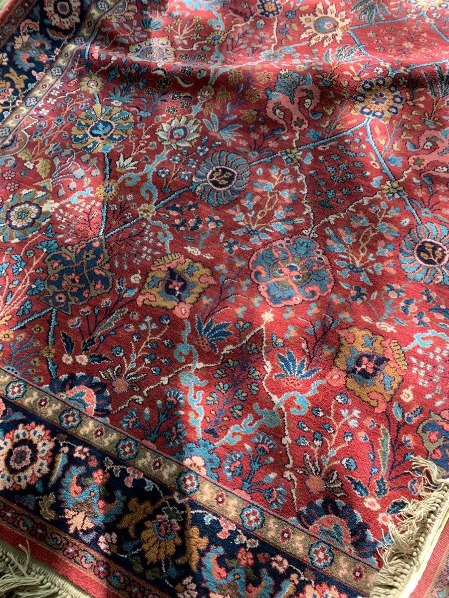Just one of MANY Oriental Rugs we have in this wonderful estate. This rug was rolled up in the basement many years so was taken to the back patio for more light to photograph. Sorry about the shade / sun but the yard has many trees. These rugs are nice quality but we would recommend a professional cleaning since they have been stored in a rolled state downstairs for years. See ALL photos for measurements, patterns and condition. All are being offered with NO RESERVE, NO BUYERS PREMIUMS, NO CREDIT CARD FEES. Buying as is, as found in the estate - see all photos.