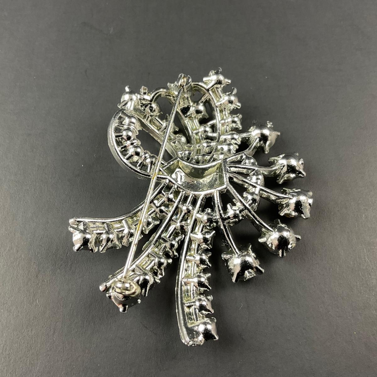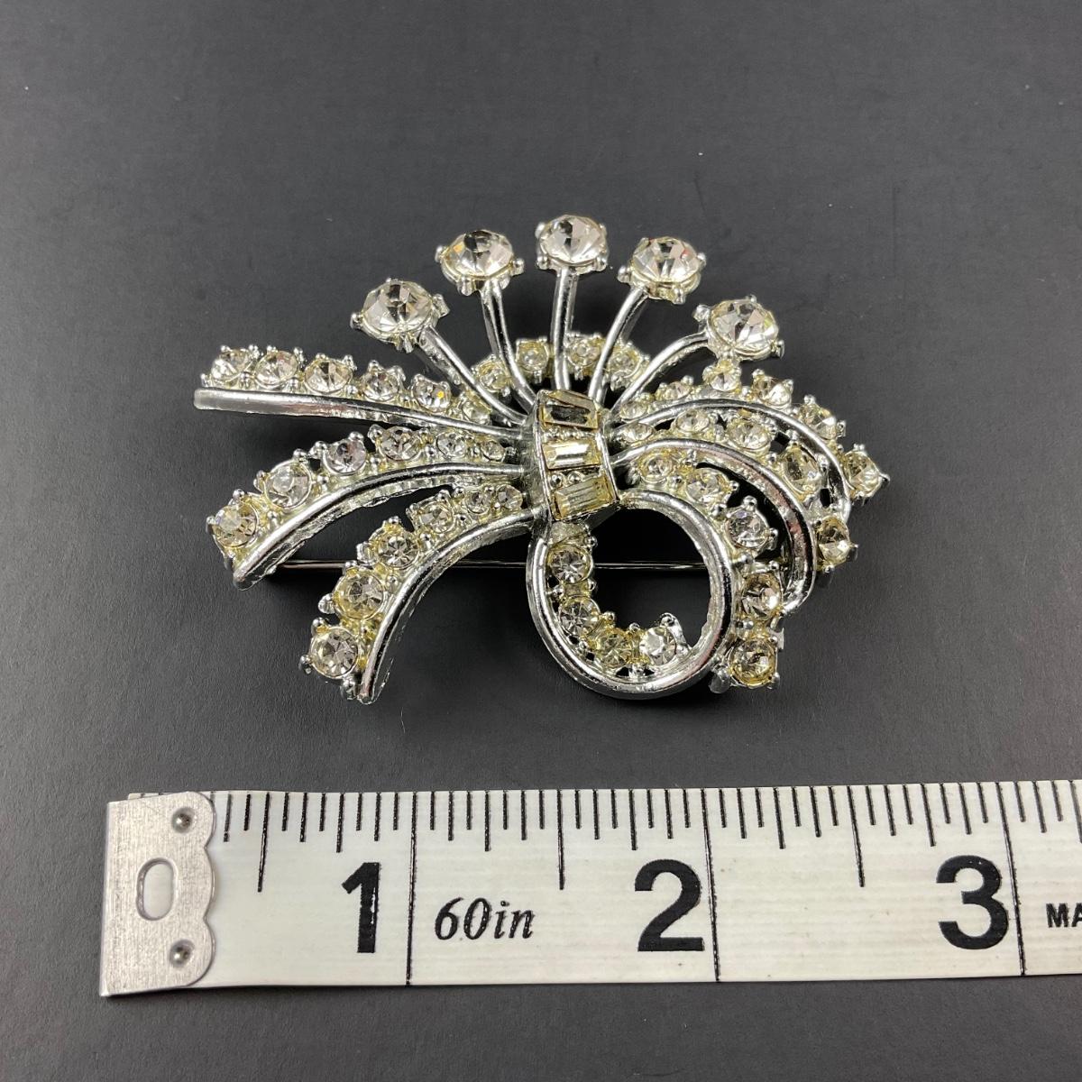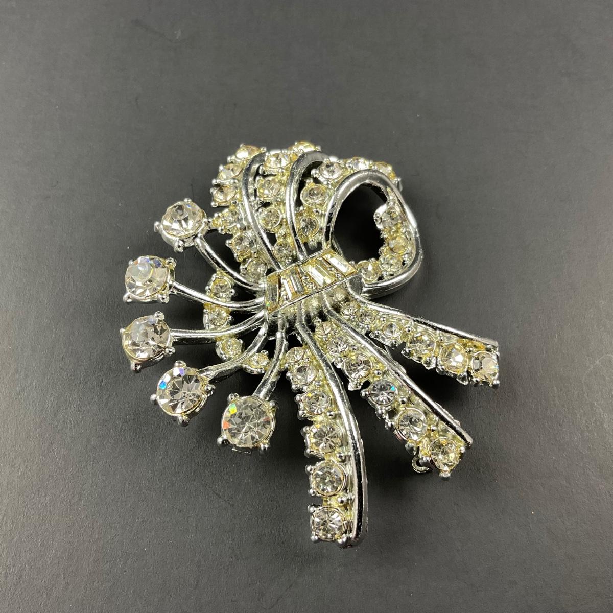 Three pieces of rhinestone pins, unmarked. Please see photos for details and condition. Any condition statement is given as a courtesy to a client, is an opinion, and should not be treated as a statement of fact. Reference to condition written, oral or within a condition report shall not be regarded as a full account of condition and may not include all defects, alterations, or restorations. Absence of a condition report does not imply a lot is flawless or lacking imperfections or damage. Katherine’s Auction & Appraisal Service shall have no responsibility for any error or omission. Returns shall not be accepted on the basis of condition. ::: Shipping is available on this lot. If you require shipping you must let us know at the close of the auction. We will coordinate with you after the item has been won. Shipping fees will include insurance up to or exceeding the value of all items being mailed. If you have any questions regarding this lot please contact the auctioneer either via this website, by direct email or by phone. PICK UP TIMES and other important information can be found in the TERMS and DESCRIPTION of the auction. Please take a look for pertinent information. Thanks!