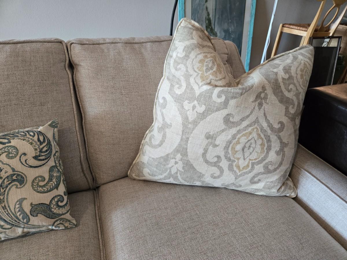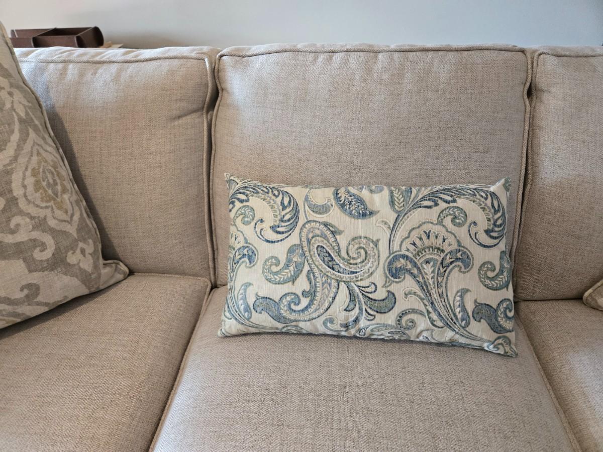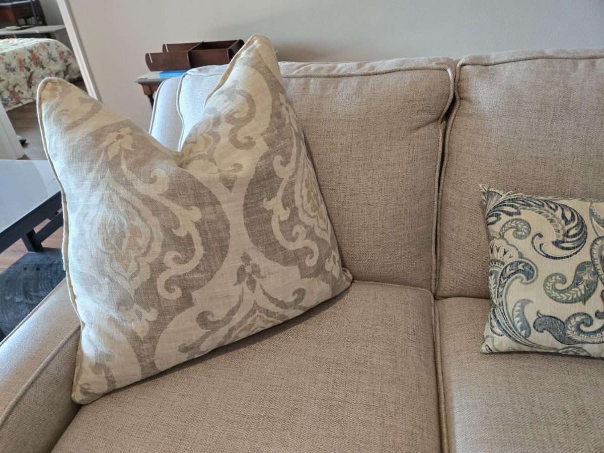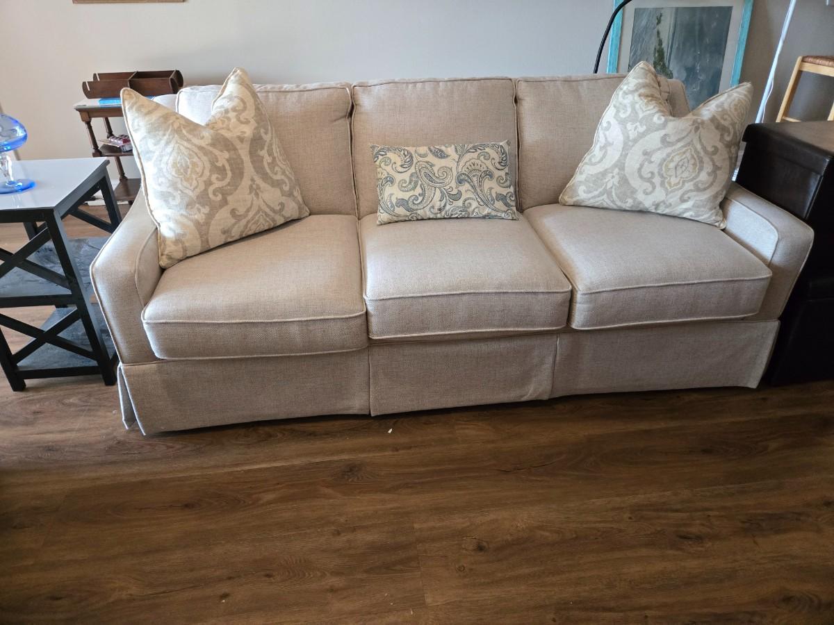 In like new condition. Very clean. 80" Cream sofa with 3 pillows as shown