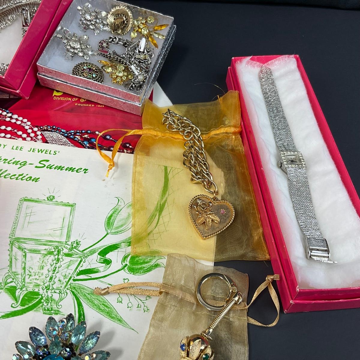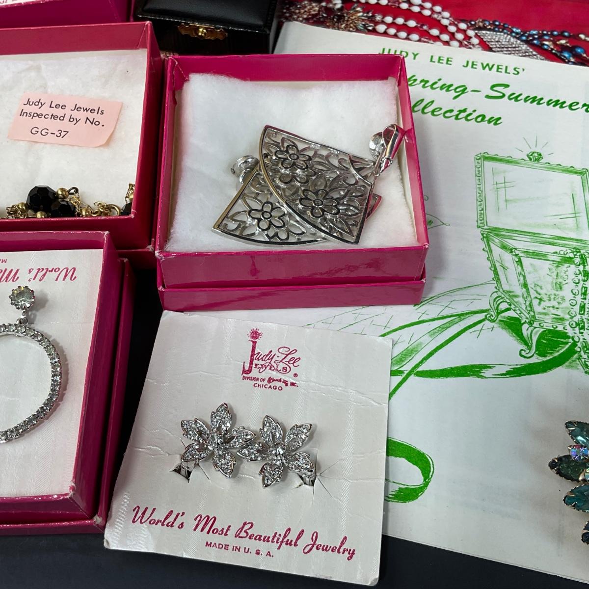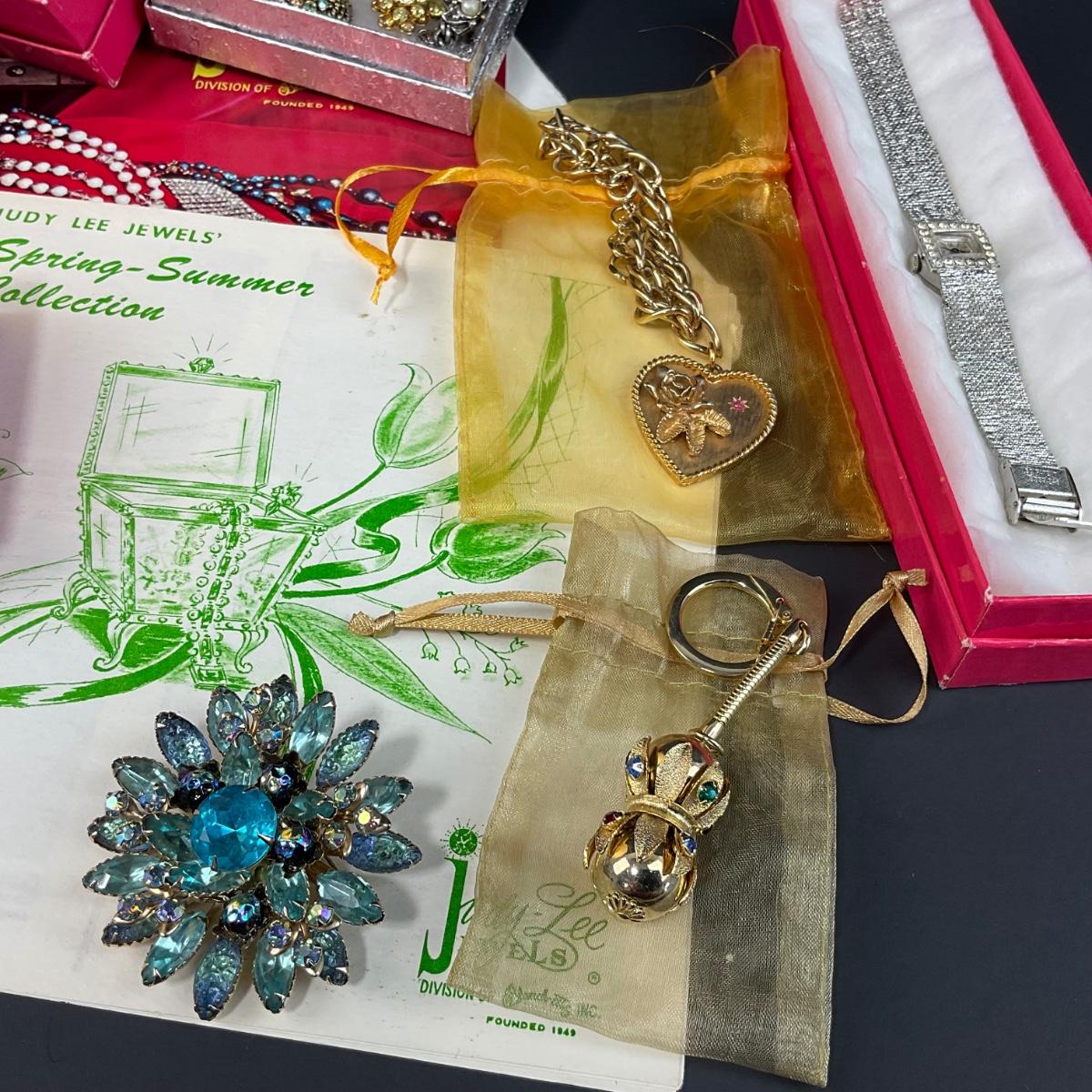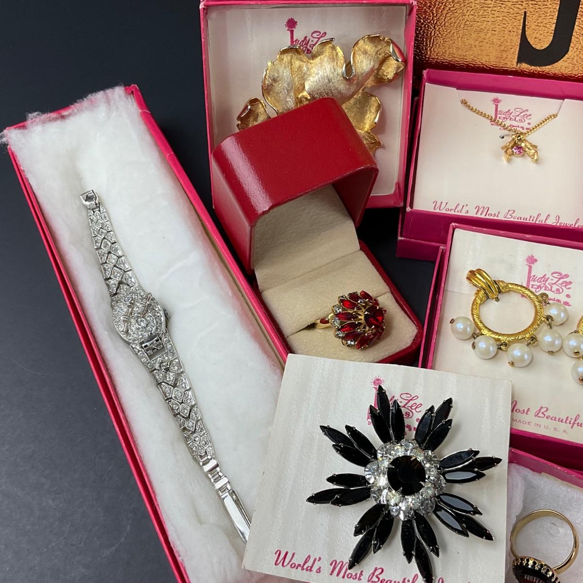 One assorted lot of Judy Lee and then some jewelry and gold travel case. Some of the pieces included with this lot are party time necklace, star of India brooch,, jealous heart necklace, teal brooch, clip earrings sets, heart bracelet, two catalogs, two watches, a key chain and so much more. Please see photos for details and condition. Any condition statement is given as a courtesy to a client, is an opinion, and should not be treated as a statement of fact. Reference to condition written, oral or within a condition report shall not be regarded as a full account of condition and may not include all defects, alterations, or restorations. Absence of a condition report does not imply a lot is flawless or lacking imperfections or damage. Katherine’s Auction & Appraisal Service shall have no responsibility for any error or omission. Returns shall not be accepted on the basis of condition. ::: Shipping is available on this lot. If you require shipping you must let us know at the close of the auction. We will coordinate with you after the item has been won. Shipping fees will include insurance up to or exceeding the value of all items being mailed. If you have any questions regarding this lot please contact the auctioneer either via this website, by direct email or by phone. PICK UP TIMES and other important information can be found in the TERMS and DESCRIPTION of the auction. Please take a look for pertinent information. Thanks!