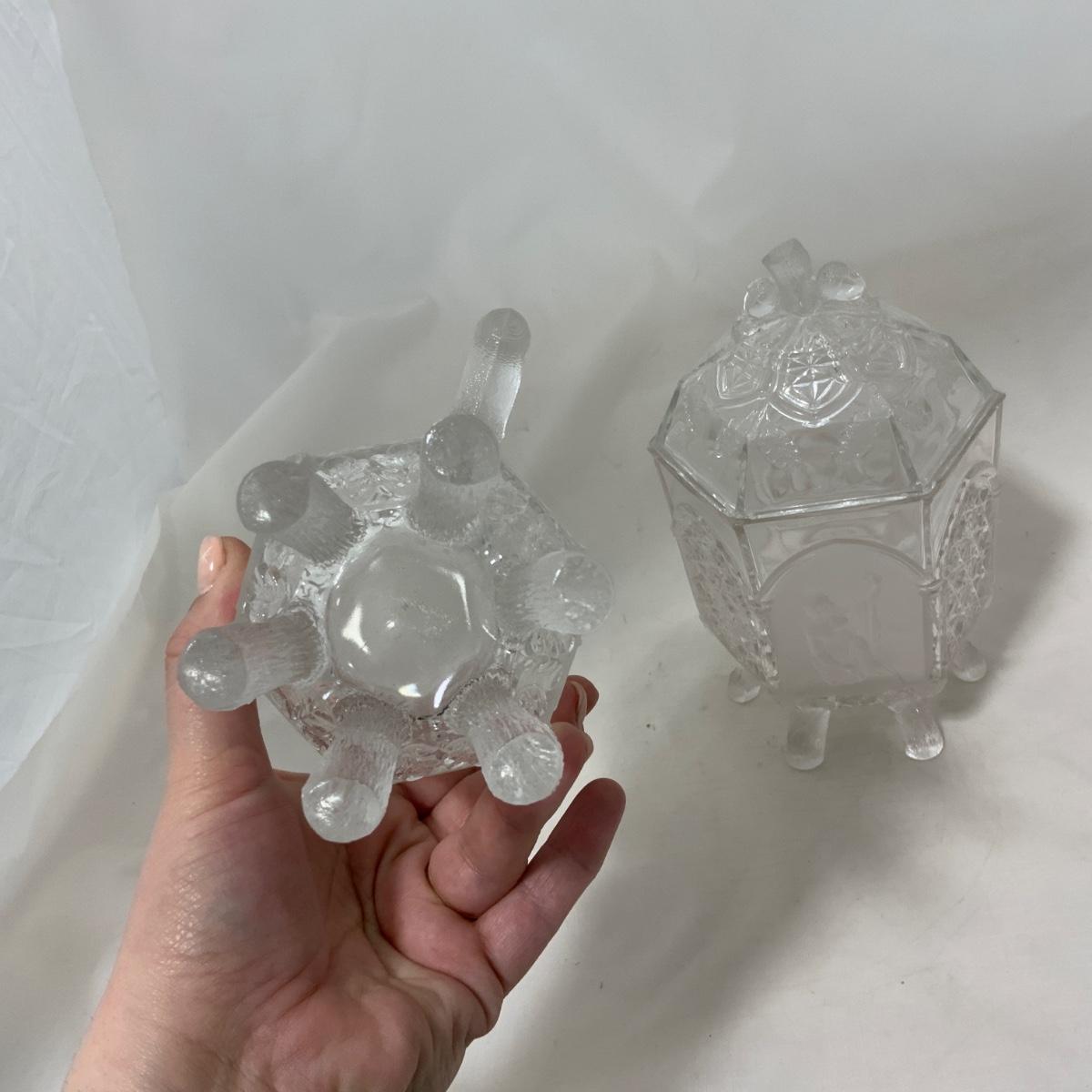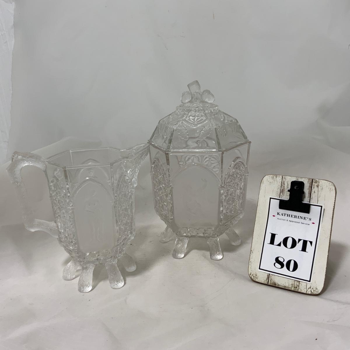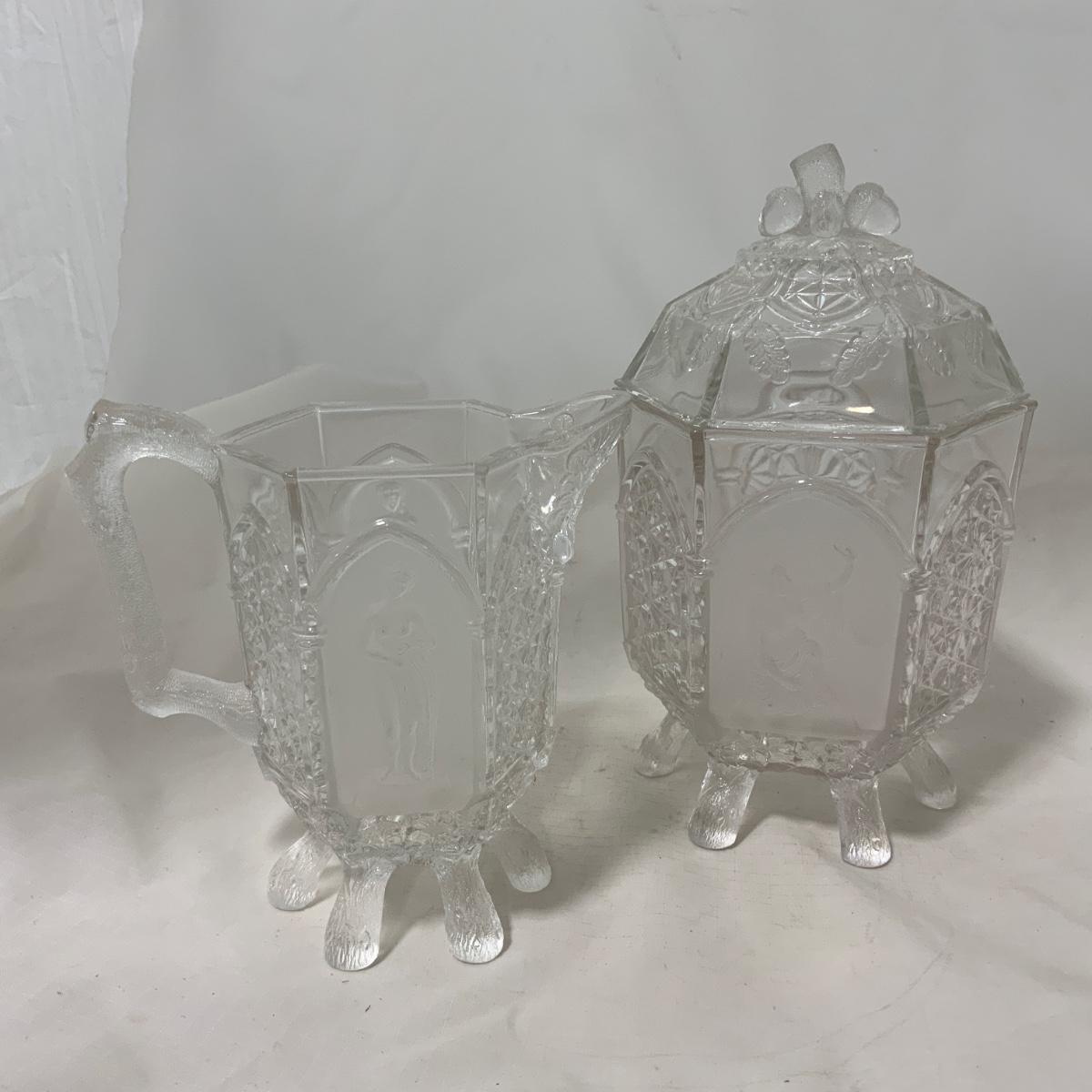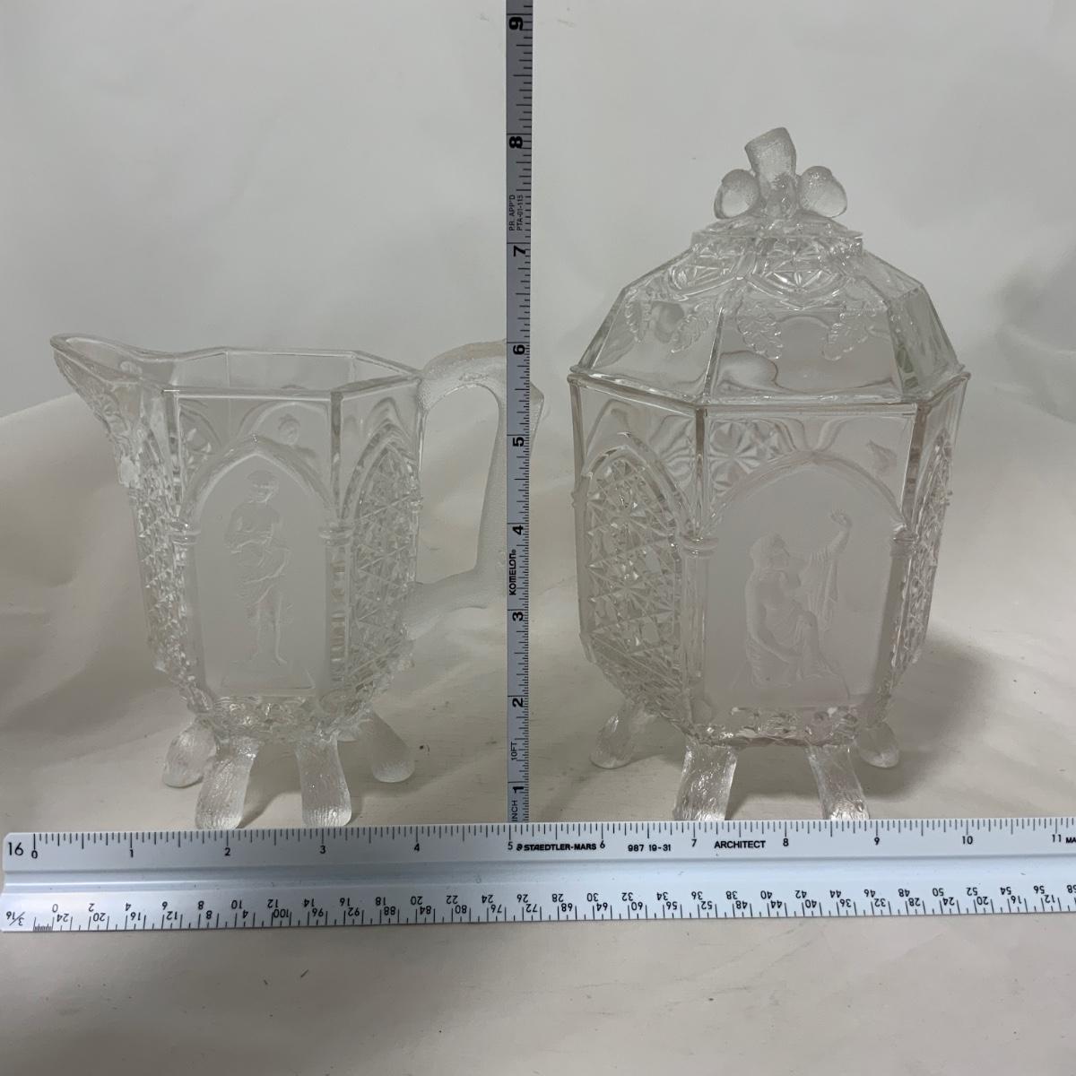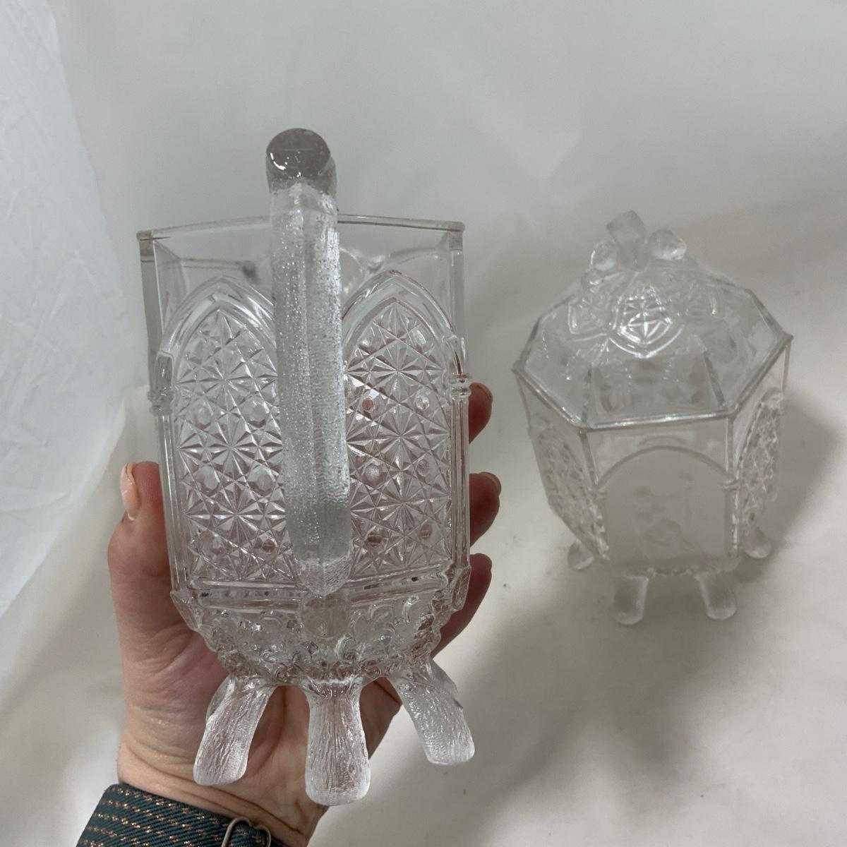 Rare Find Alert! Gothic Pressed Glass Creamer and Sugar. Large size too! You could use these pieces for almost anything, truly! The design on them is really unique - check out the photos. Both pieces are in exceptional condition with no chips or cracks that I could find. Please see photos for details and condition. ::: Shipping is available on this lot. If you require shipping you must let us know at the close of the auction. We will coordinate with you after the item has been won. Shipping fees will include insurance up to or exceeding the value of all items being mailed. If you have any questions regarding this lot please contact the auctioneer either via this website, by direct email or by phone. PICK UP TIMES and other important information can be found in the TERMS and DESCRIPTION of the auction. Please take a look for pertinent information. Thanks!