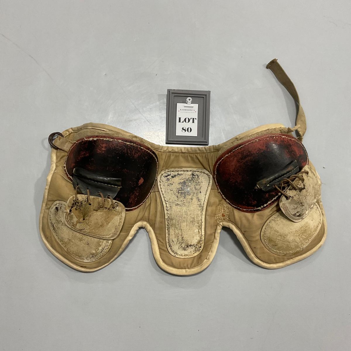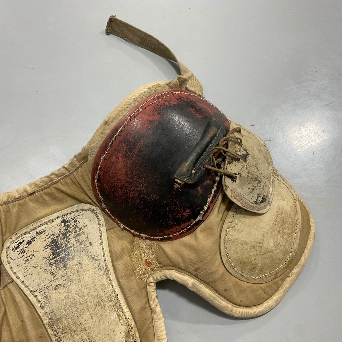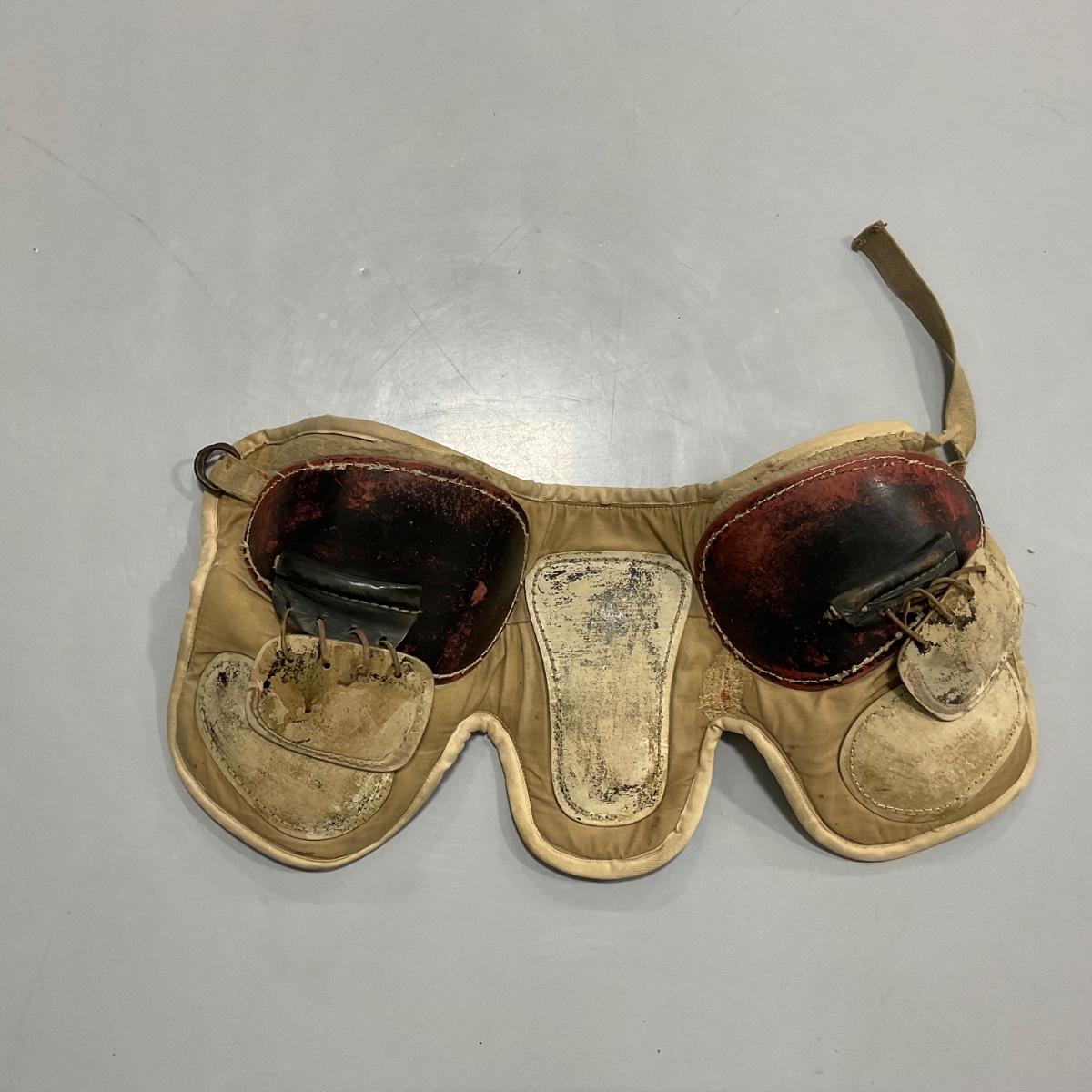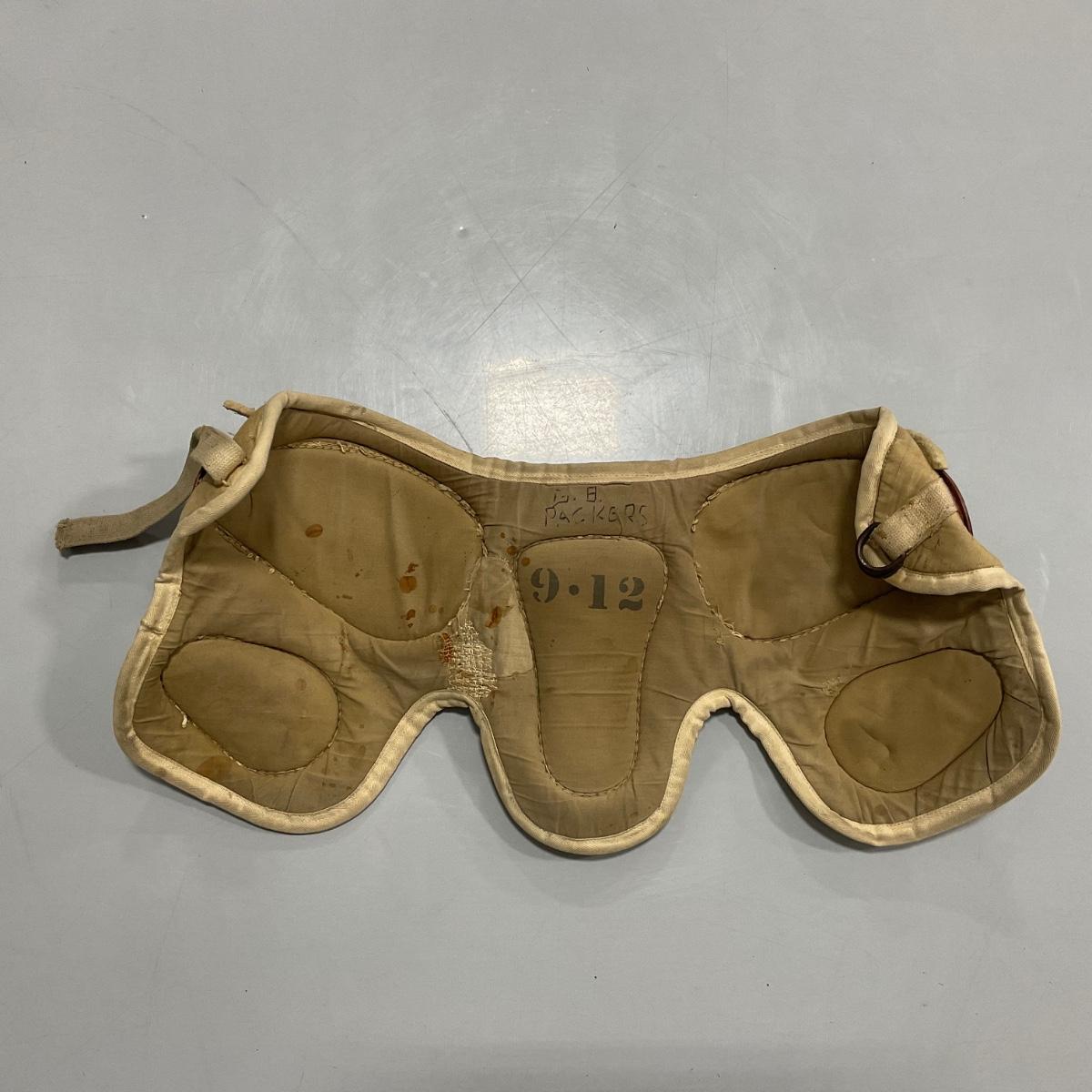 One 1940’s football hip pads, well worn. Please see photos for details and condition. ::: Shipping is available on this lot. If you require shipping you must let us know at the close of the auction. We will coordinate with you after the item has been won. Shipping fees will include insurance up to or exceeding the value of all items being mailed. If you have any questions regarding this lot please contact the auctioneer either via this website, by direct email or by phone. PICK UP TIMES and other important information can be found in the TERMS and DESCRIPTION of the auction. Please take a look for pertinent information. Thanks!
