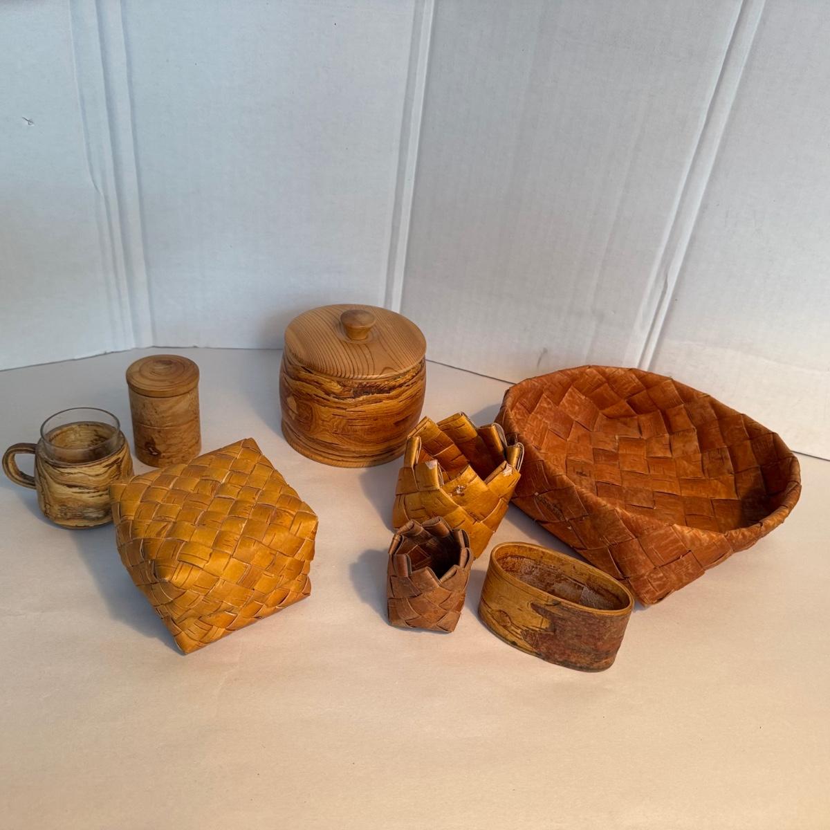 801 Birch Bark Wood Box & Glass Cup with Bark Braided Baskets