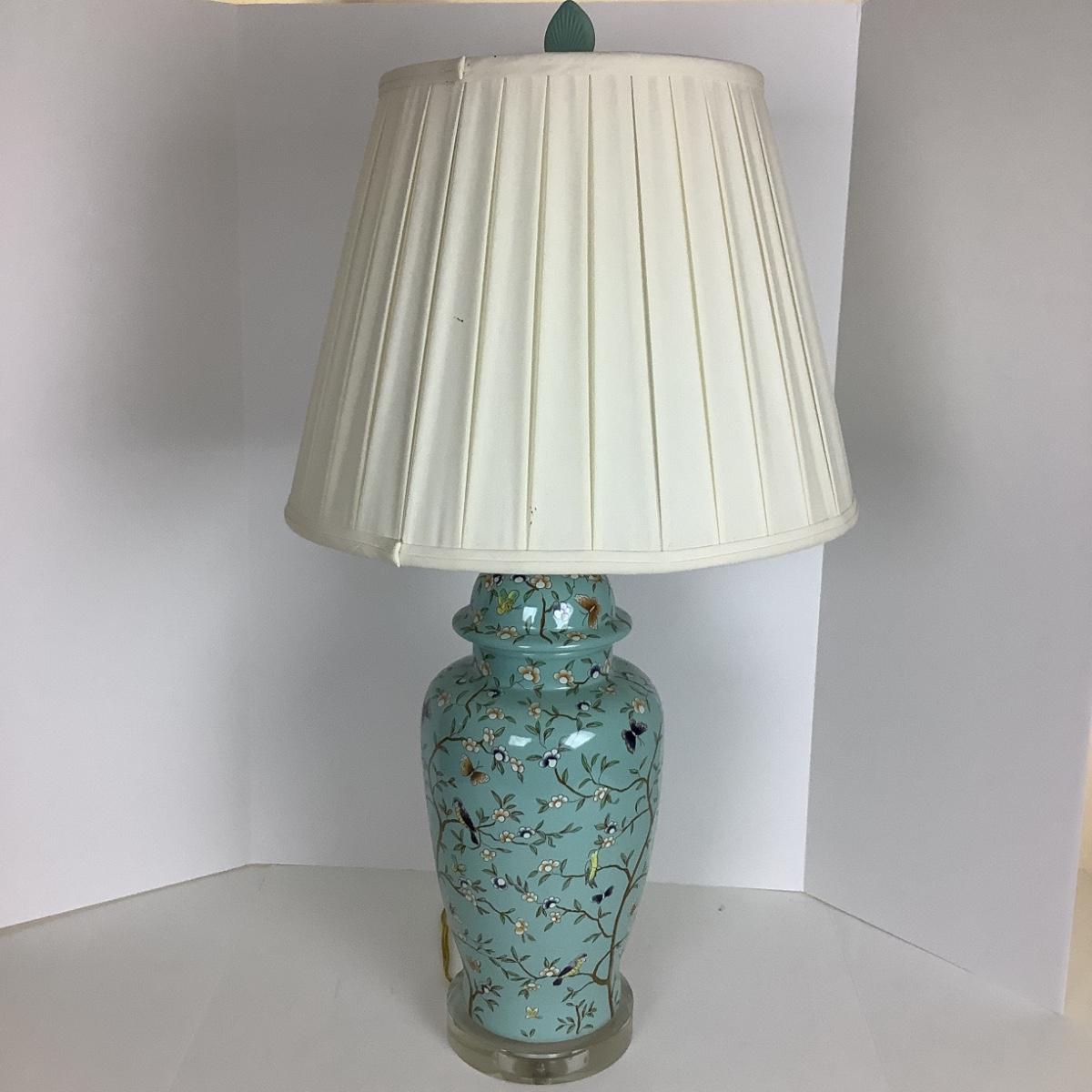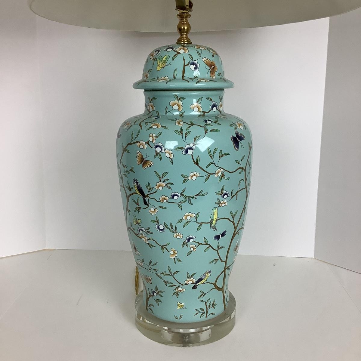 8055 Large Seafoam Green Bird Motif Porcelain 30”  Temple Jar Table Lamp