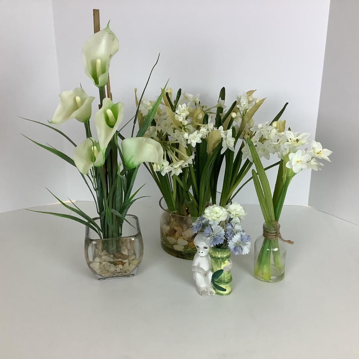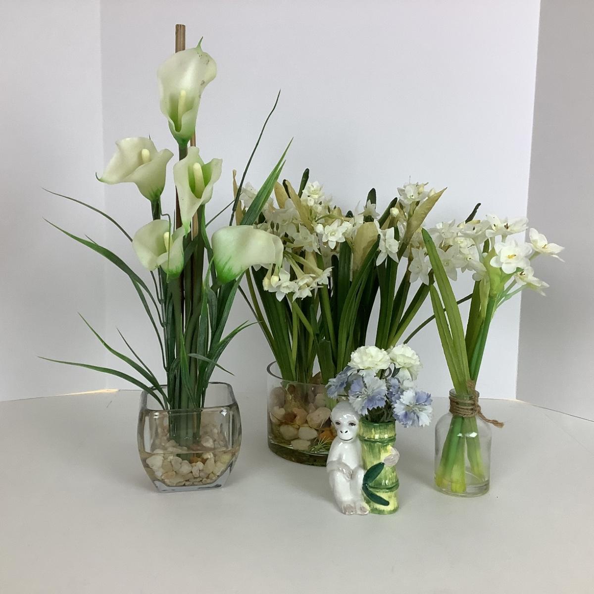 8069 Set of Three Silk Flower Arrangements with Pottery Monkey
