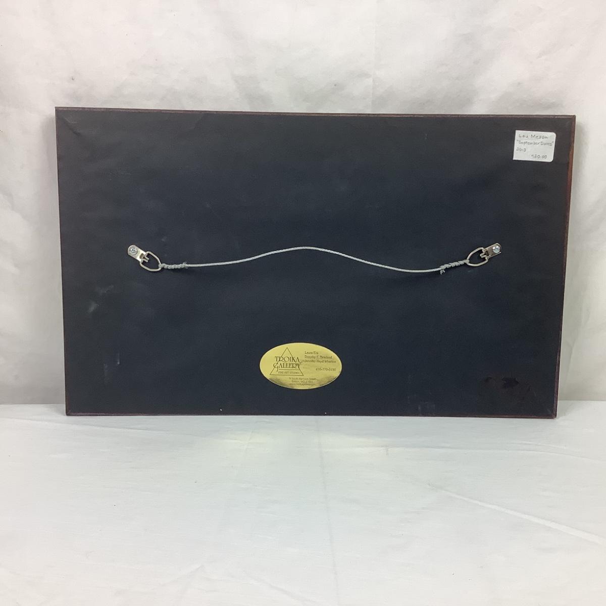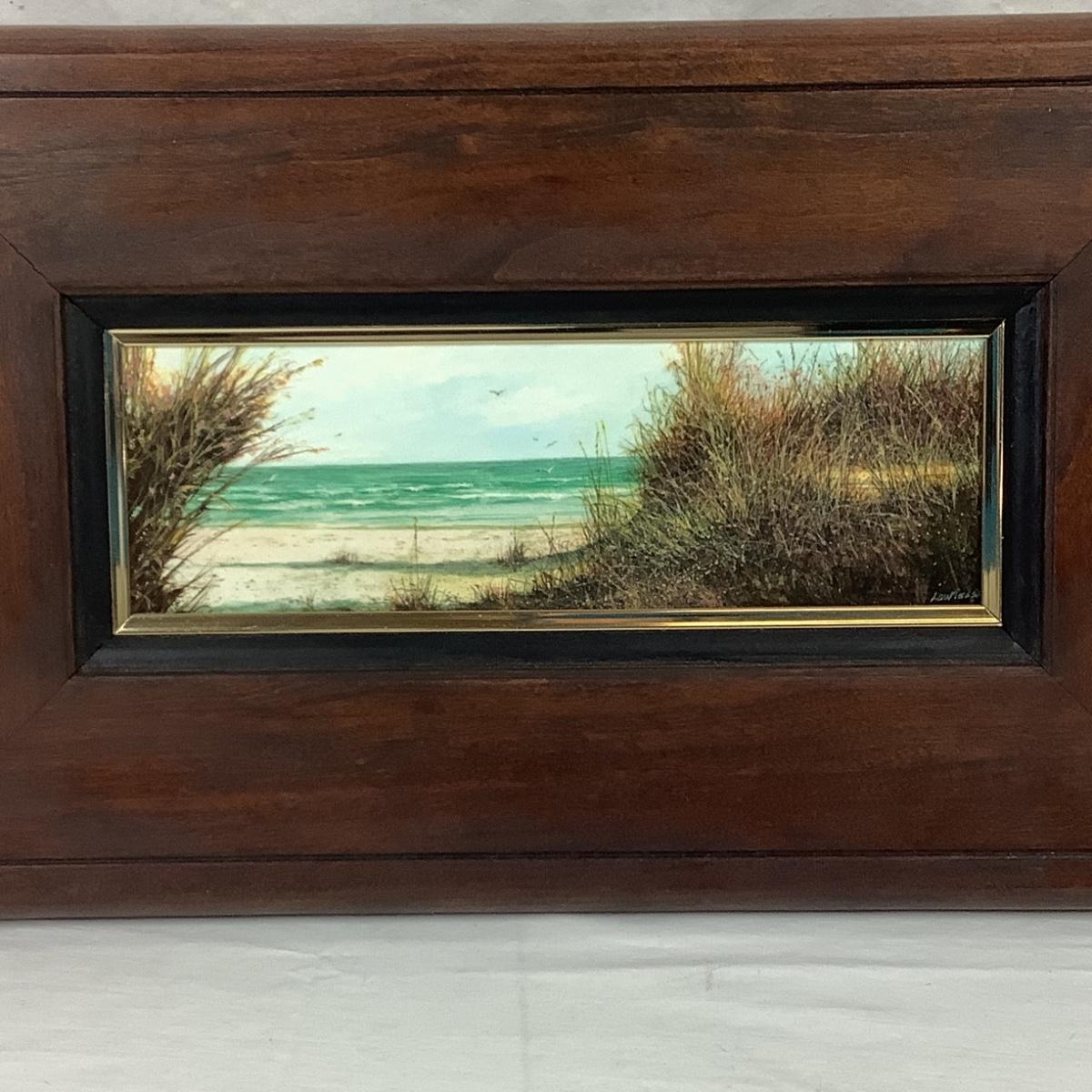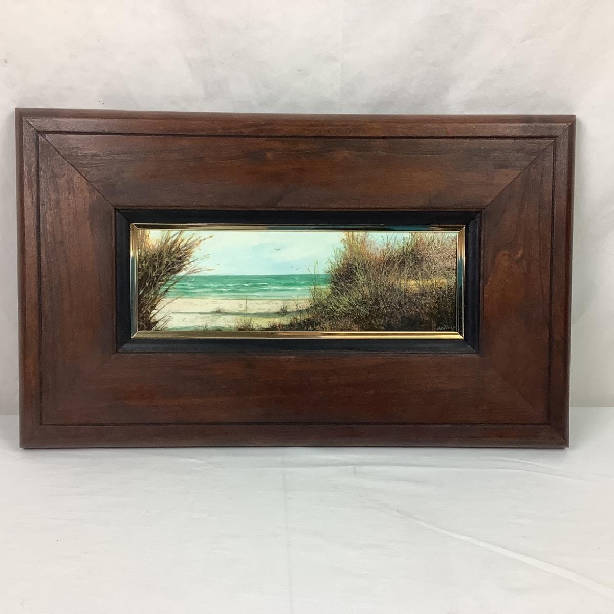 framed in a 3" wide walnut frame measuring 18" x 11"