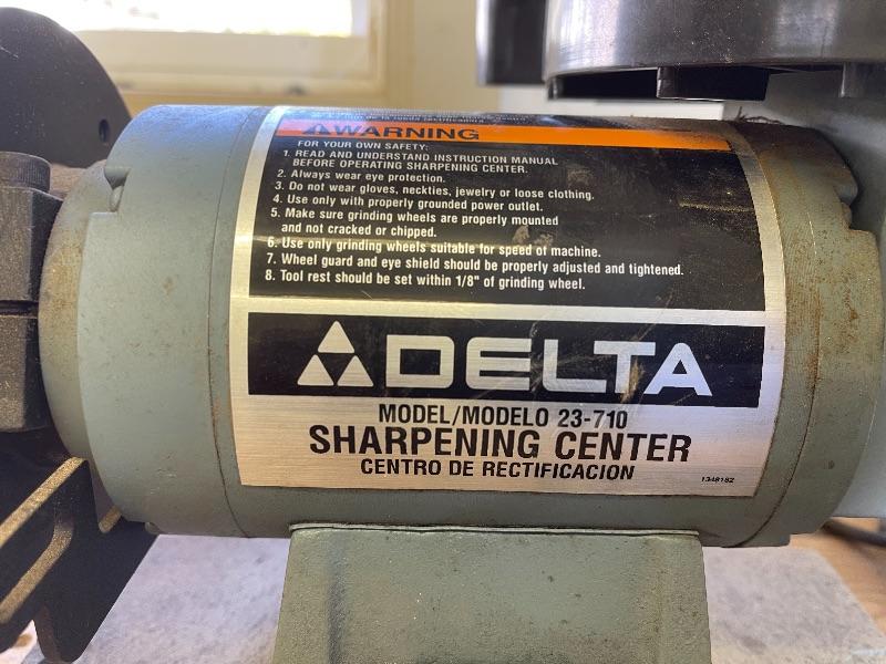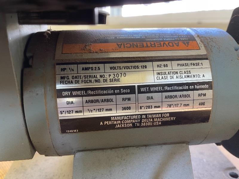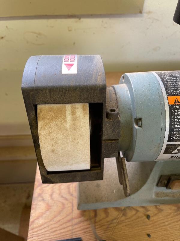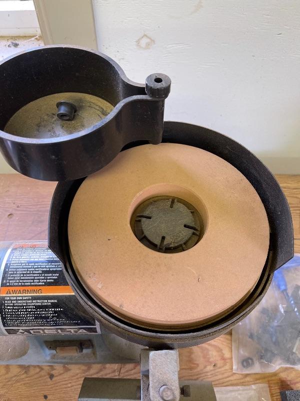 Heavy duty sharpening center. Left vertical stone approx. 5” diameter/horizontal stone approx 8” diameter.