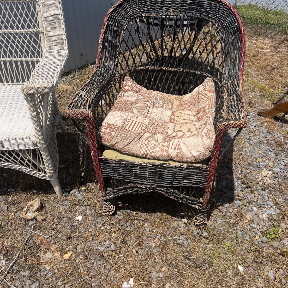 White painted wicker chair, and black and red painted wicker chair with cushion