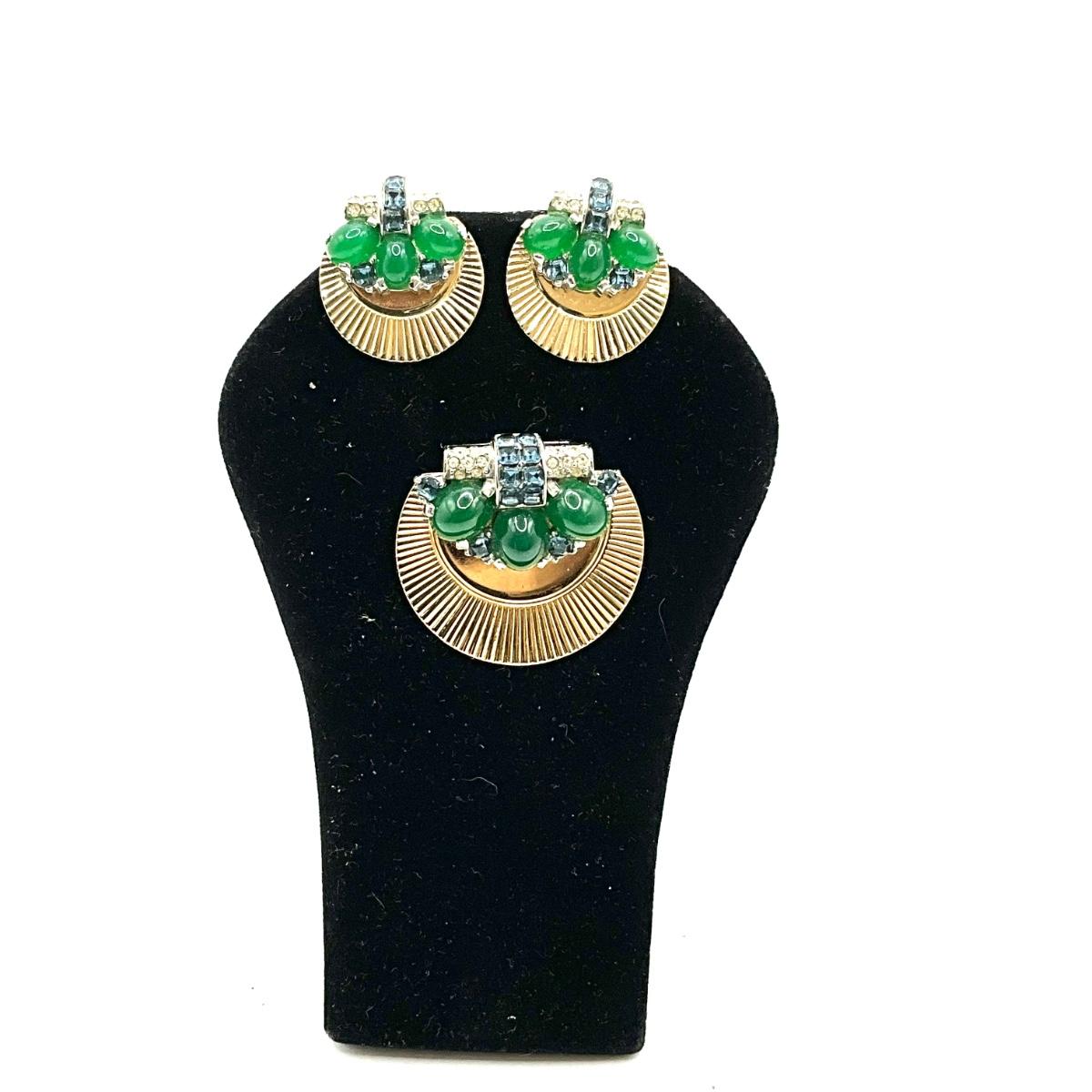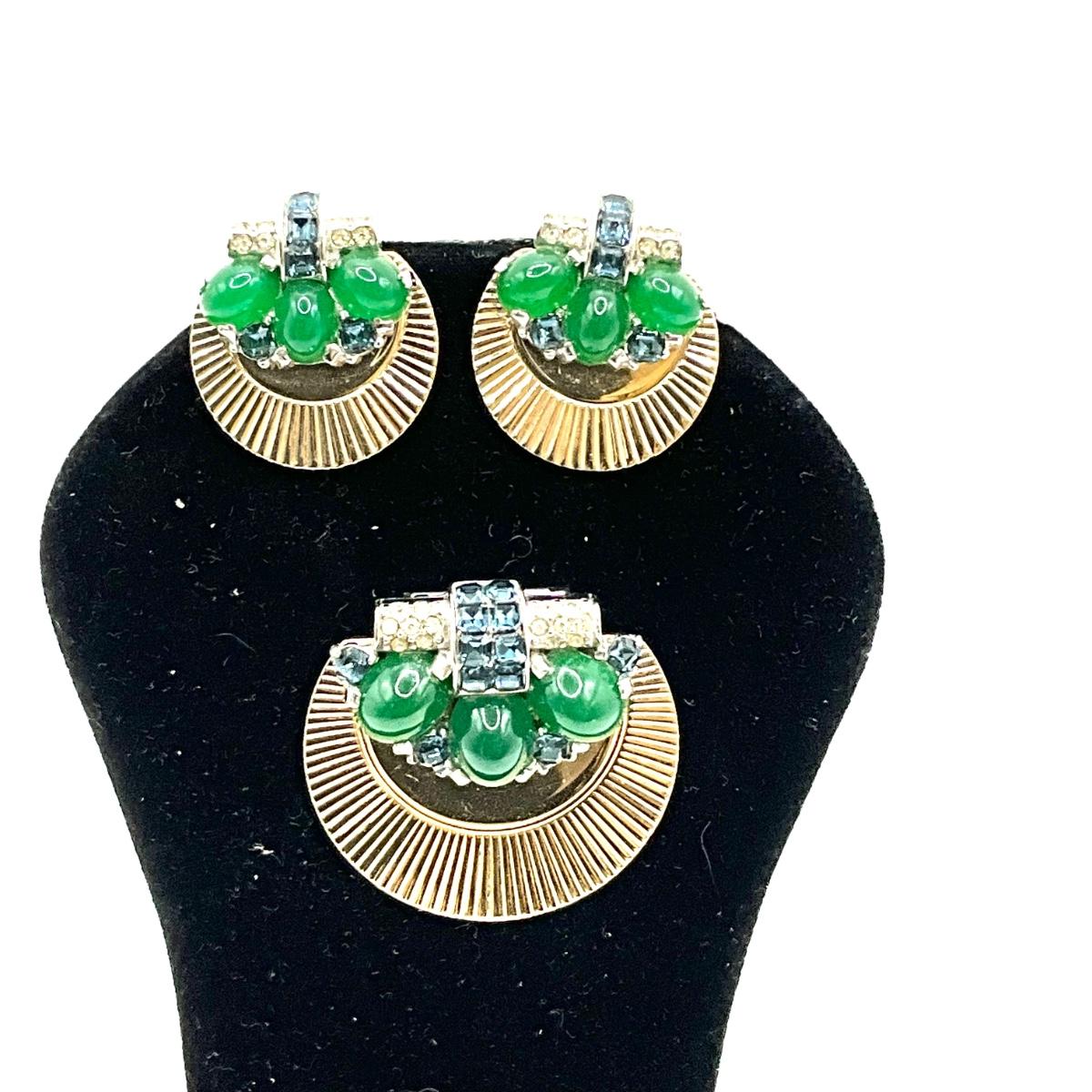 807 Vintage Boucher Costume Earrings & Dress Clip with Green Cabochon