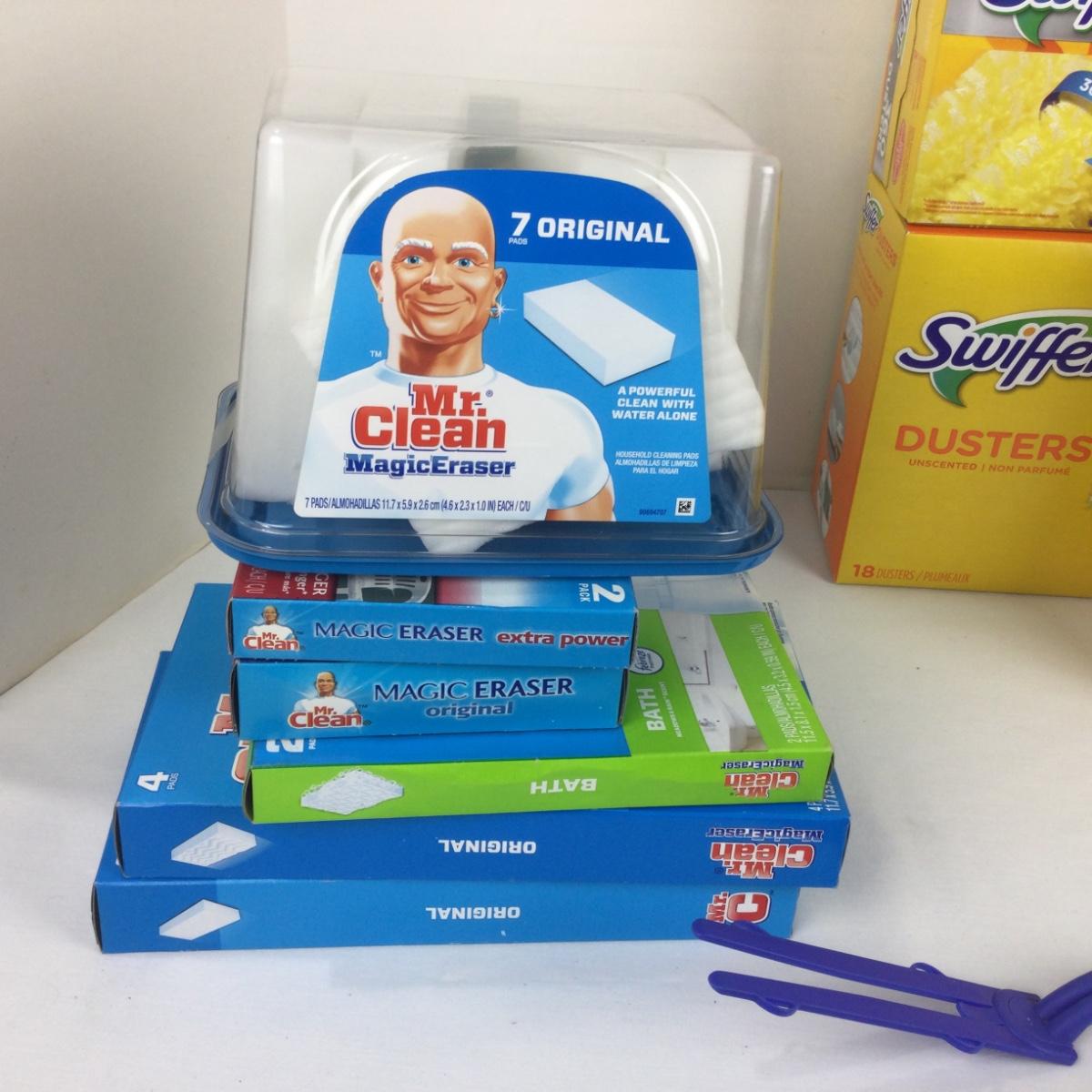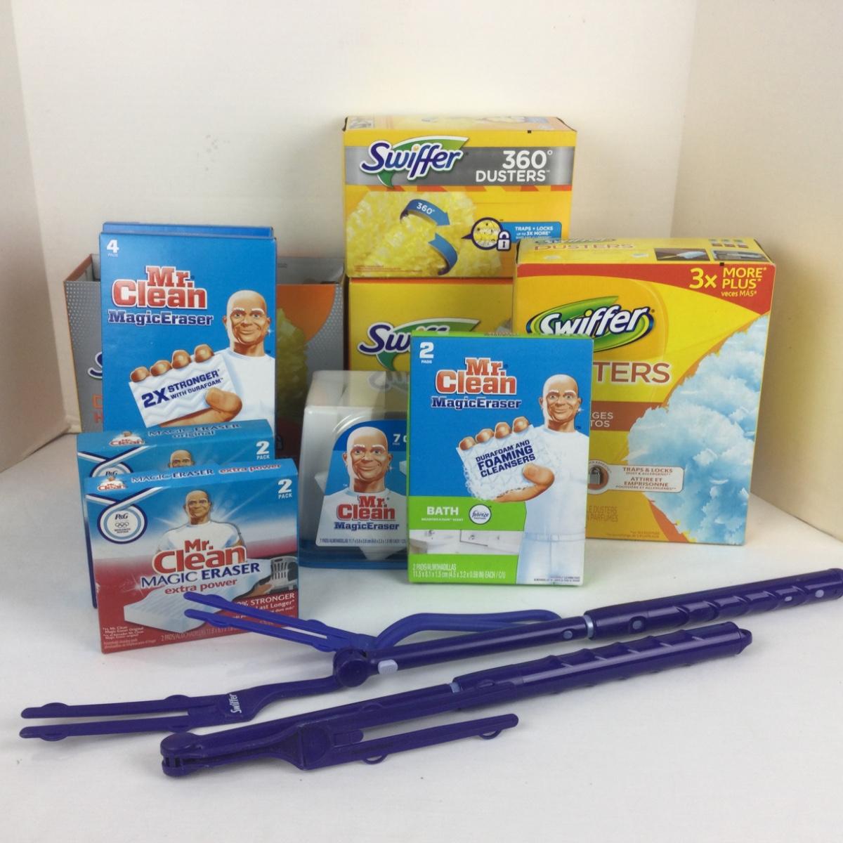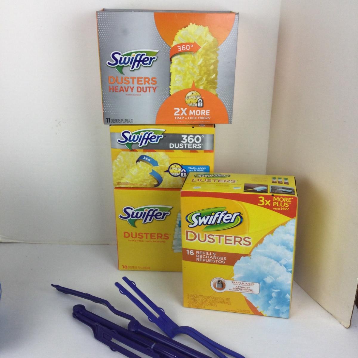 Swiffer hand held dusters with extension arms with several boxes of new duster cloths and one open box. Magic erasers are all brand new boxes with one open container.