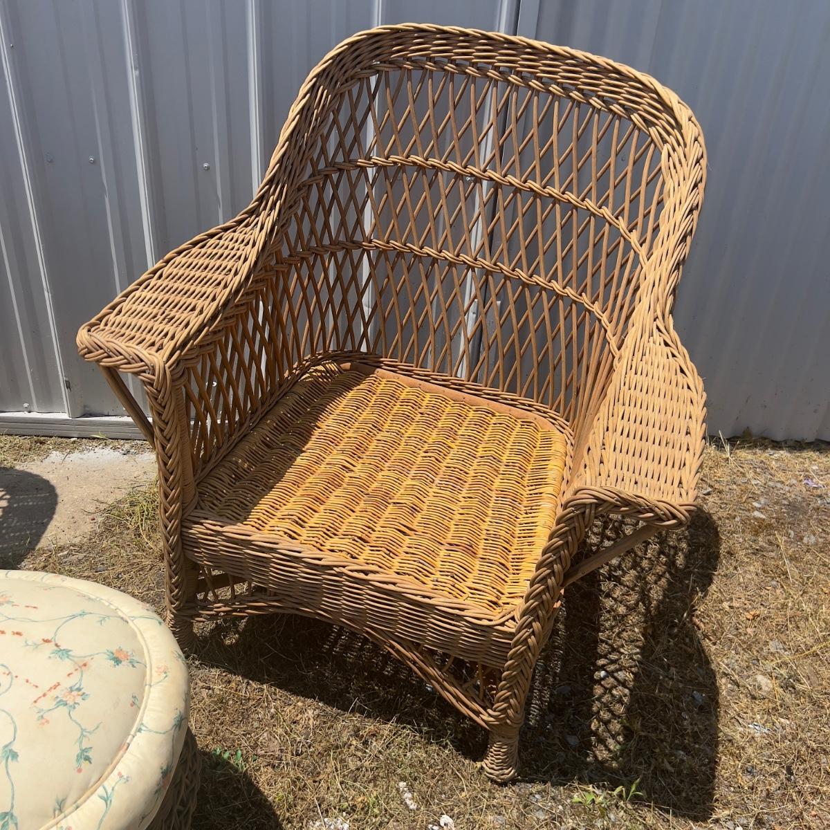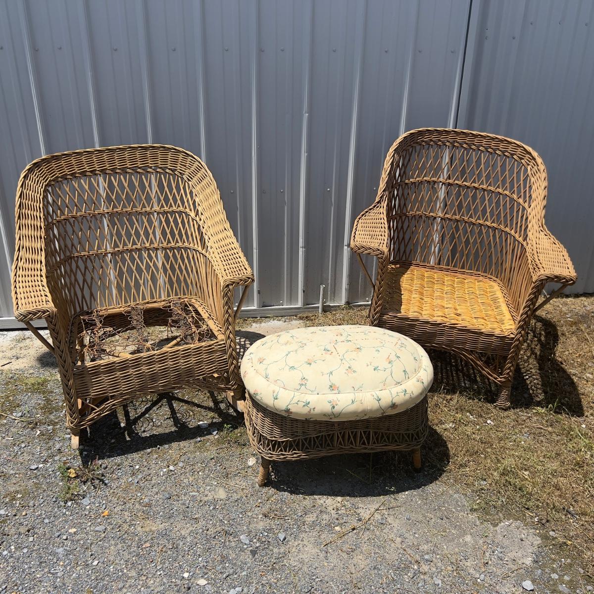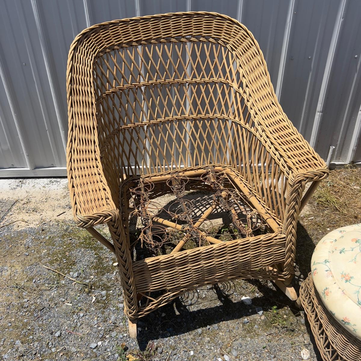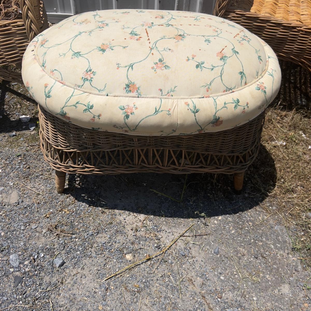 808 Vintage Wicker Rocker and Chair with Upholstered Footstool