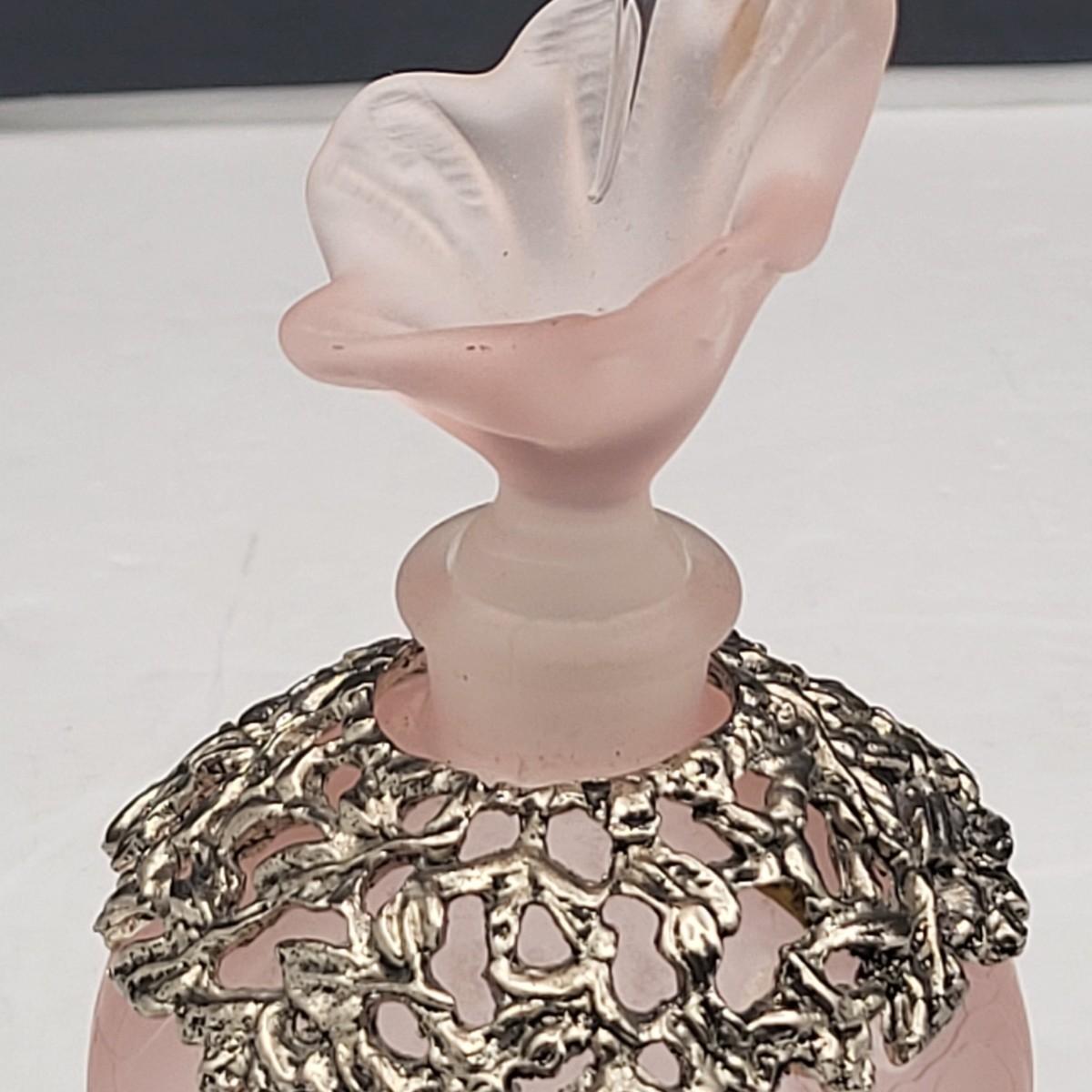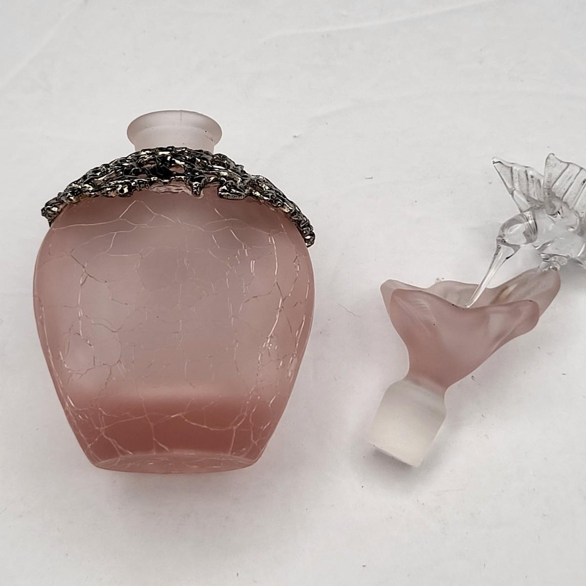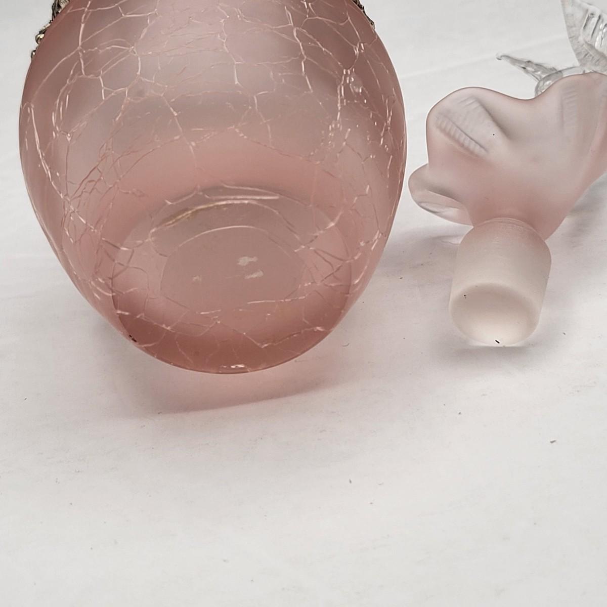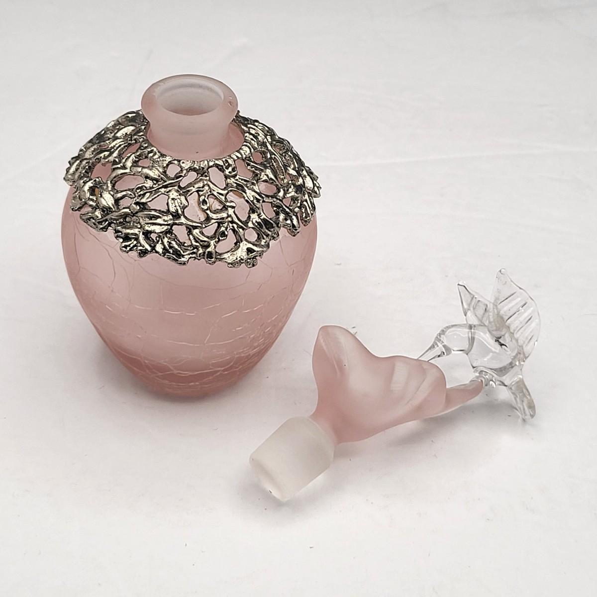 Clear glass Hummingbird on pink frosted glass flower bottle top stopper. Pewter lattice and frosted pink crackle glass bottle, 6.75" tall x 2.75" wide.
