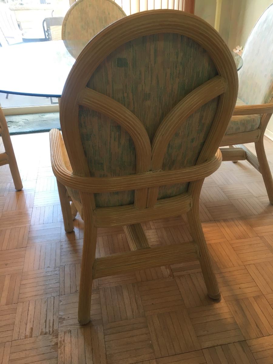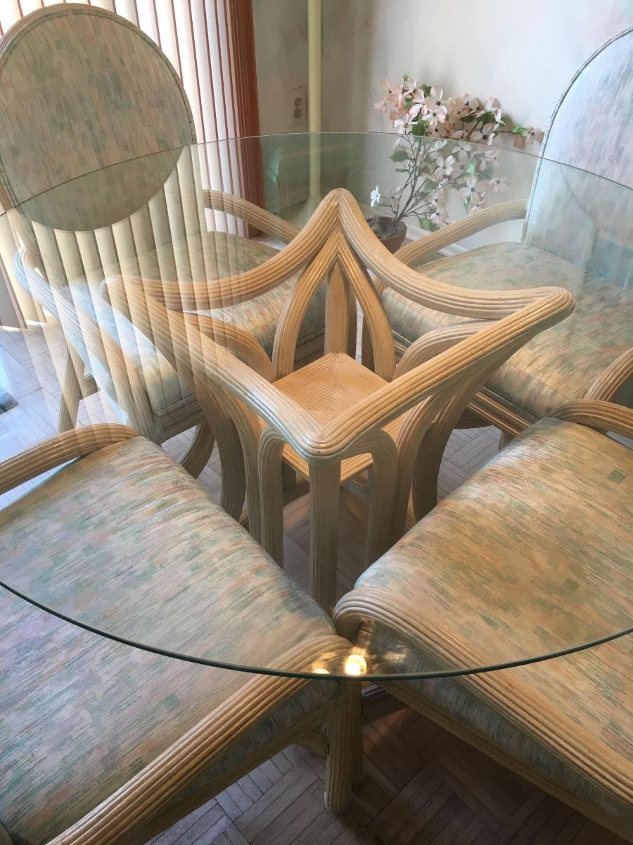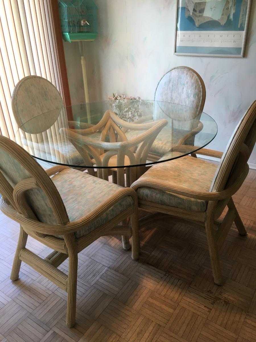 Round glass table with sturdy wood frame base comes with 4 upholstered chairs. Excellent condition