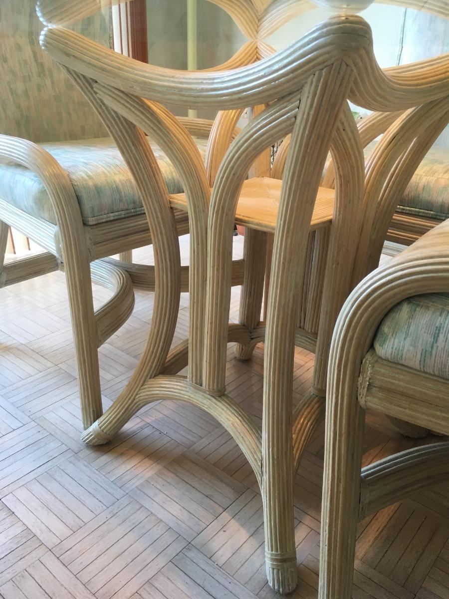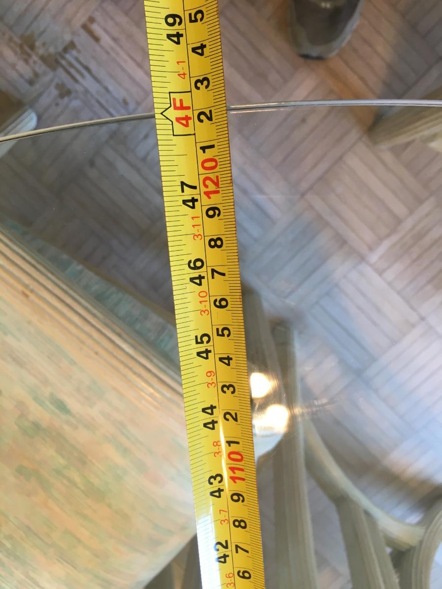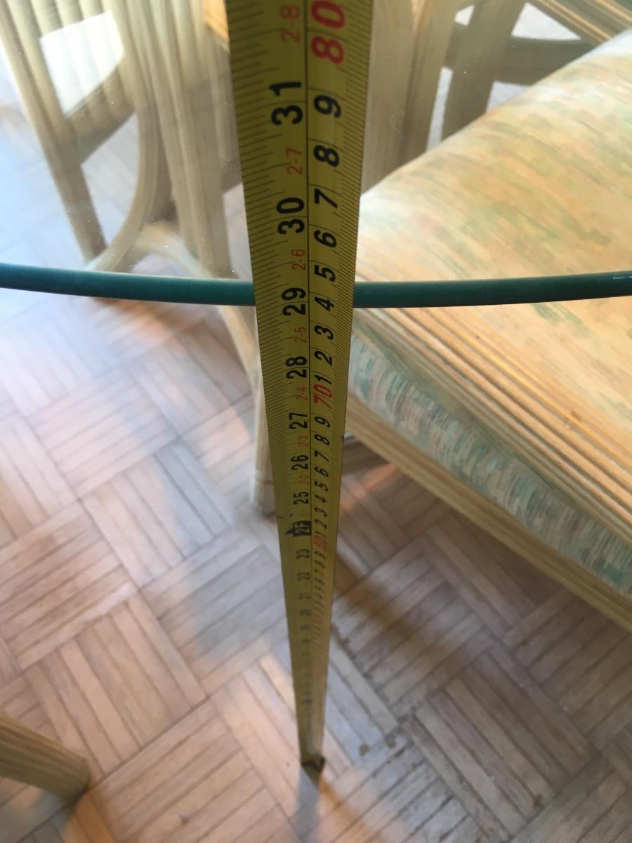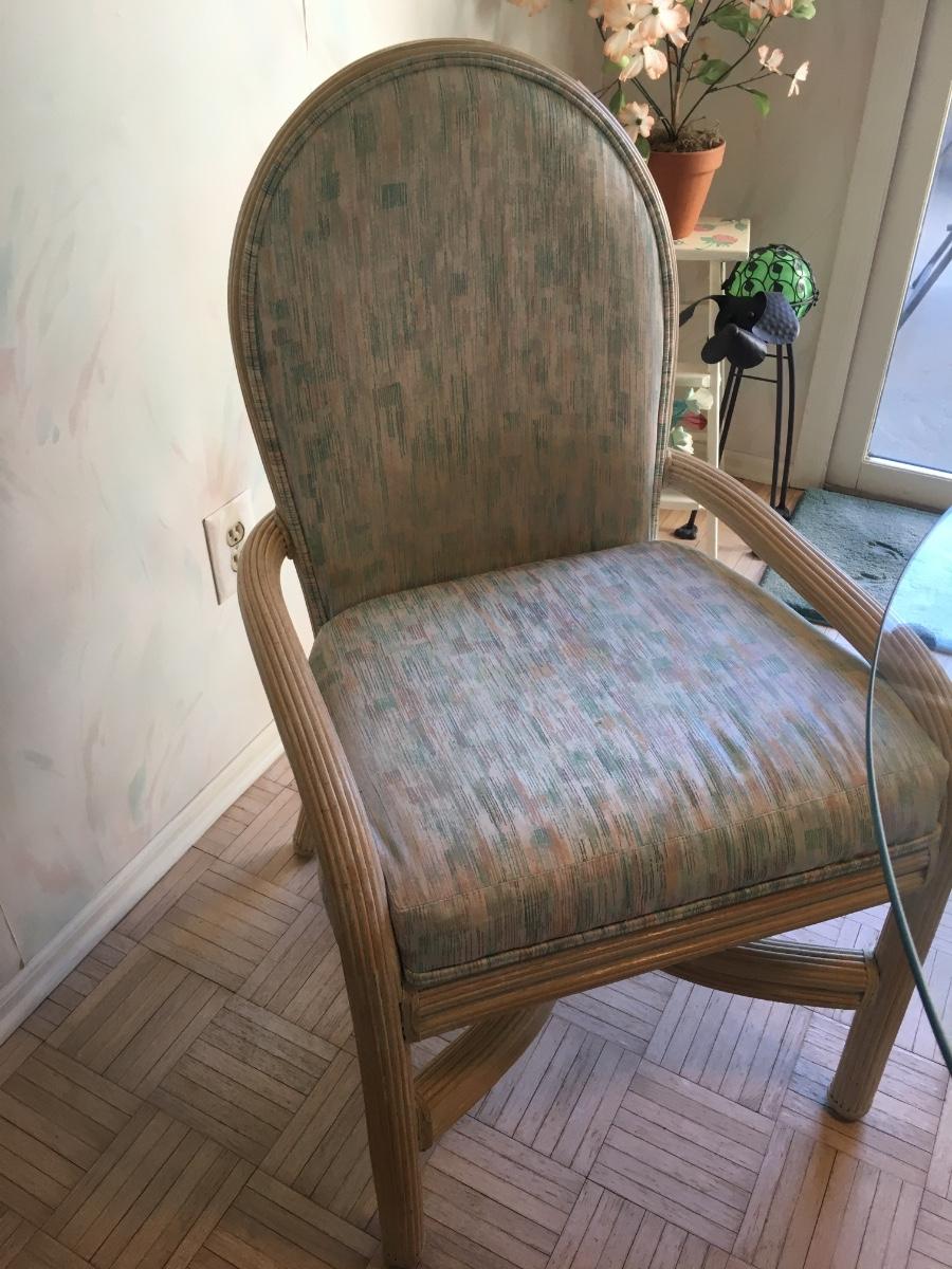 Round glass table with sturdy wood frame base comes with 4 upholstered chairs. Excellent condition
