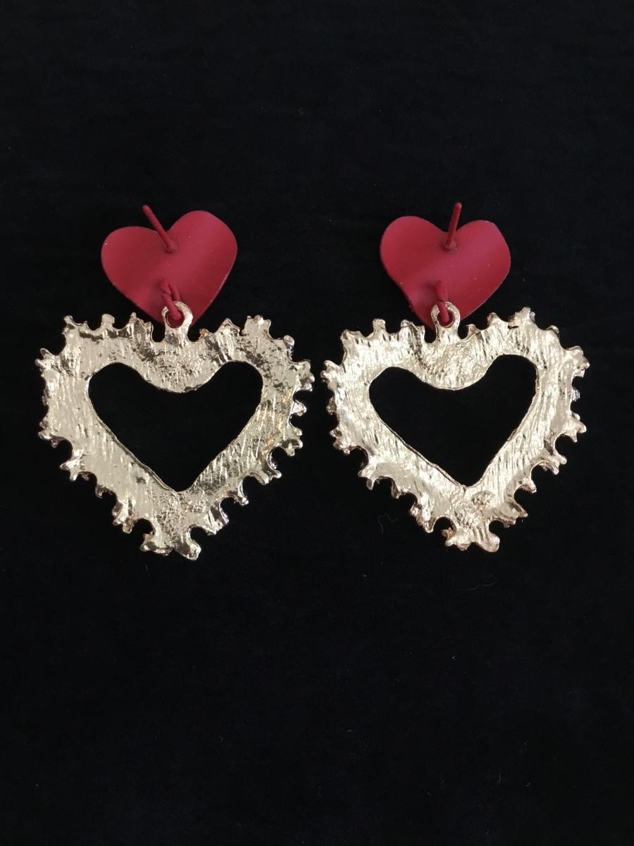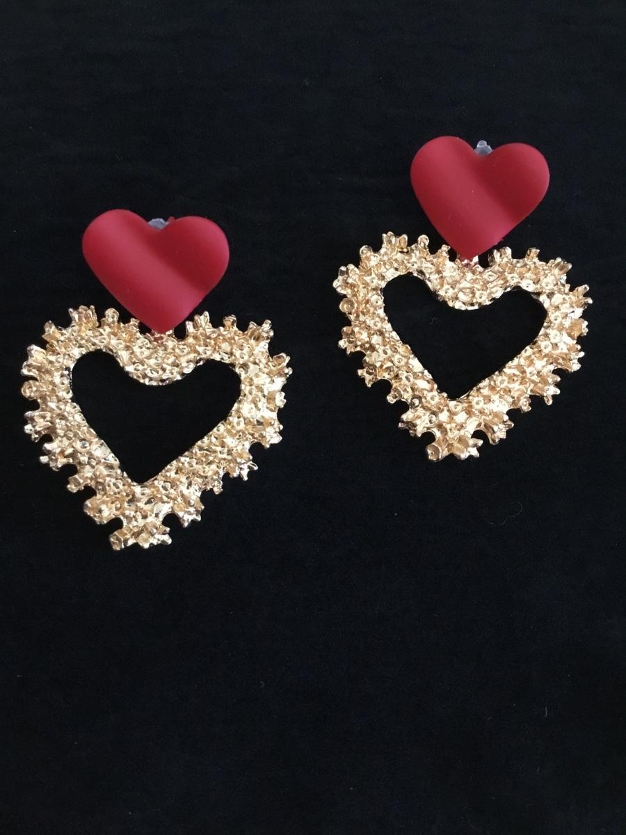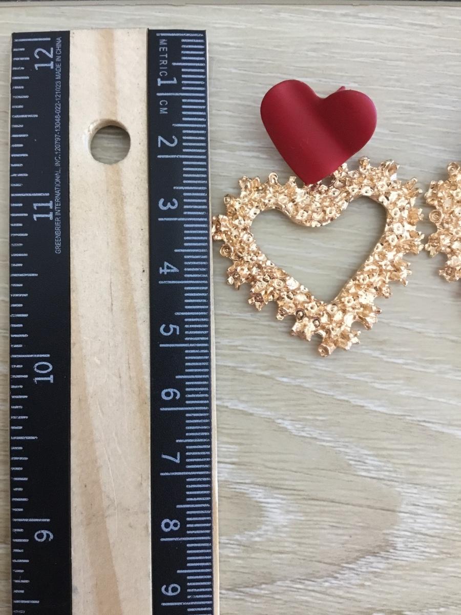 80s gold tone, metal red heart stud statement earrings