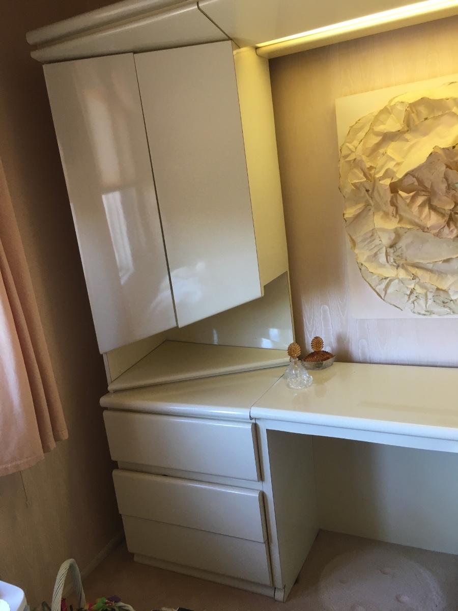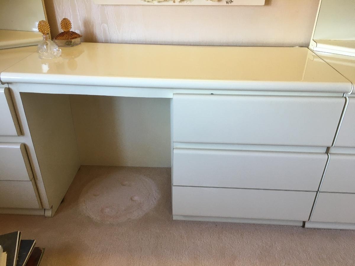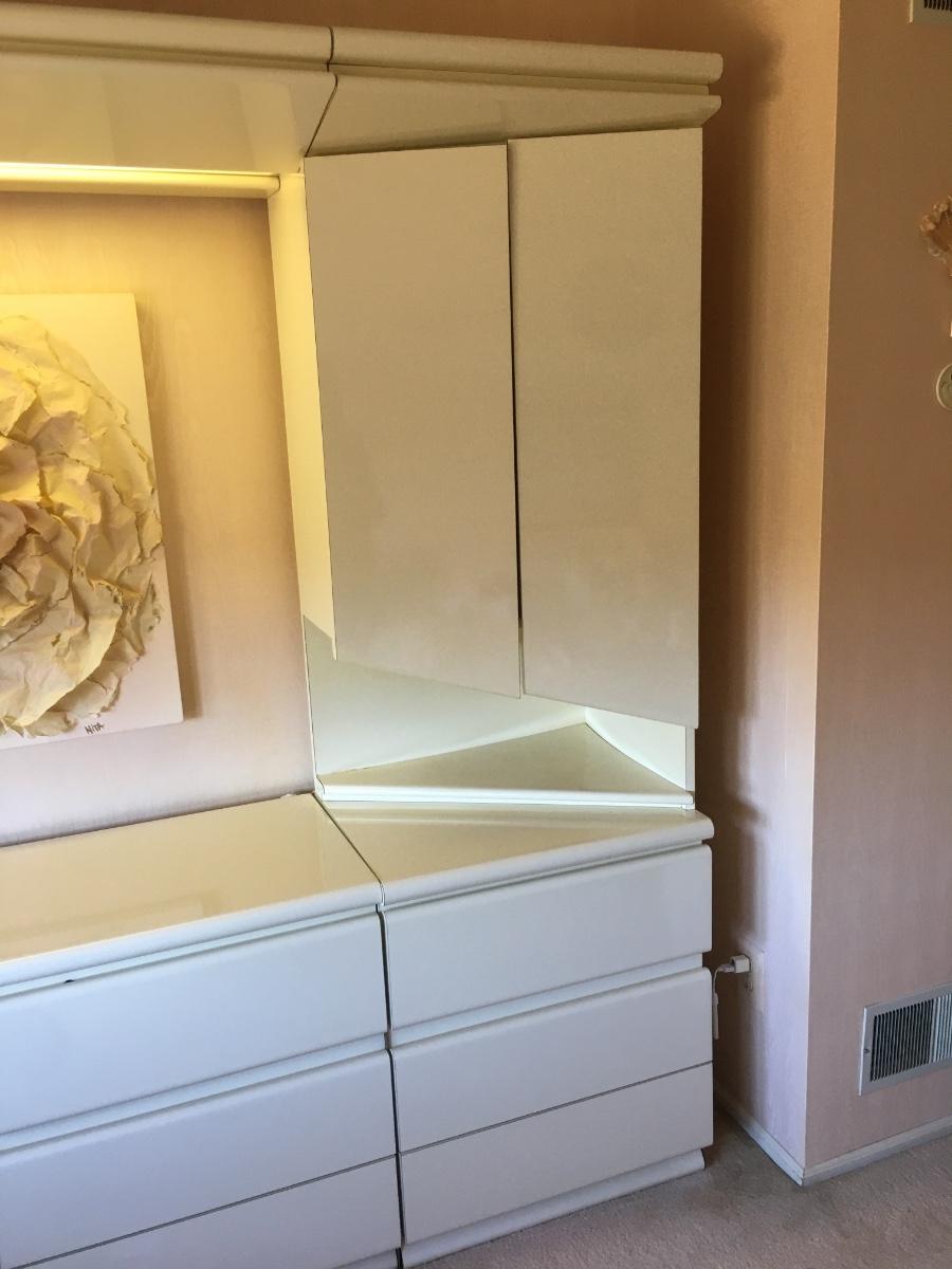 Amazing 3 piece set. Side dressers have shelves and drawers. Center has room for a chair. Light on top panel and under both sides. Lots of storage. Heavy! Must be disassembled and carried down 3 short flight of stairs.