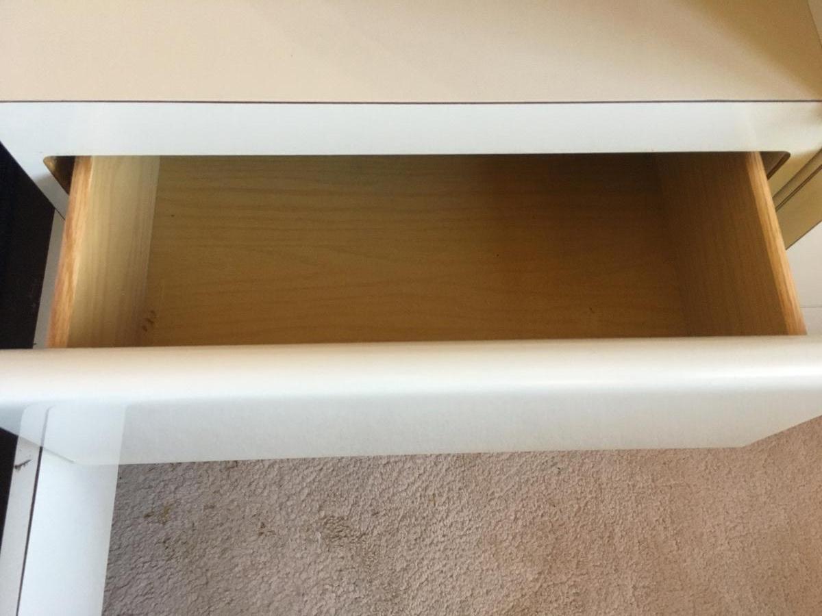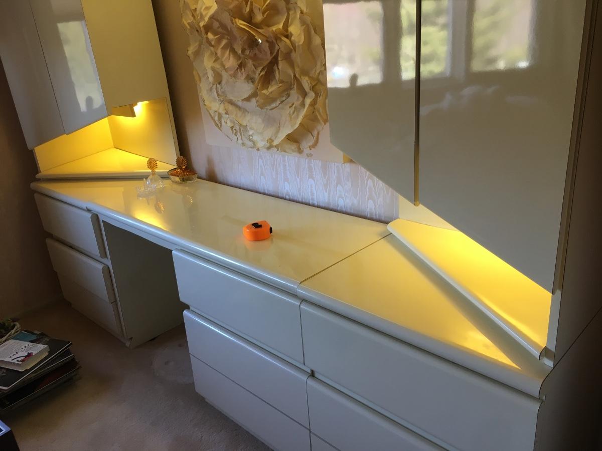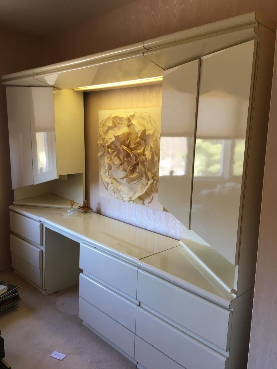 Amazing 3 piece set. Side dressers have shelves and drawers. Center has room for a chair. Light on top panel and under both sides. Lots of storage. Heavy! Must be disassembled and carried down 3 short flight of stairs.