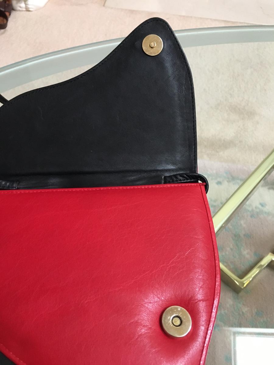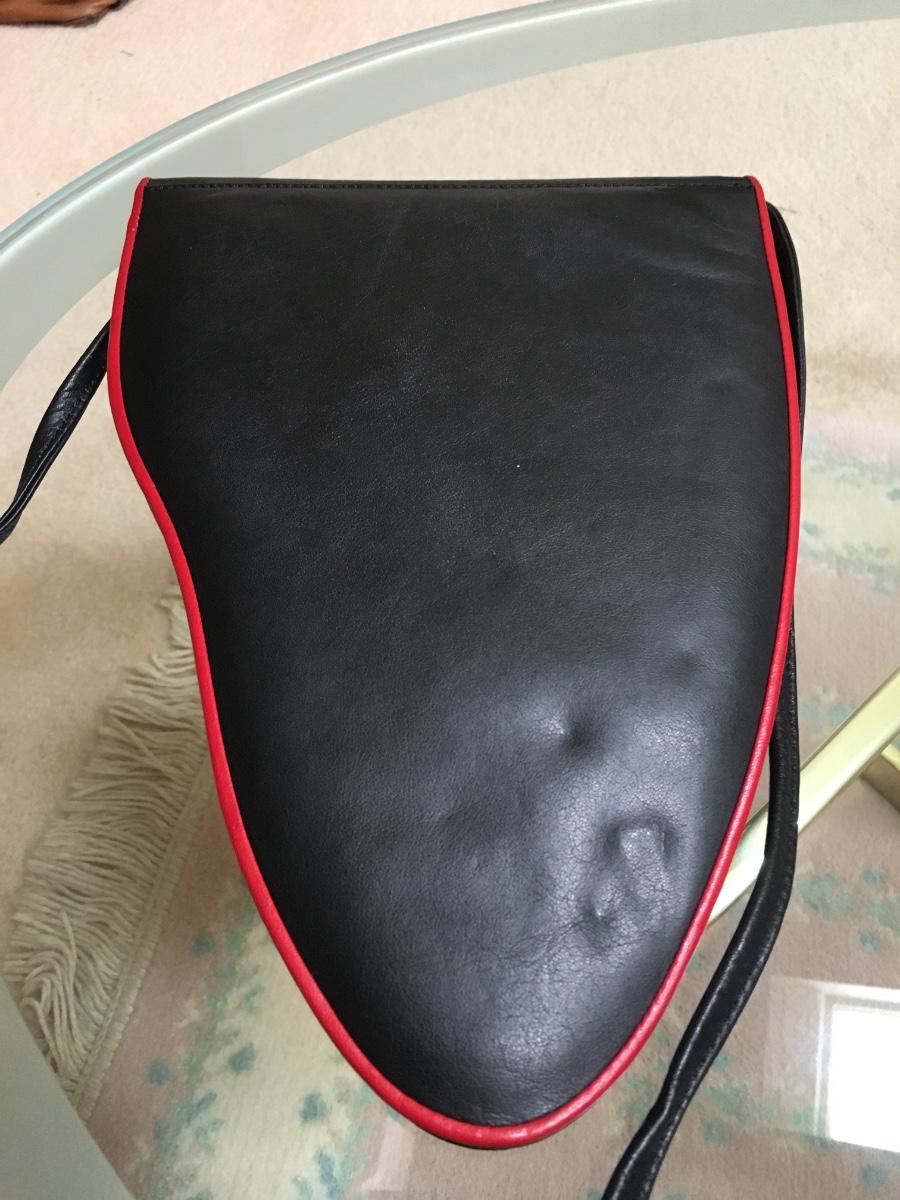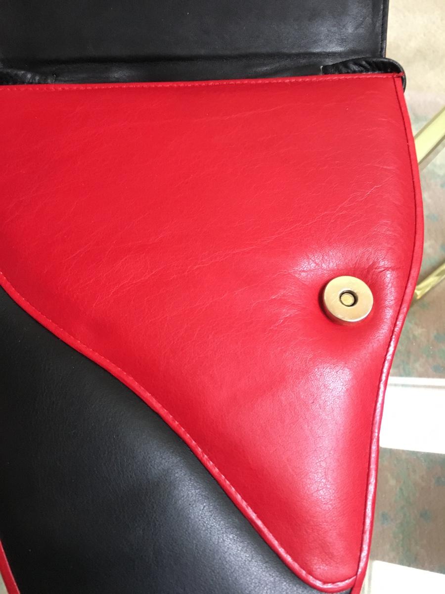 Black and red leather abstract shpaed purse with red highlight strip. No label. Inside zipper pocket.