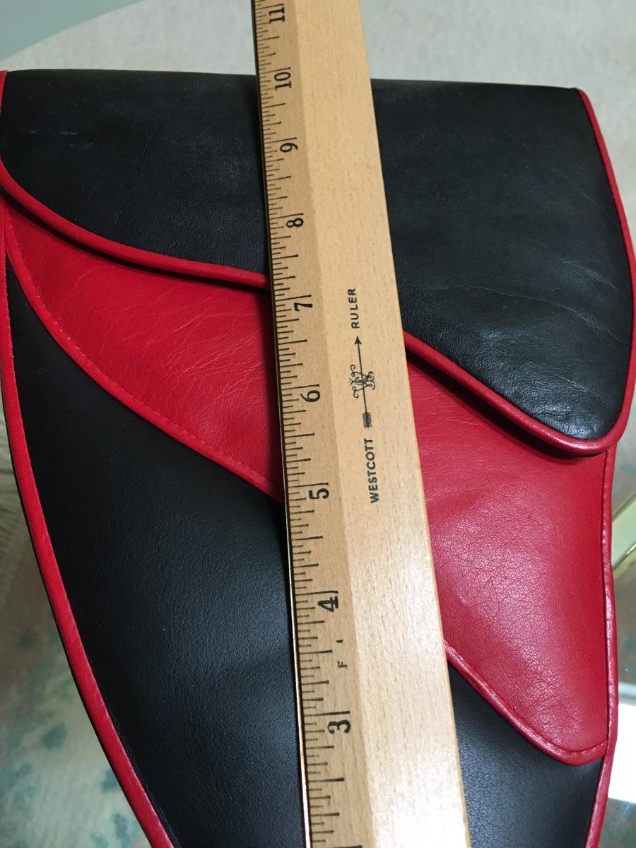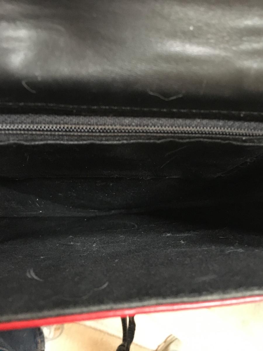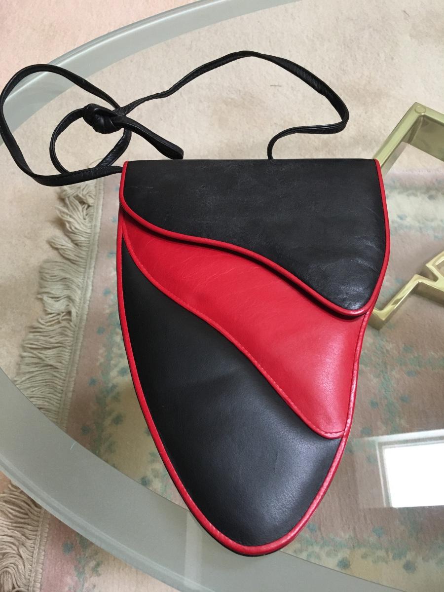 Black and red leather abstract shpaed purse with red highlight strip. No label. Inside zipper pocket.