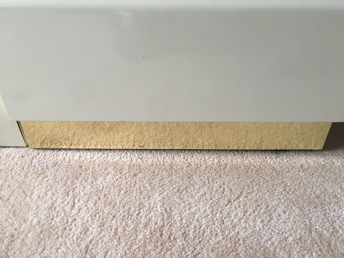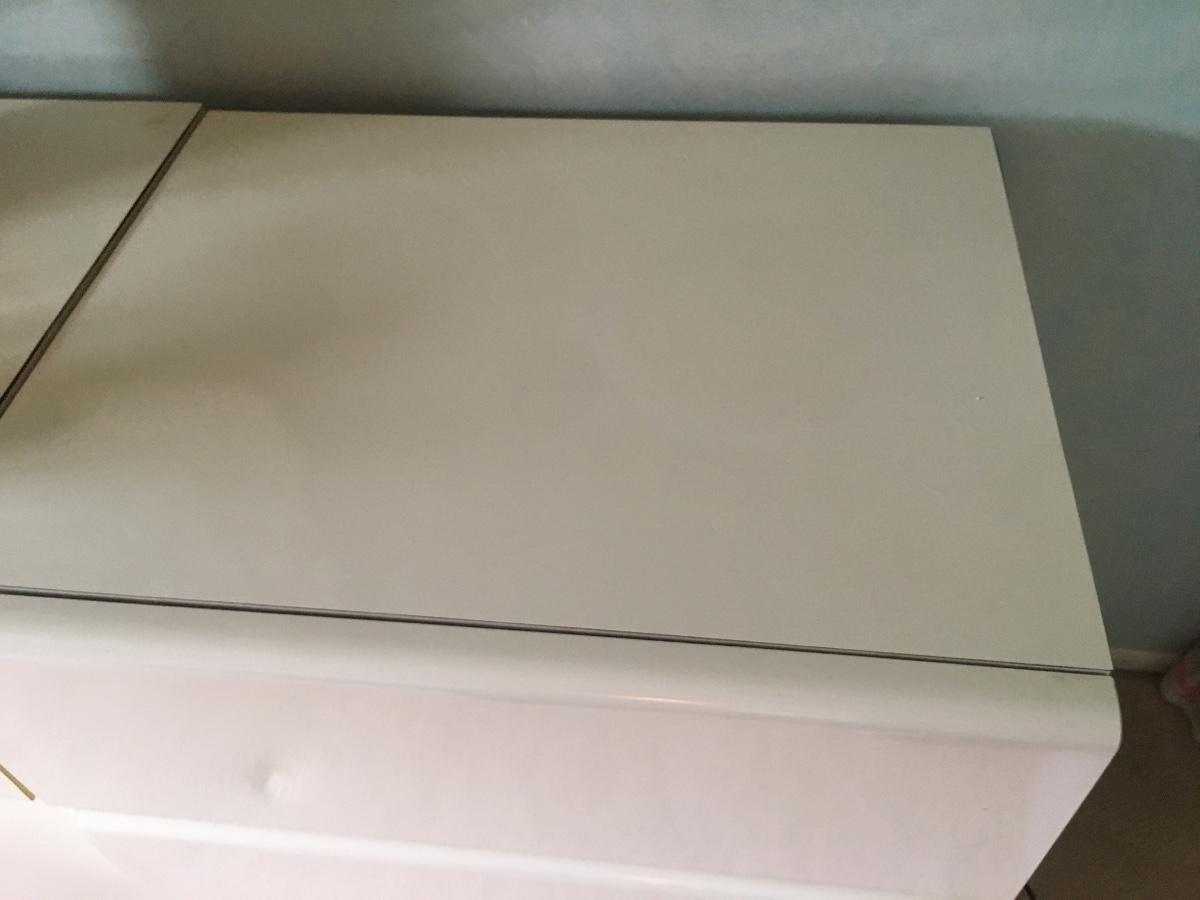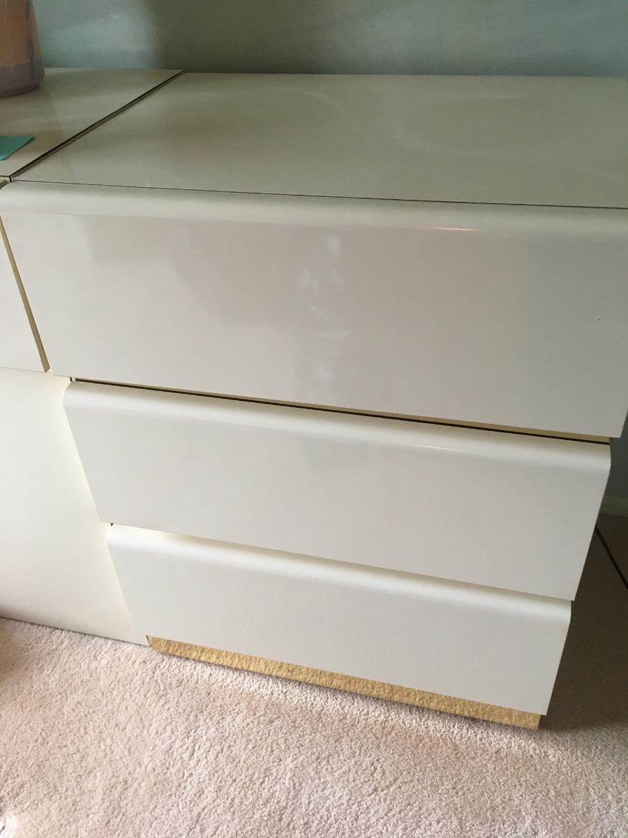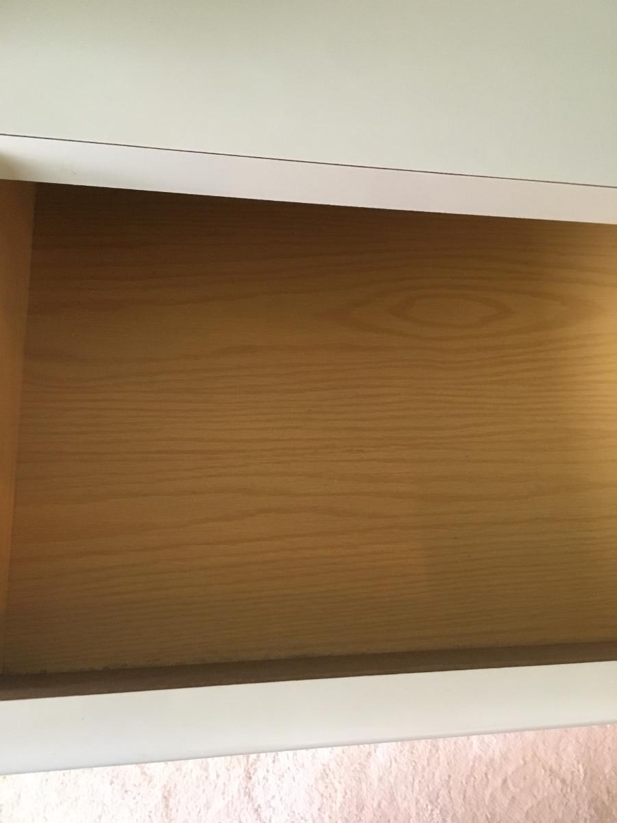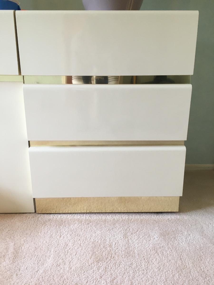 Brass accents on this smaller sized dresser with 3 drawers. 30" tall x 18" deep x 23" wide