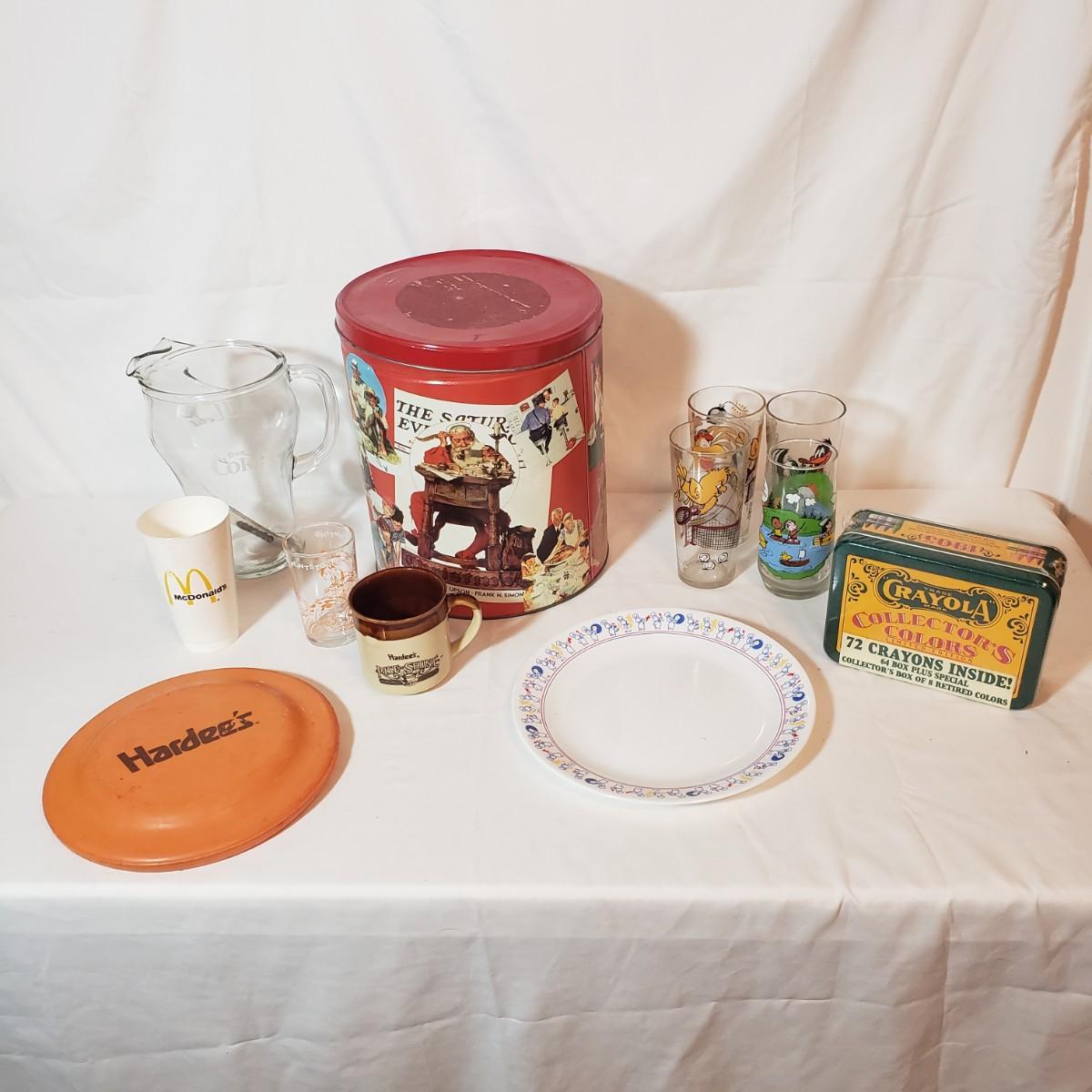 This lot is a small collection of some 80’s and 90’s advertising items! Included is an unopened tin of Crayola crayons, a Christmas popcorn tin, a Coca-Cola pitcher, four glasses featuring favorite cartoon characters, a Hardee’s mug, a Pilsberry dough-boy plate and a frisbee!! See pictures for details. Shipping available.