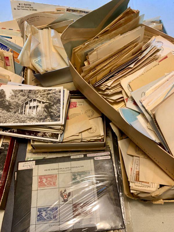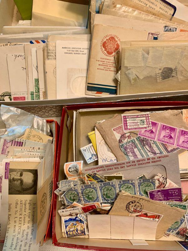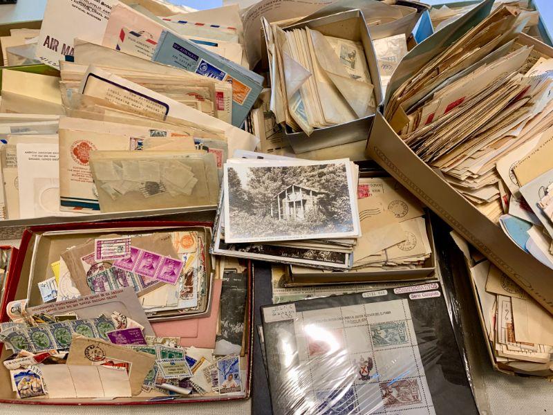 Boxes of loose stamps, letters, early postmarks, post cards & stamp related papers. US & foreign.