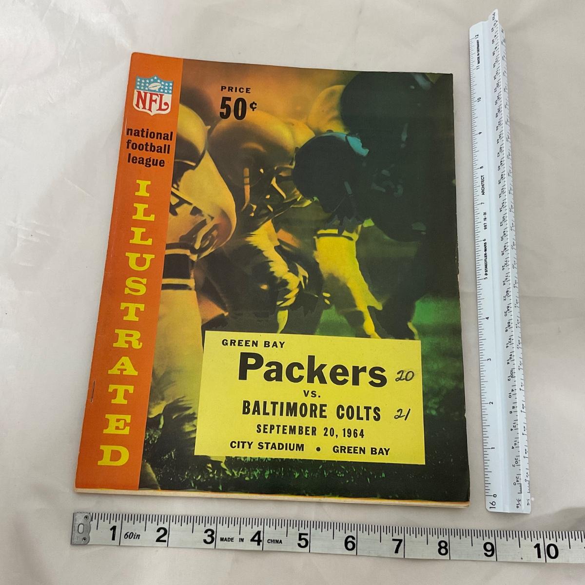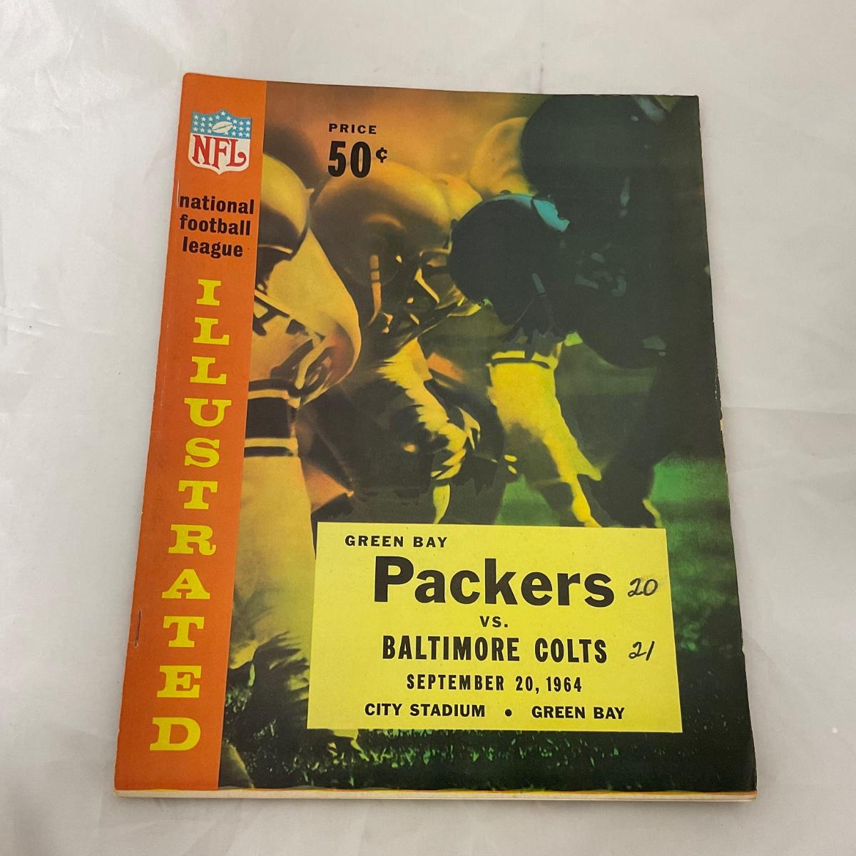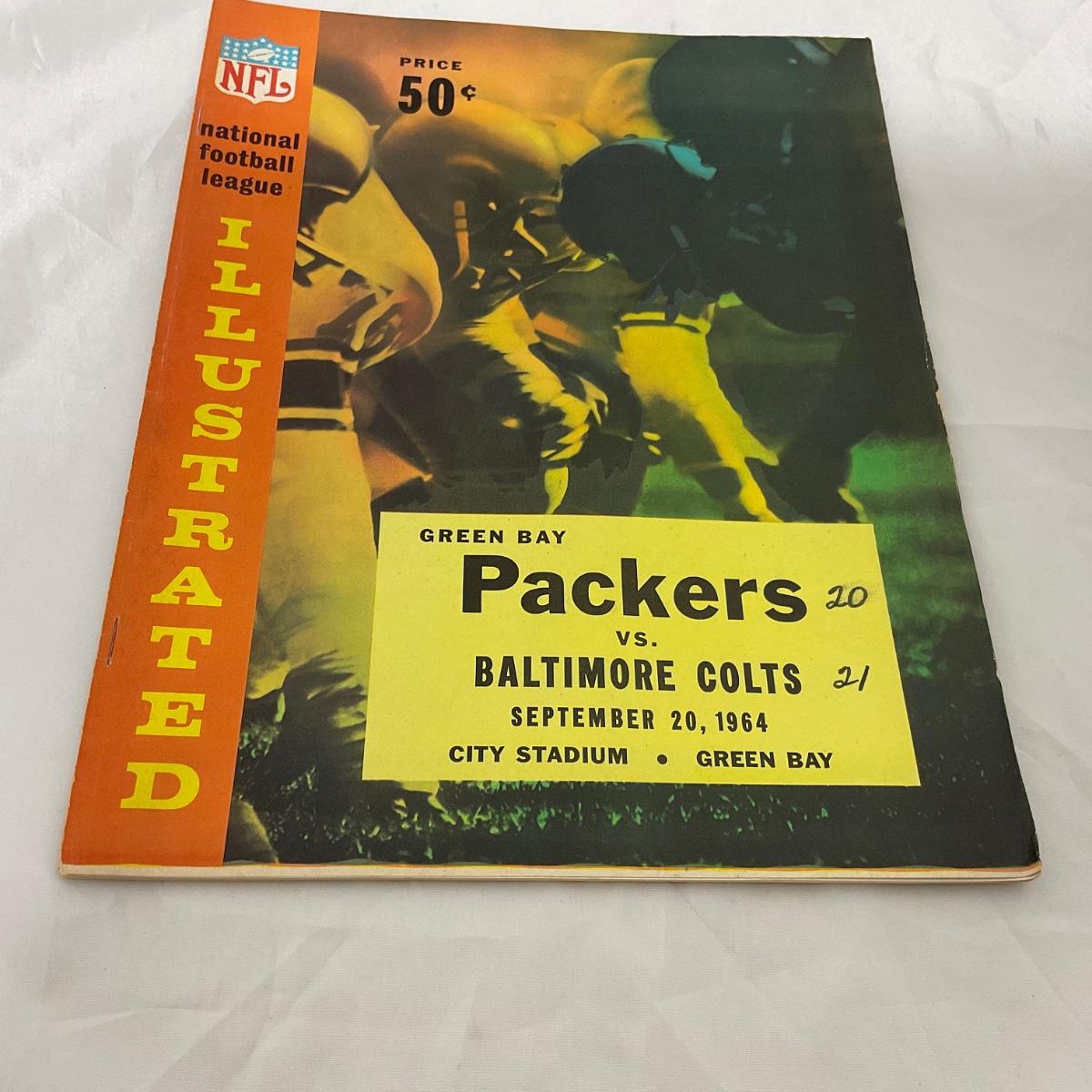 One 1964 Green Bay Packers vs The Colts Program. Please see photos for details and condition. ::: Shipping is available on this lot. If you require shipping you must let us know at the close of the auction. We will coordinate with you after the item has been won. Shipping fees will include insurance up to or exceeding the value of all items being mailed. If you have any questions regarding this lot please contact the auctioneer either via this website, by direct email or by phone. PICK UP TIMES and other important information can be found in the TERMS and DESCRIPTION of the auction. Please take a look for pertinent information. Thanks!