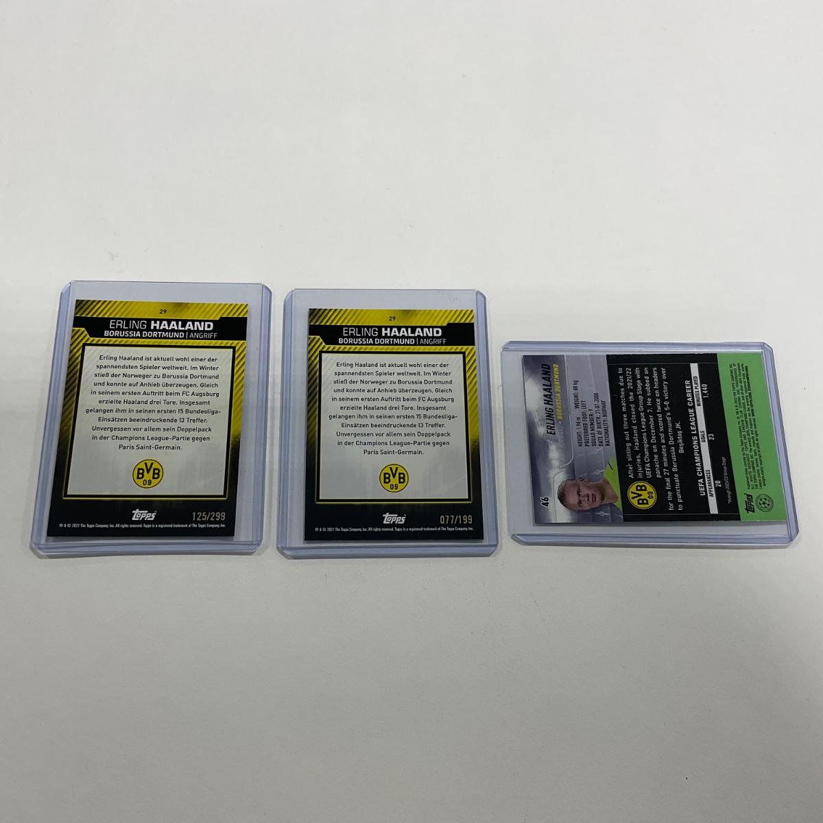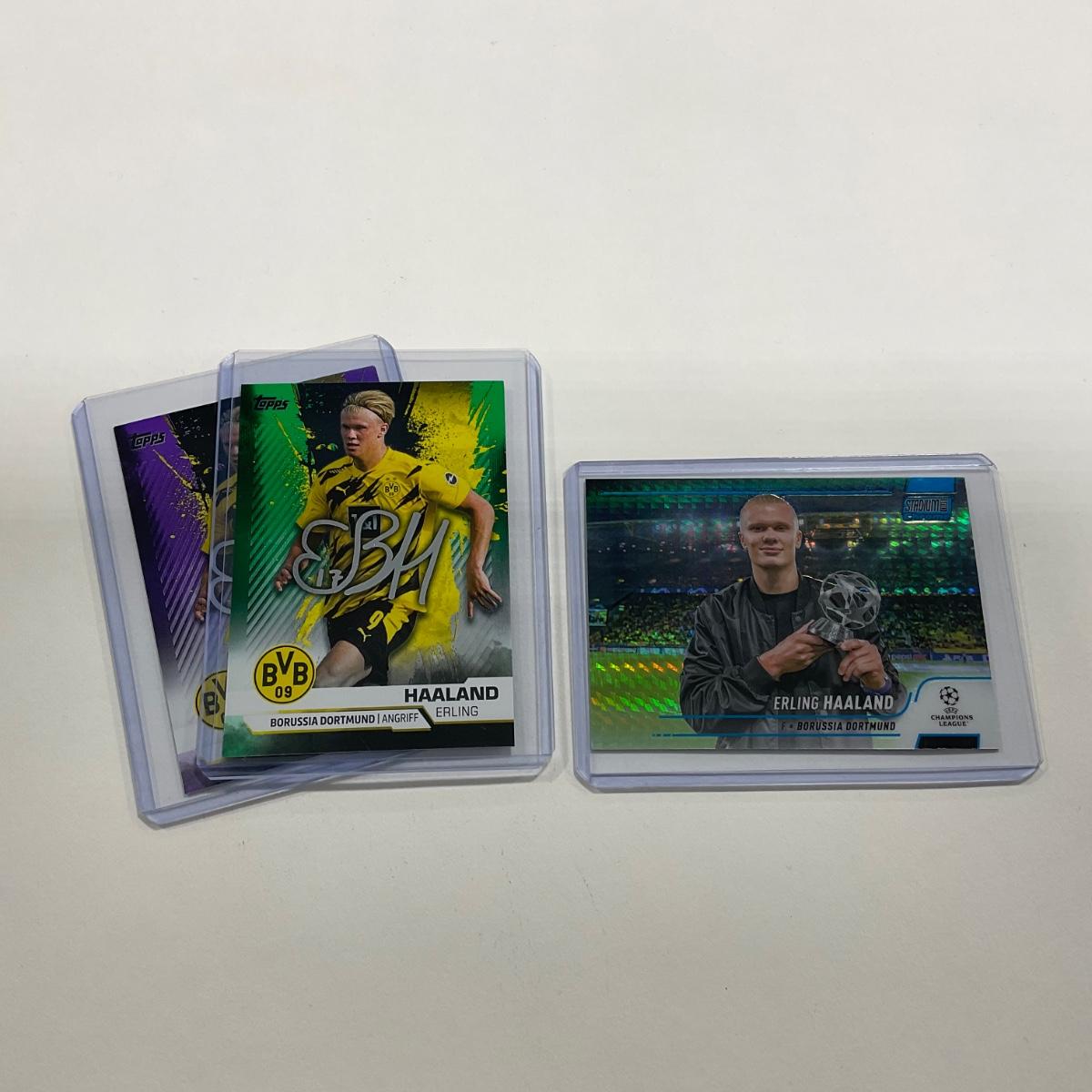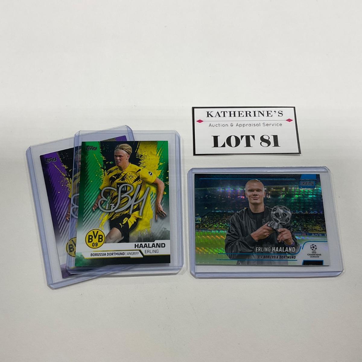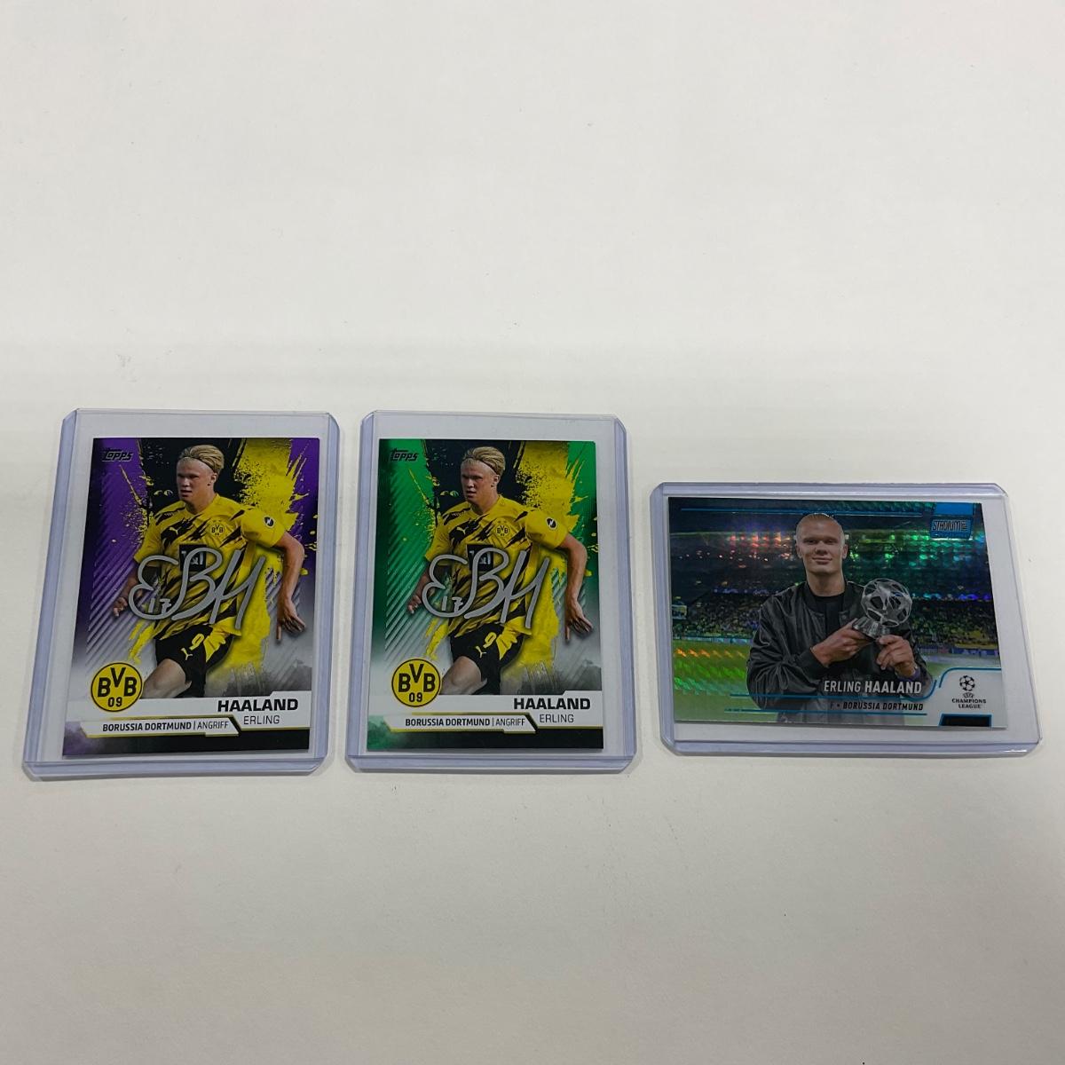 Three Erling Haaland football cards. Please see photos for details and condition. ::: Shipping is available on this lot. If you require shipping you must let us know at the close of the auction. We will coordinate with you after the item has been won. Shipping fees will include insurance up to or exceeding the value of all items being mailed. If you have any questions regarding this lot please contact the auctioneer either via this website, by direct email or by phone. PICK UP TIMES and other important information can be found in the TERMS and DESCRIPTION of the auction. Please take a look for pertinent information. Thanks!