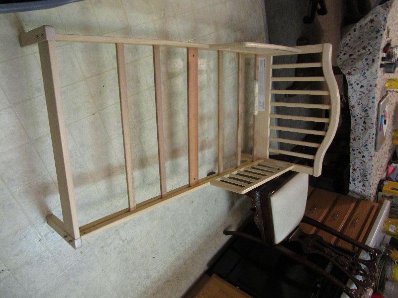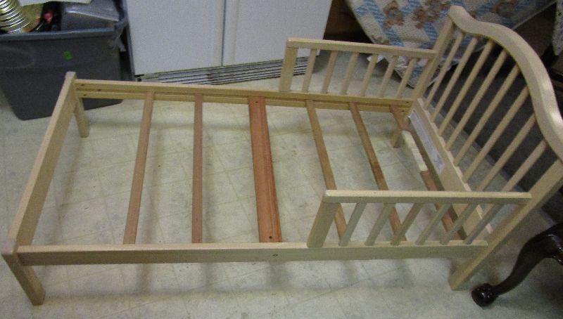 Toddler Bed with Mattress. Head to foot-board 53", side to side 29" Mattress 51"x27" one slat may be broken has tape on it, one bottom slat missing, Bed quite sturdy in very good condition. Built very strong.