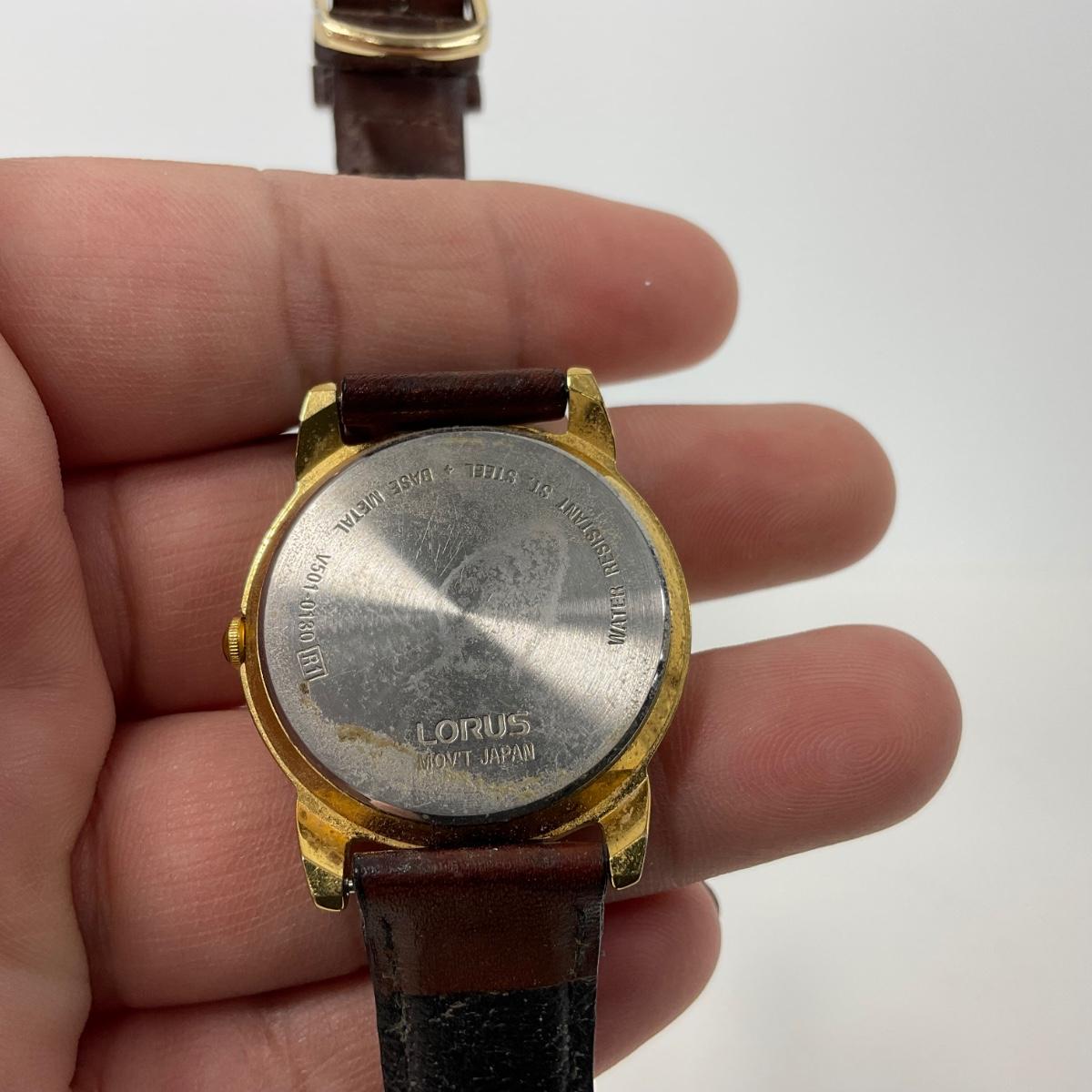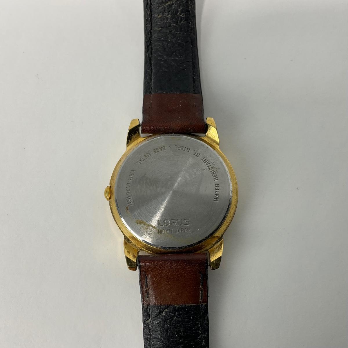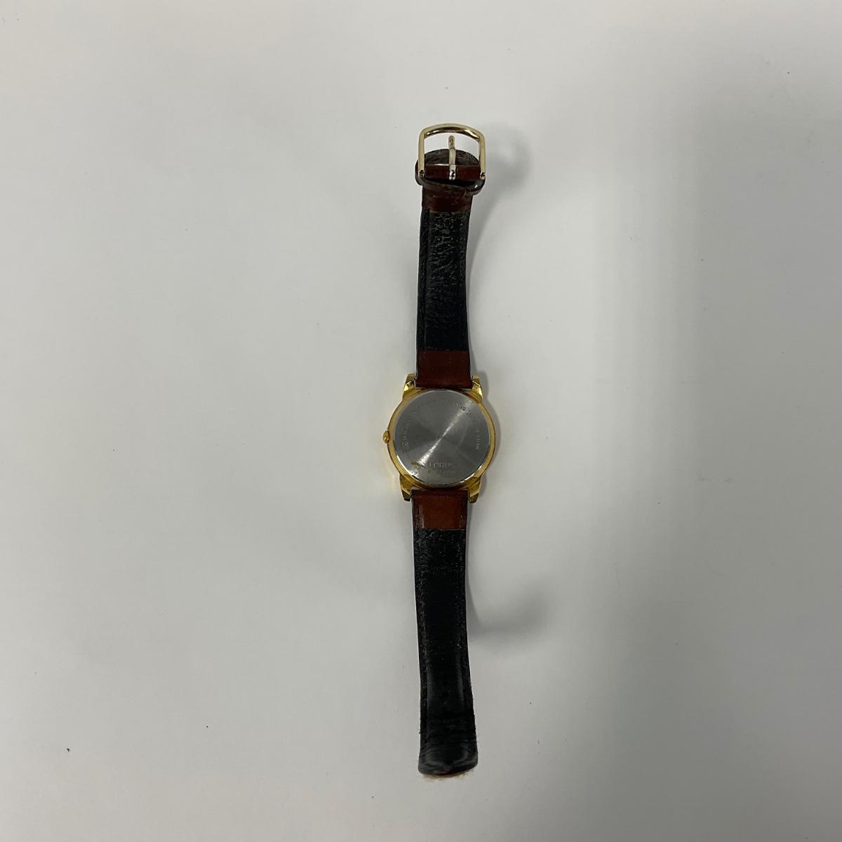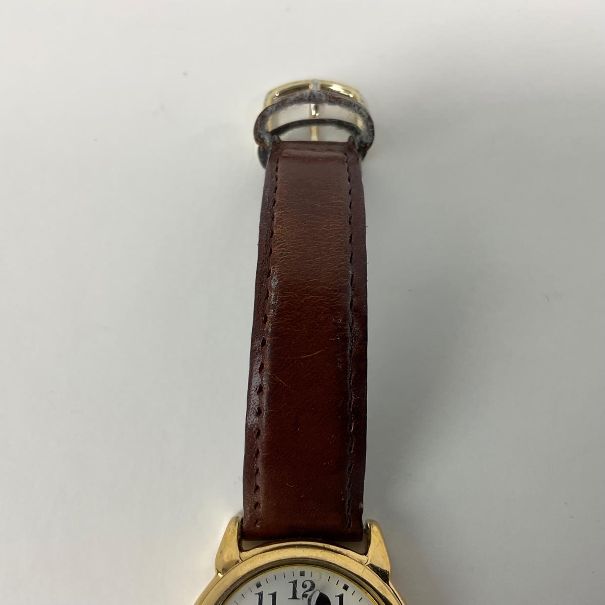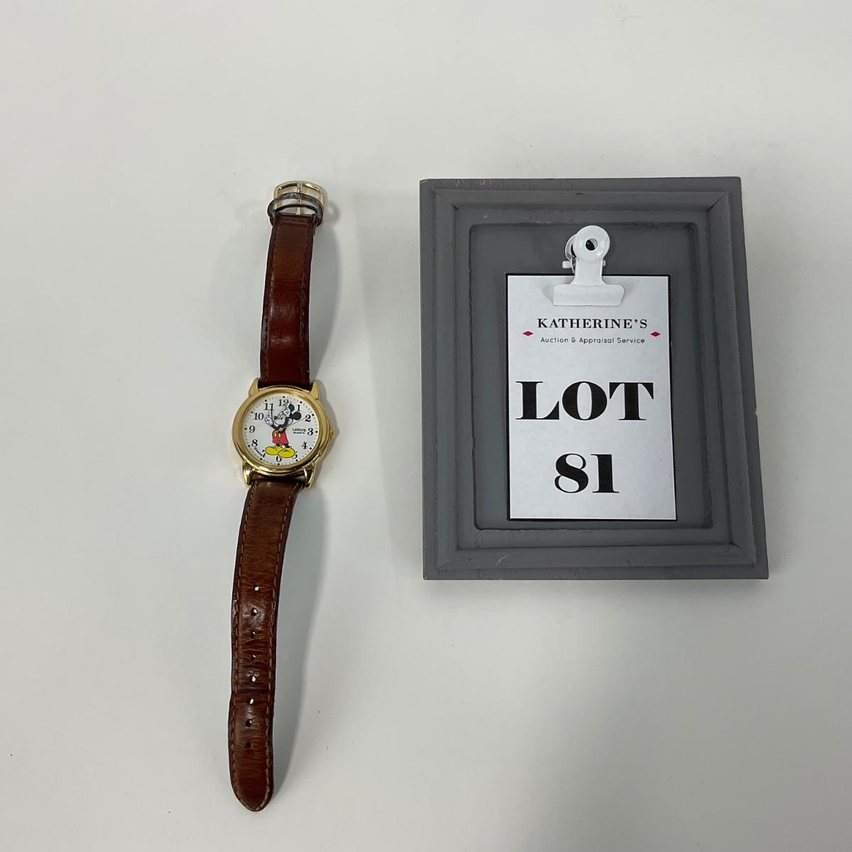 One Lorus Mickey Mouse ladies gold tone brown leather band watch. #V501-6N70 watch. In well loved worn condition. Watch has a new battery, in working order and runs. Please see photos for details and condition. Any condition statement is given as a courtesy to a client, is an opinion, and should not be treated as a statement of fact. Reference to condition written, oral or within a condition report shall not be regarded as a full account of condition and may not include all defects, alterations, or restorations. Absence of a condition report does not imply a lot is flawless or lacking imperfections or damage. Katherine’s Auction & Appraisal Service shall have no responsibility for any error or omission. Returns shall not be accepted on the basis of condition. ::: Shipping is available on this lot. If you require shipping you must let us know at the close of the auction. We will coordinate with you after the item has been won. Shipping fees will include insurance up to or exceeding the value of all items being mailed. If you have any questions regarding this lot please contact the auctioneer either via this website, by direct email or by phone. PICK UP TIMES and other important information can be found in the TERMS and DESCRIPTION of the auction. Please take a look for pertinent information. Thanks!