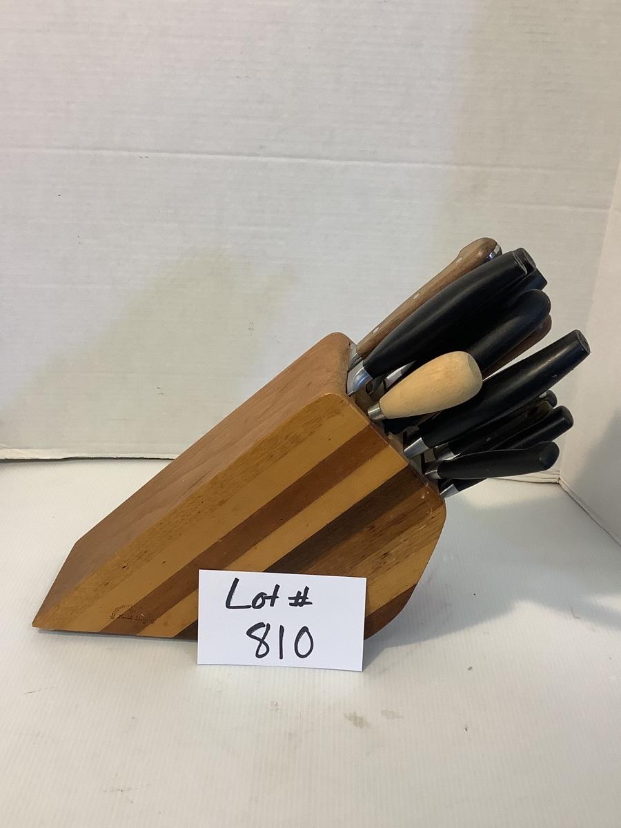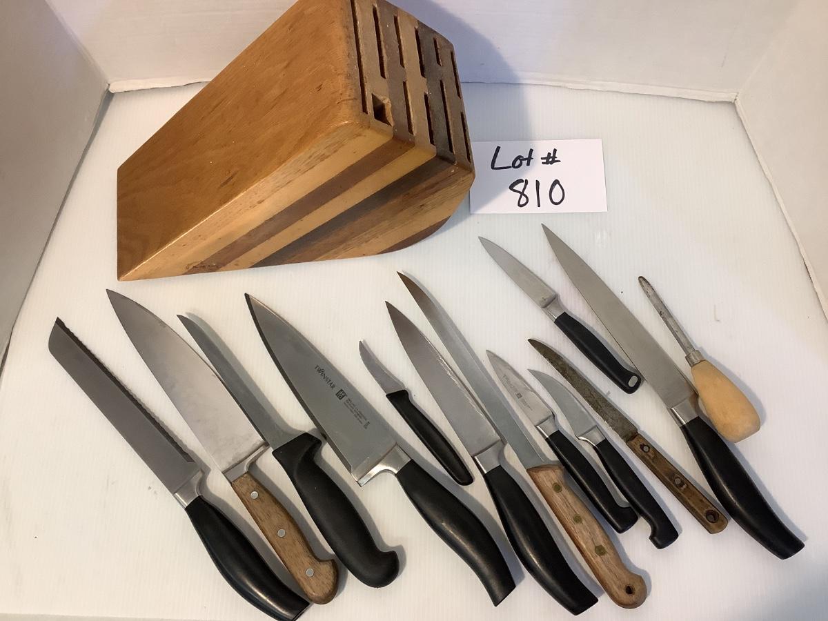 Handcrafted Knife Block by David Leary. 12 Assorted Knives, Oyster Shucker & Knife Sharpener. Qty (4) are Hencklels.