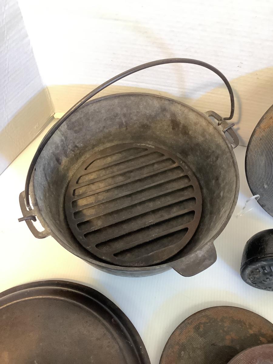 Cast Iron Kettle 10" Round, 1 Antique Ice Scraper & 4 Cast Iron Hot Plates
