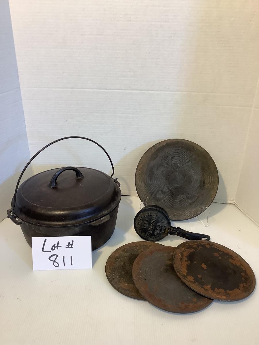 811 Lot of Cast Iron Hot Plates, Ice Scraper & Kettle