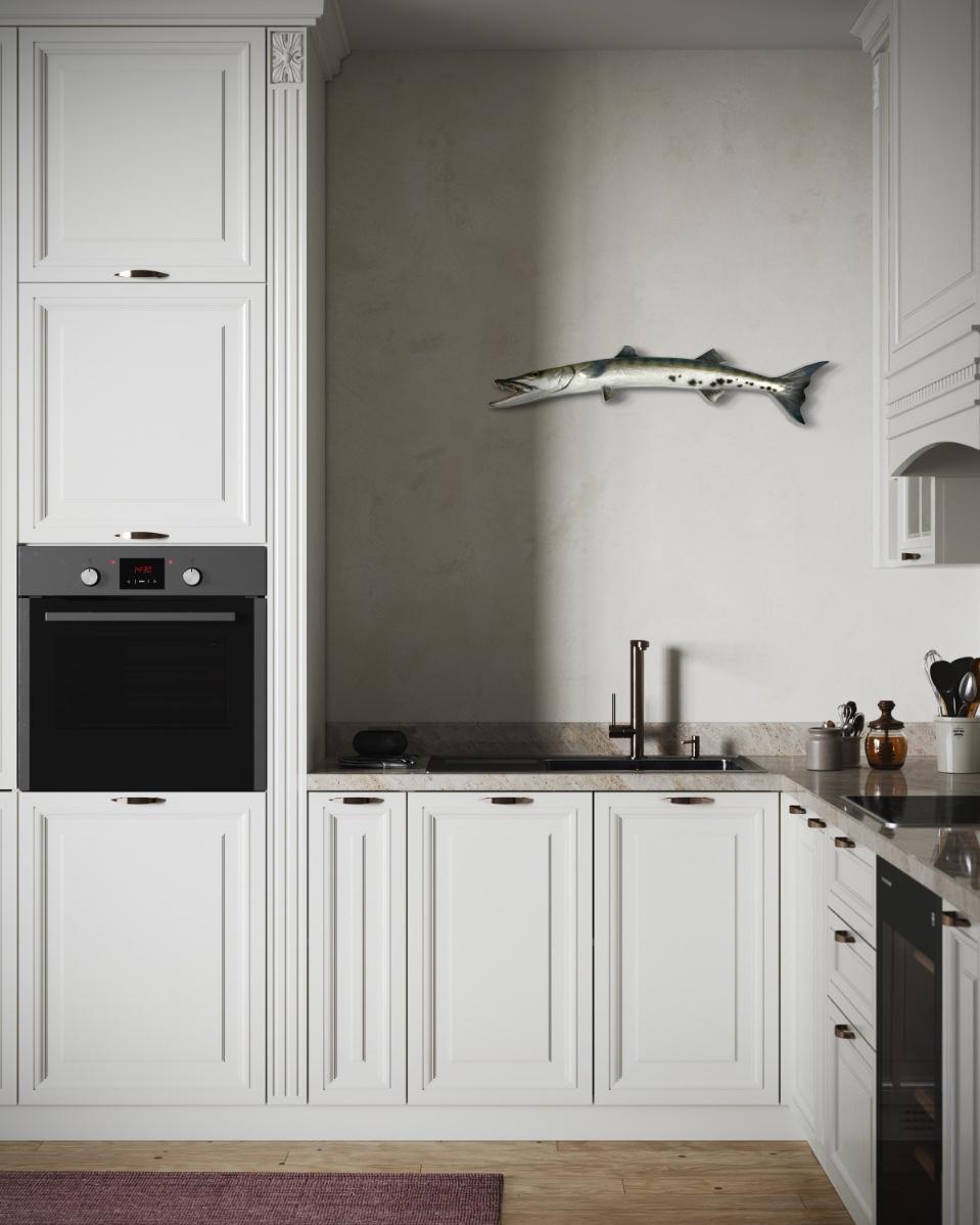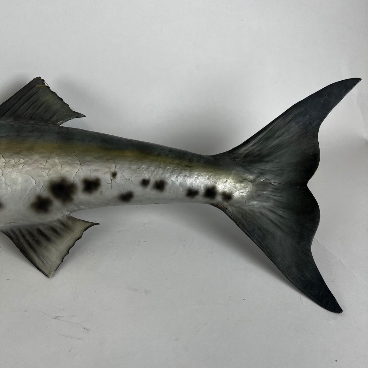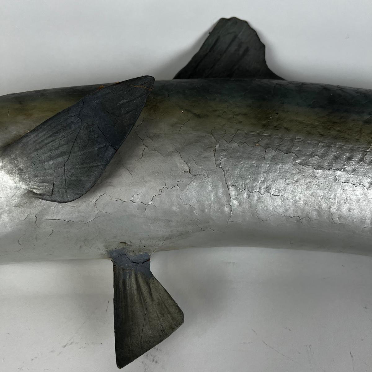 NOTE: The exterior of fish has some outer surface cracks on the paint due to age. Overall mount is structurally sound for hanging as pictured. See pics for more detail. Rear metal looped hanging mount on “rear” right side.