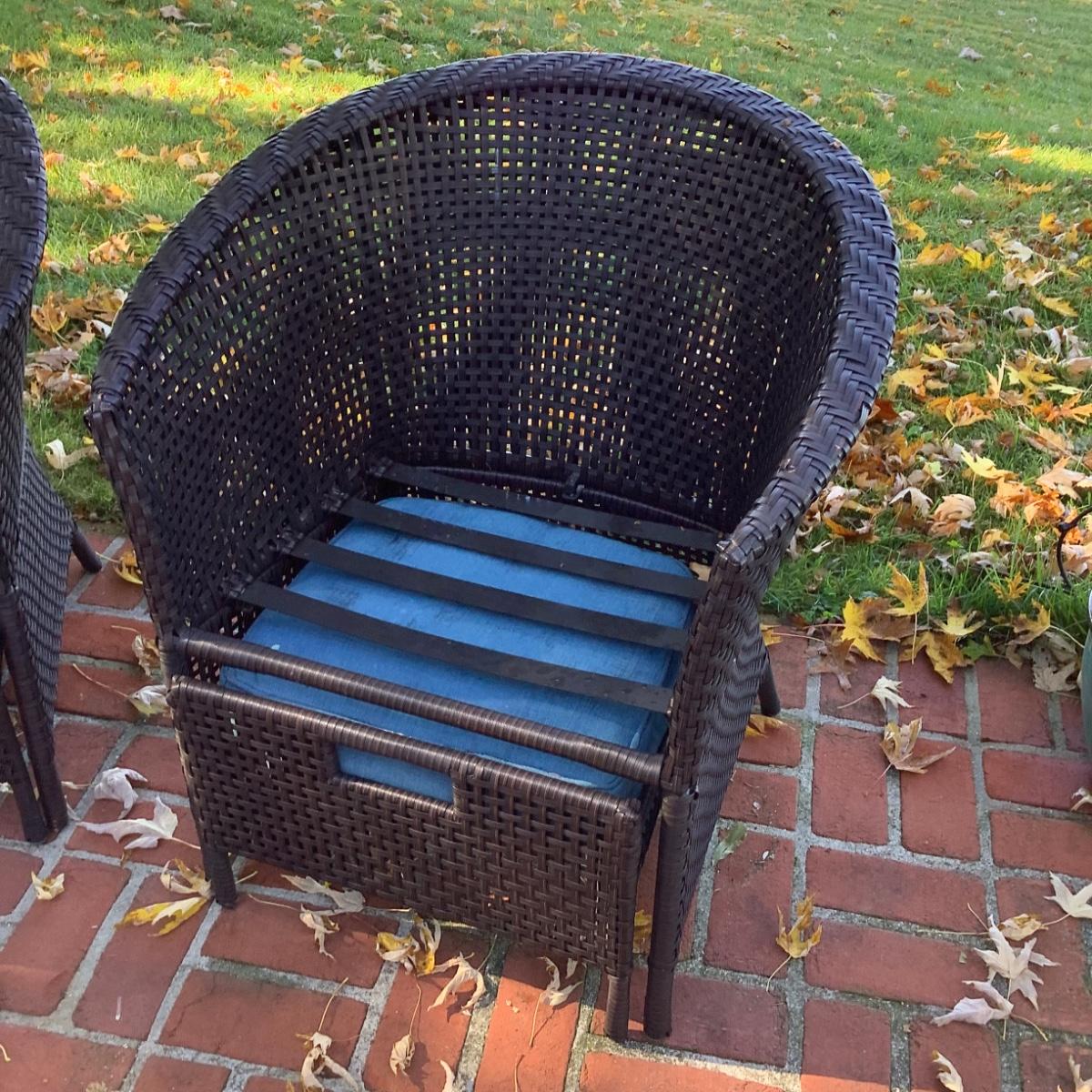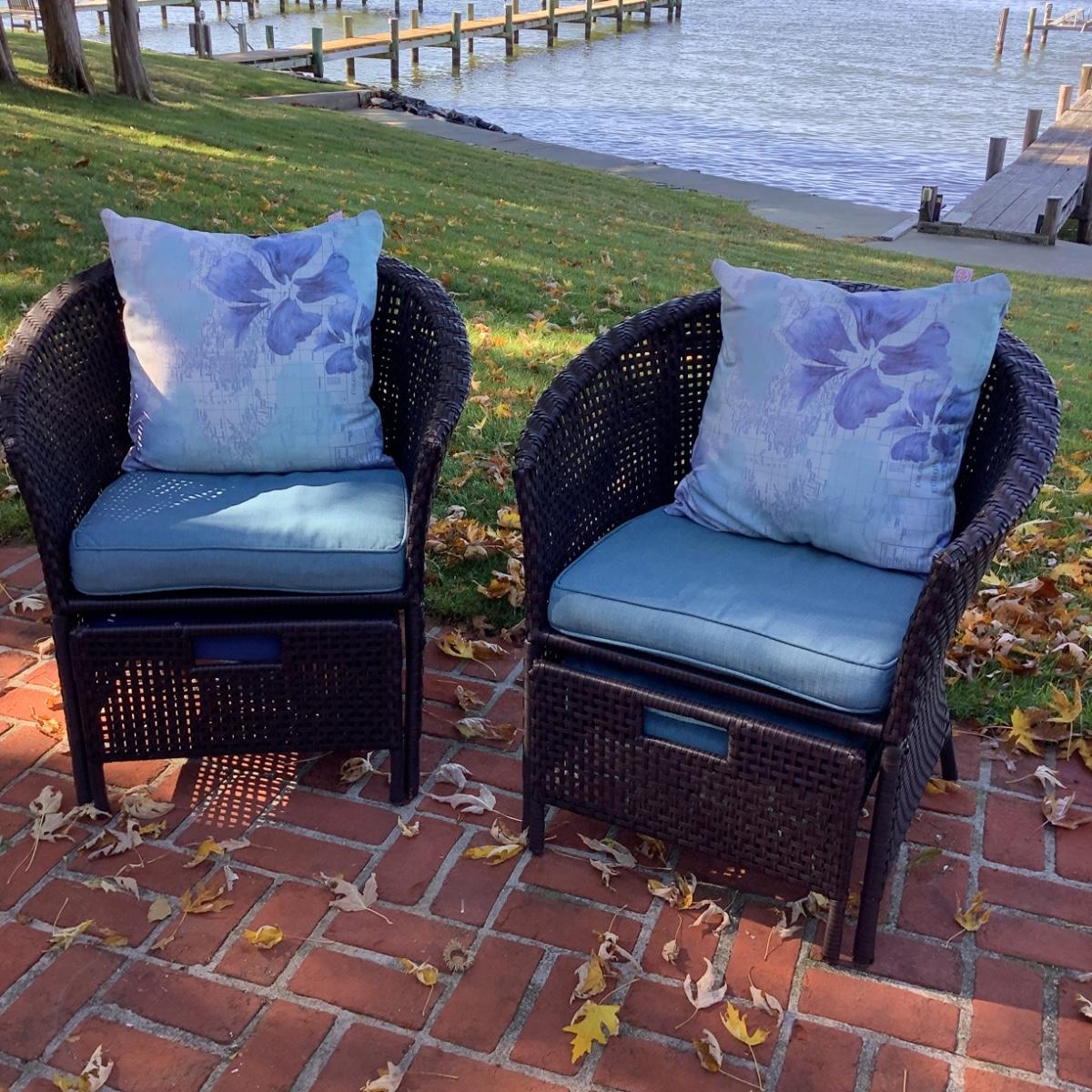 Comes with cushions ( one not matching on ottoman) Ottomans can be stored under the chairs and the measurements are 19" wide x 13.5" high x 17" deep