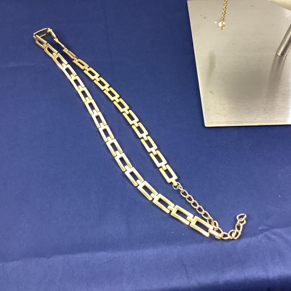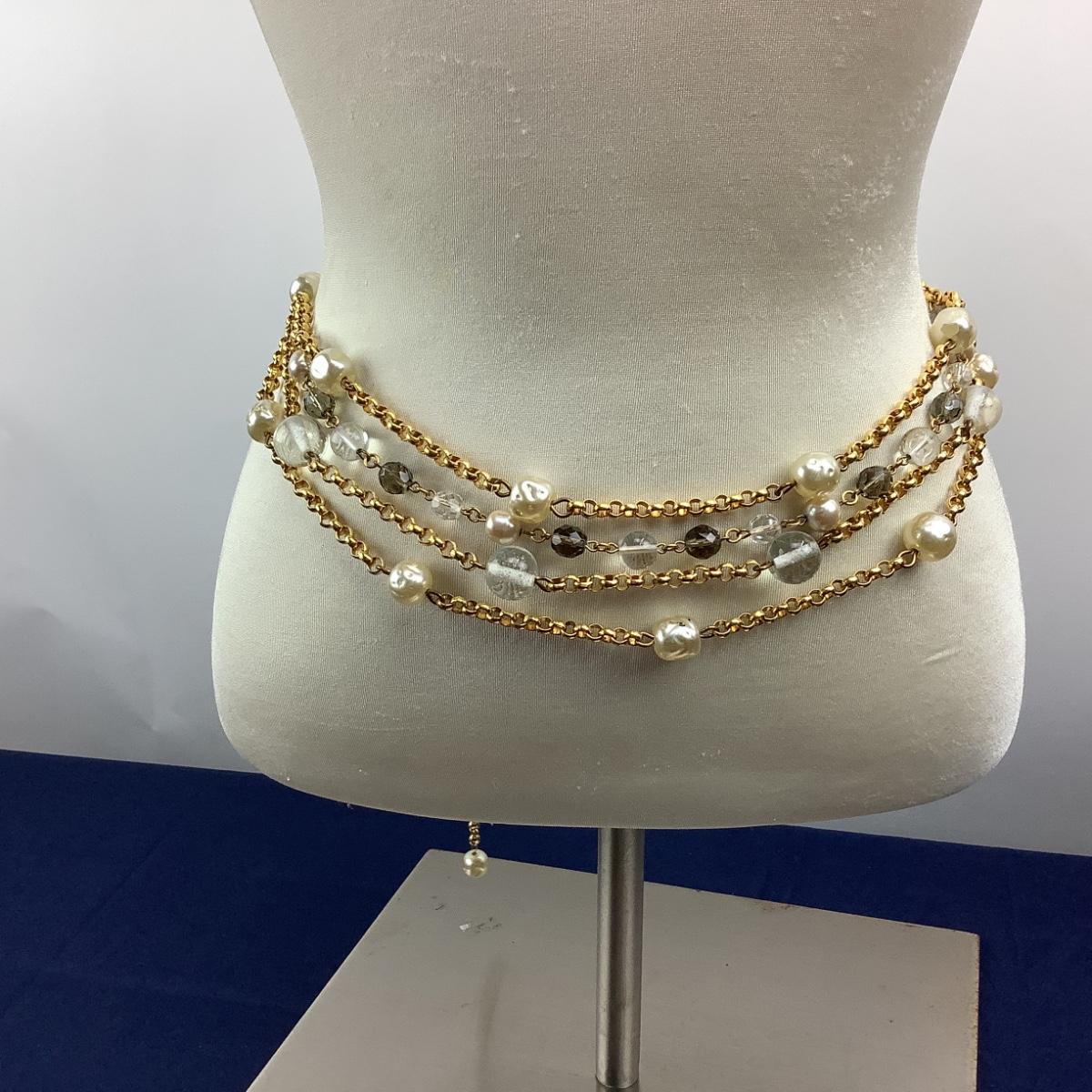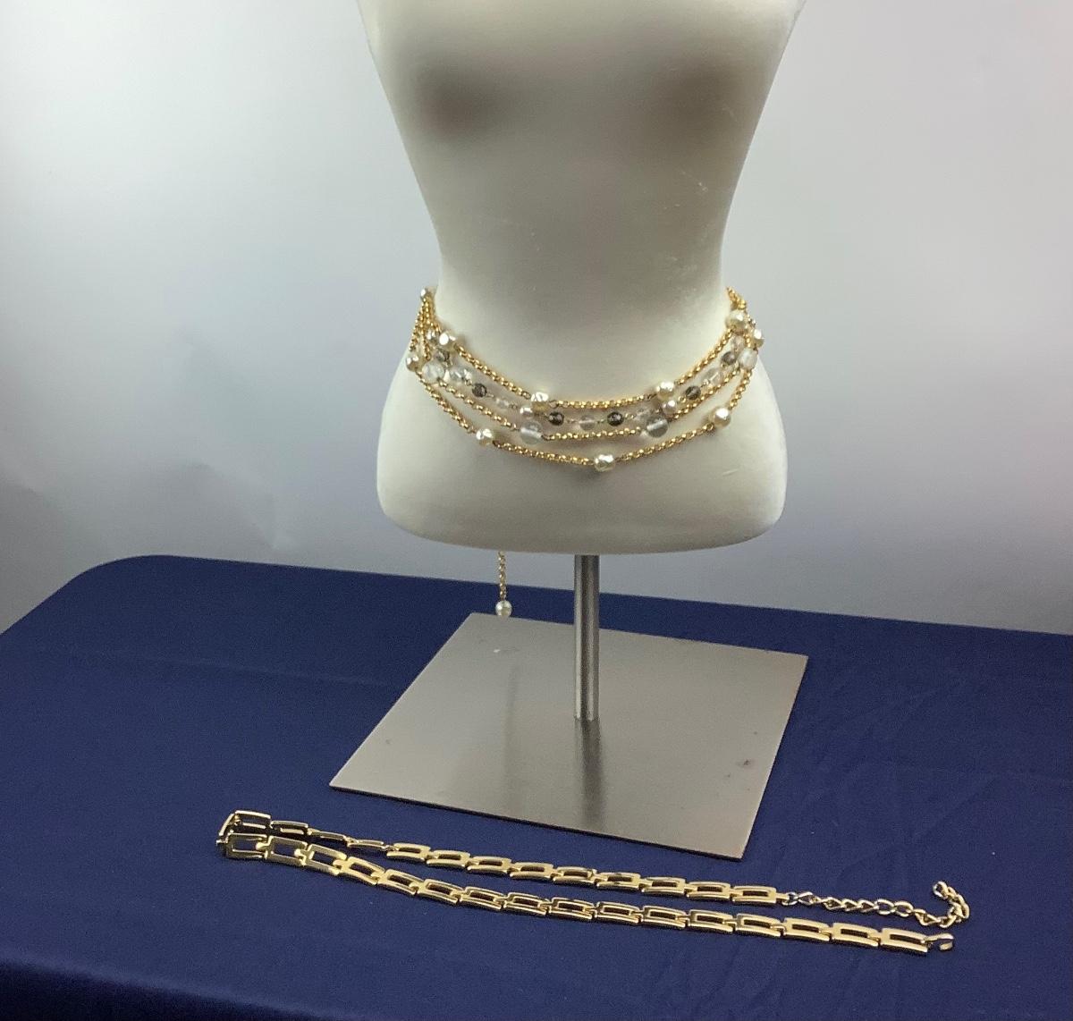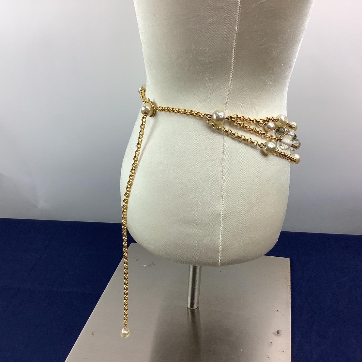 There are 2 belts in this lot, the belt with pearls and stones is multilayered and measures 38" from end to end. The gold tone chain style belt with rectangle links measures 40" from end to end.