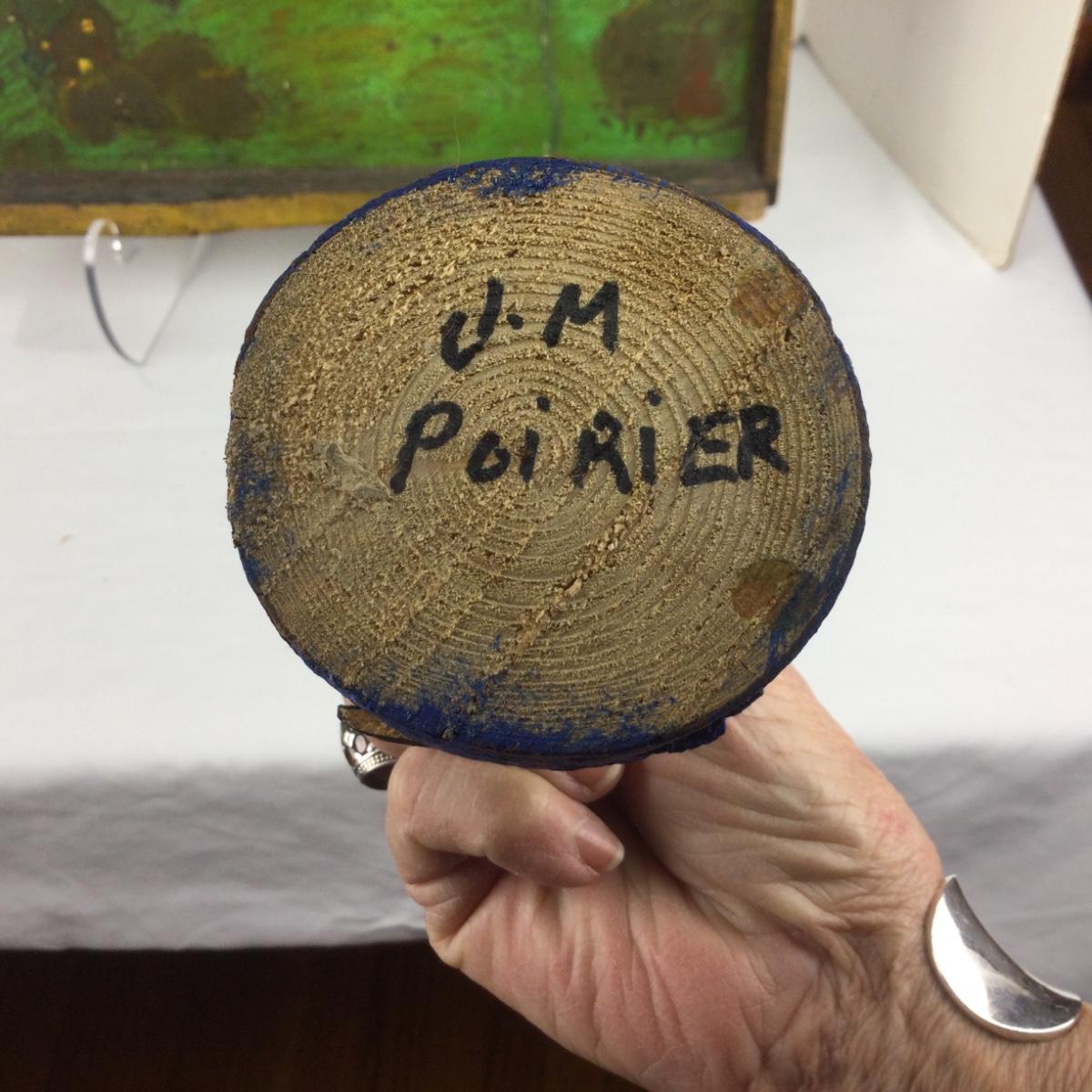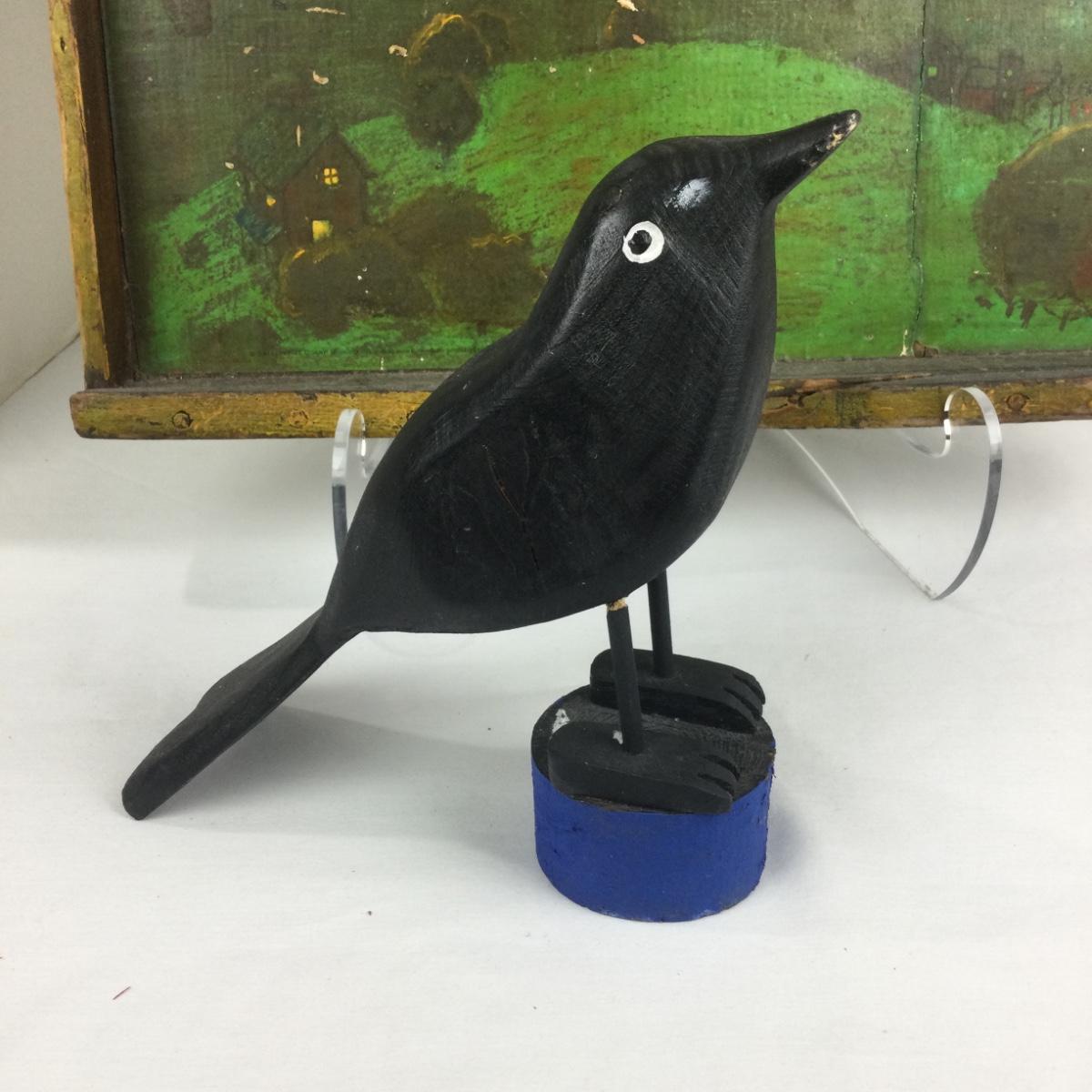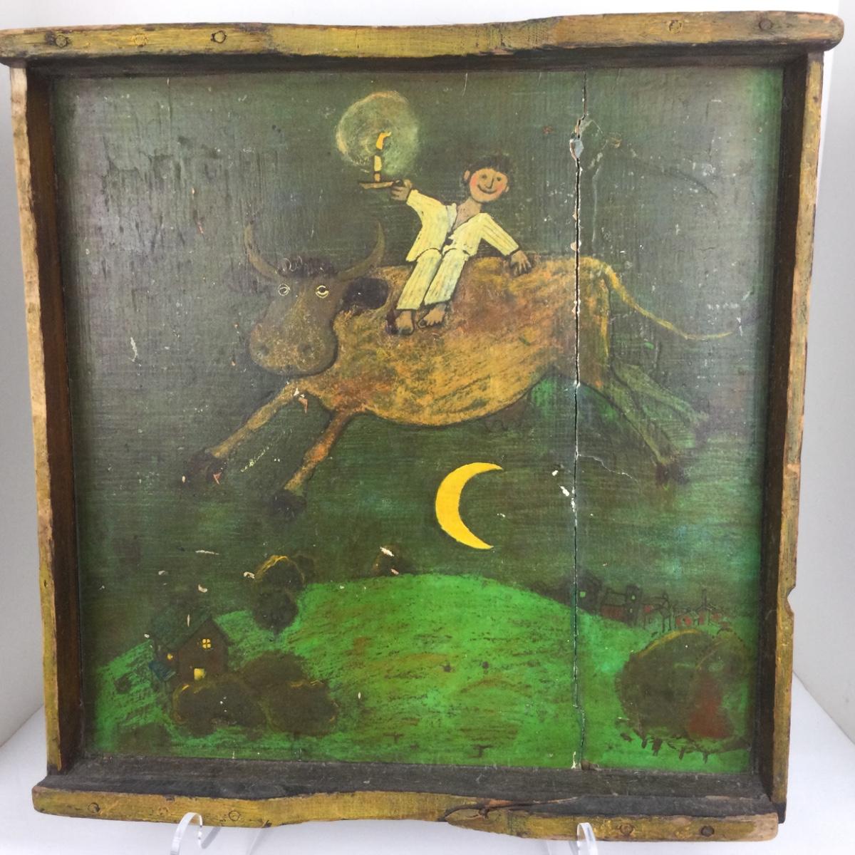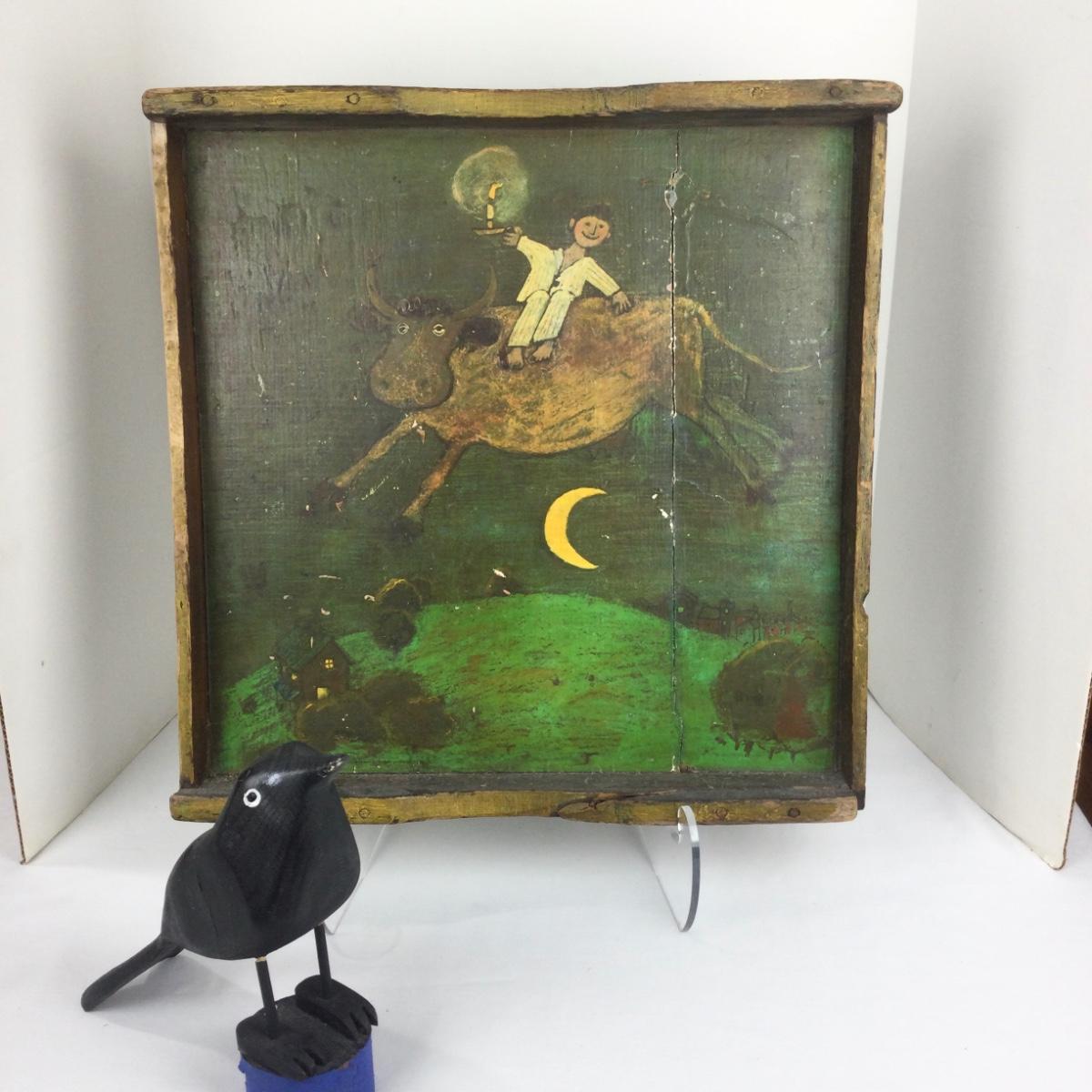 Lot contains primitive hand made “Cow Jumped over the Moon” Tray and carved crow by J.M. Poirier. Crow needs to be reattached to the base. The tray is 18.5” x 19” and the crow is 9.5” tall.