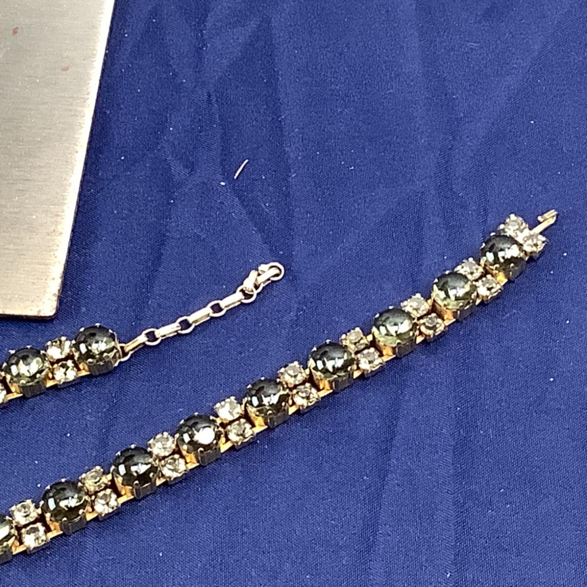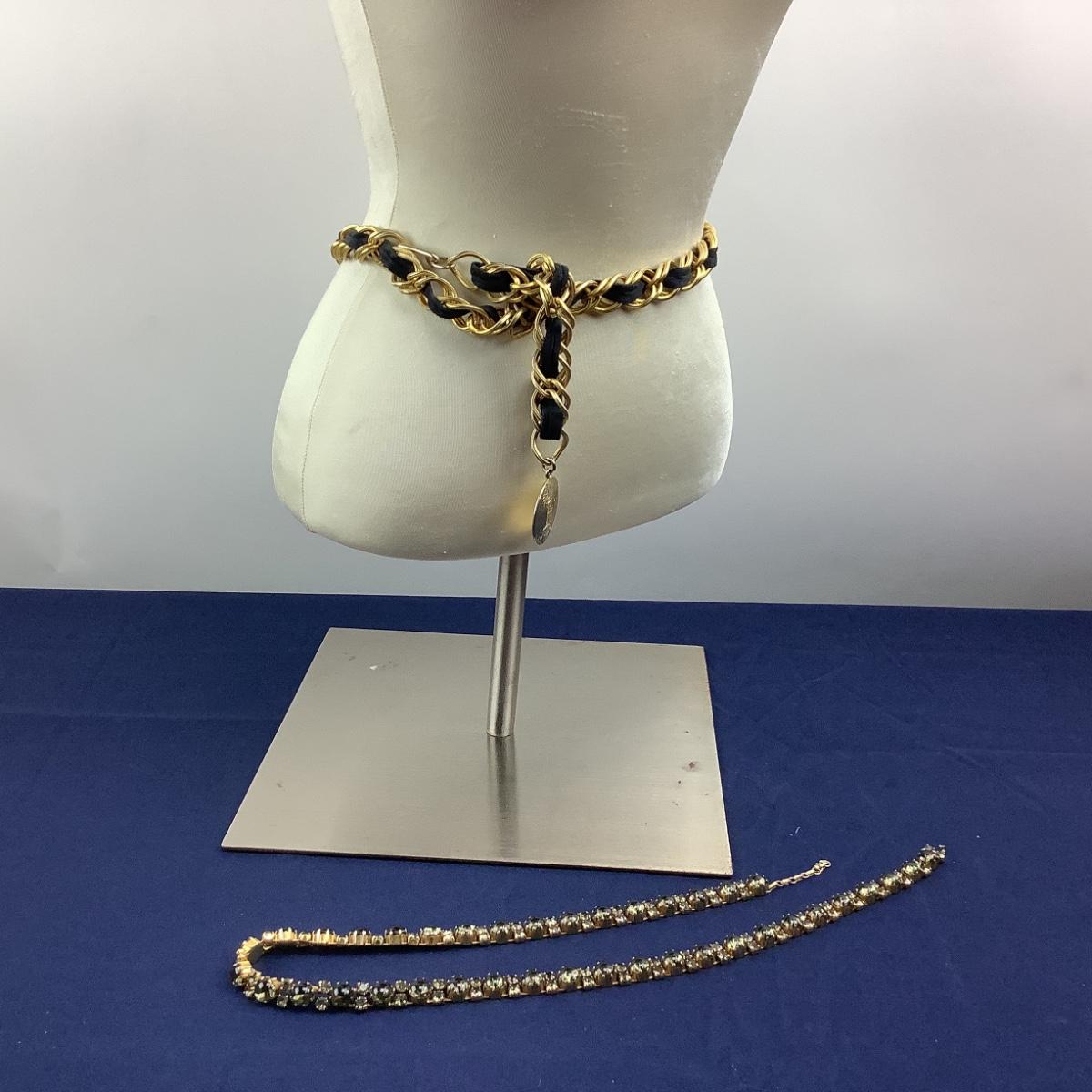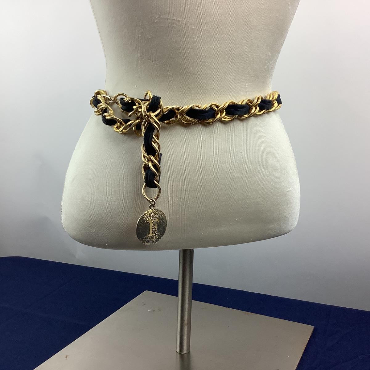 The Foxy Boutique belt is navy leather inside a gold tone chain and measures 31" from end to end. The costume smokey quartz belt is 38" in length.