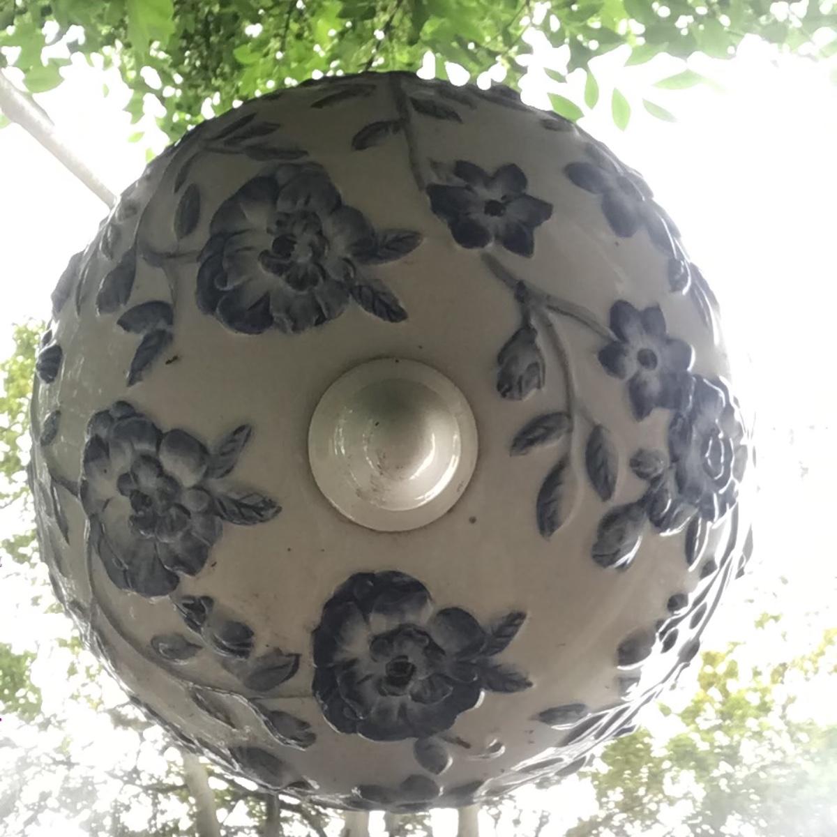one finial is off and needs to be put back on, overall in good condition and measures 9.5" diameter