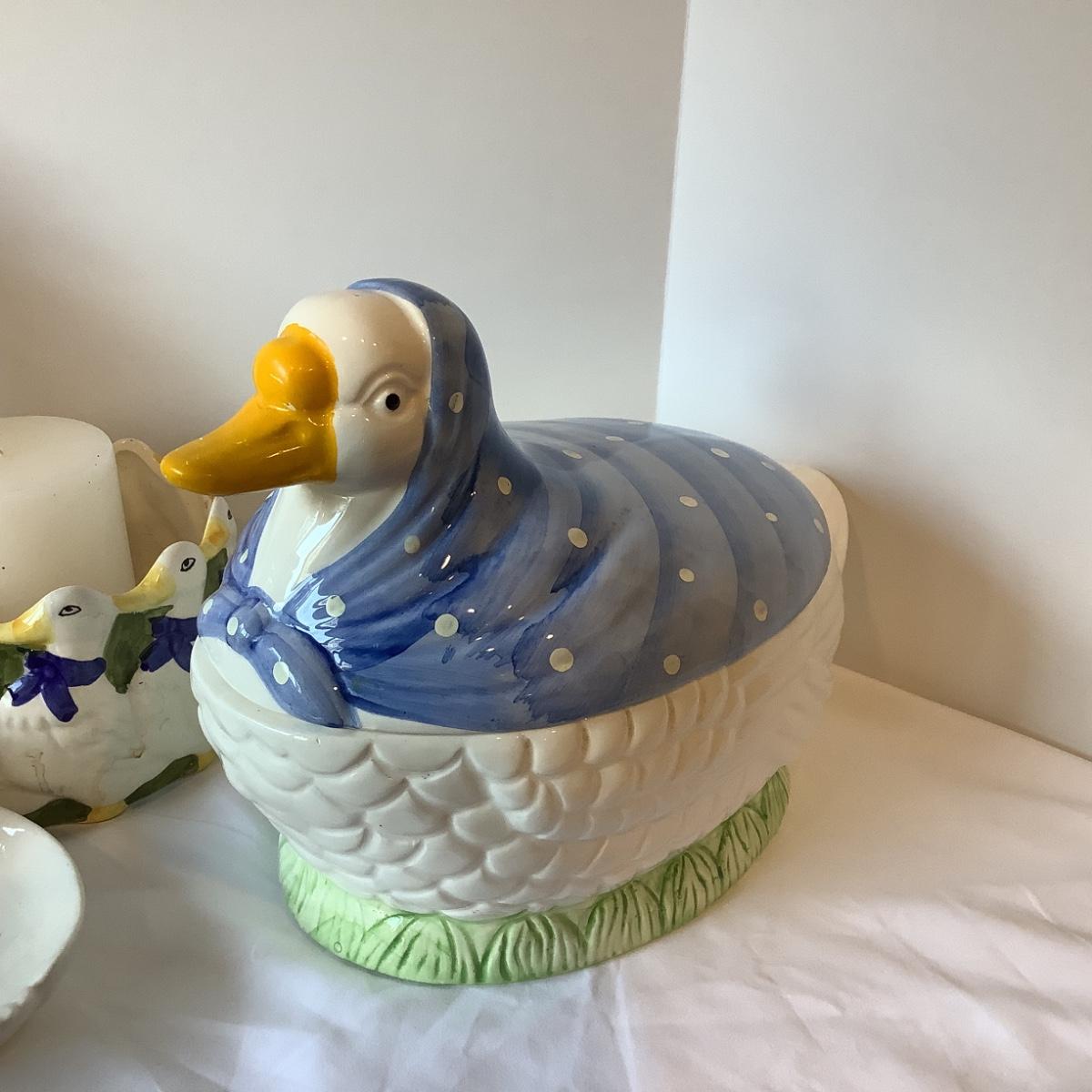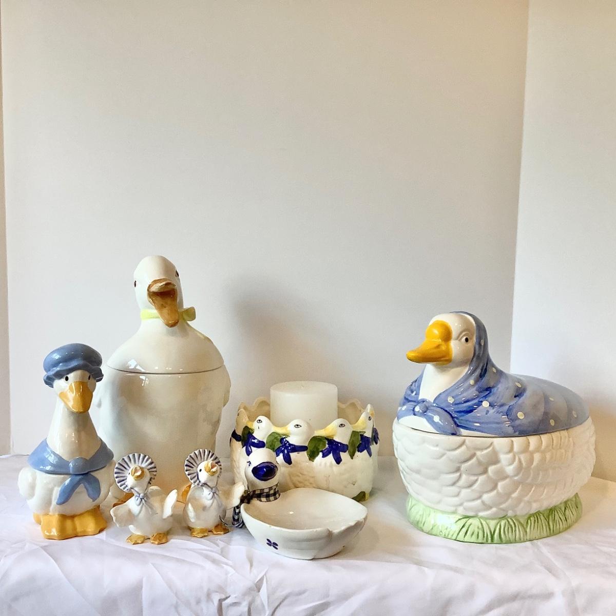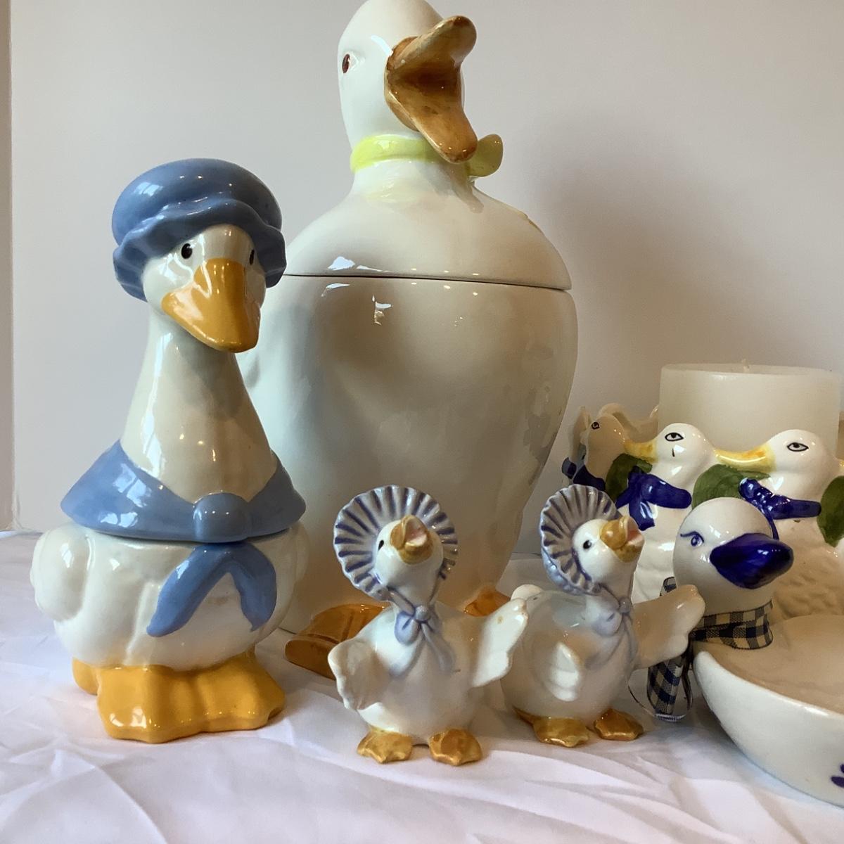 One large weiss white goose cookie jar with 1 pair of salt and pepper, one soap dish , one candle holder and one large duck cookie jar unmarked