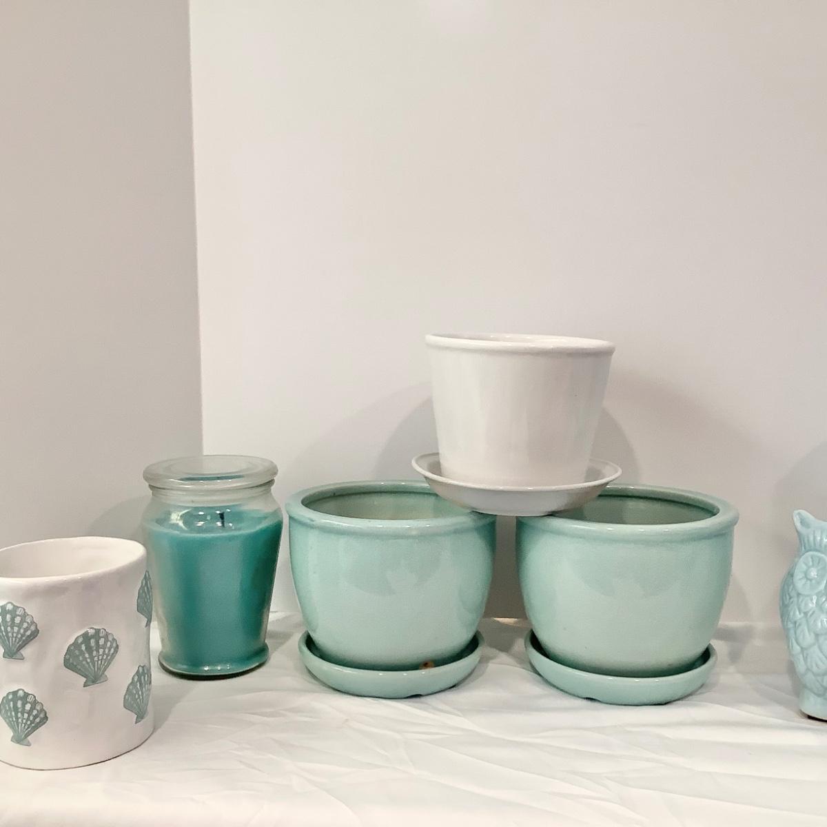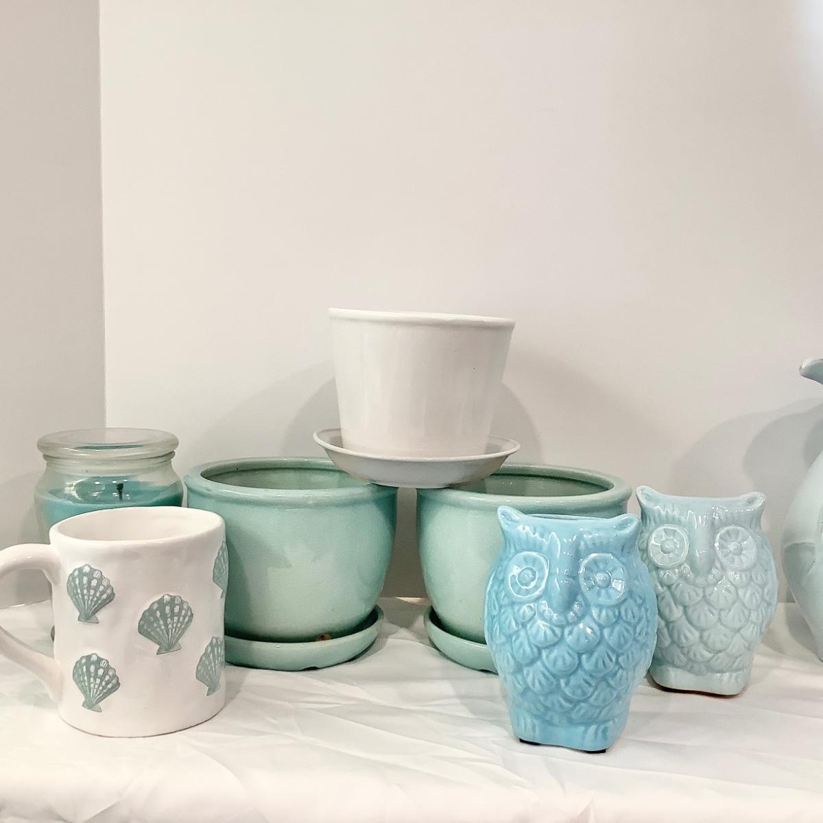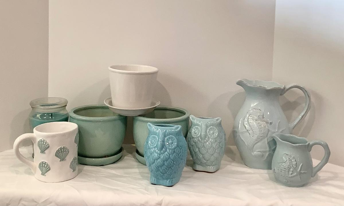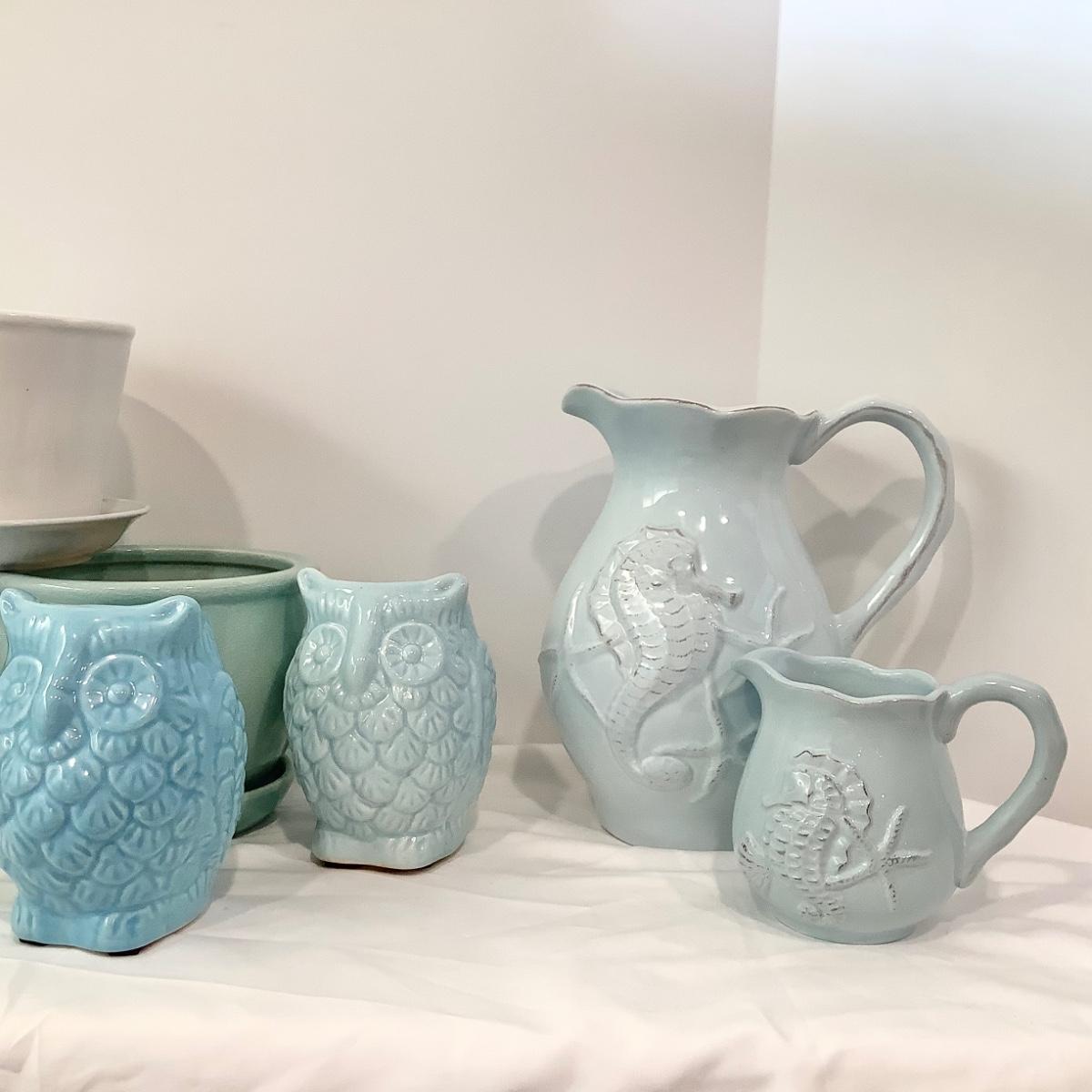 Blue sky seahorse pitcher and creamer , two glazed pots with saucers , one white flower pot, two decorative pottery owls and clam shell coffee mug