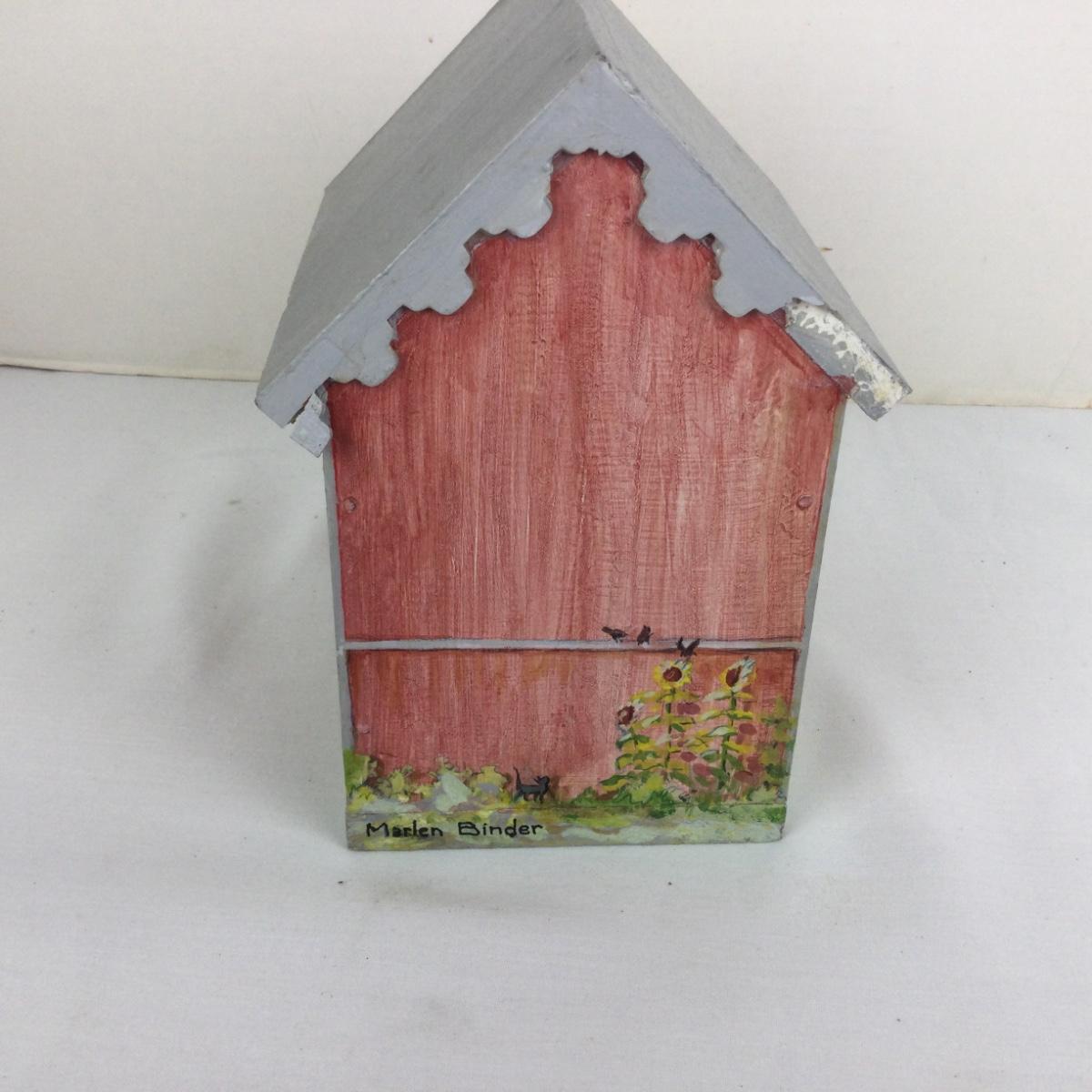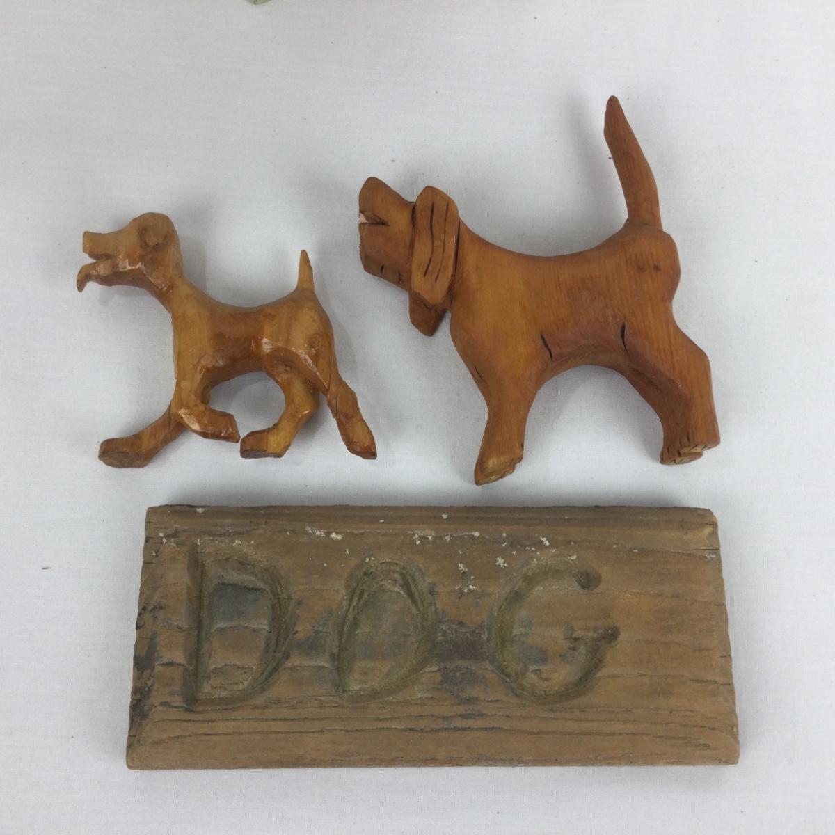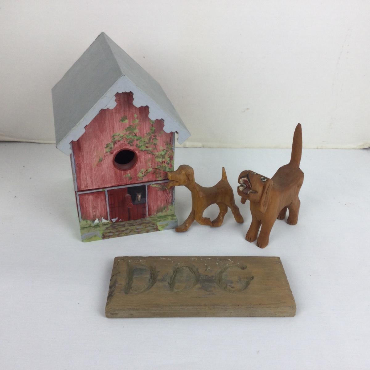 Hand carved and whittled dogs and dog sign, dogs are 3” x 3” and 4” x 4” and the sign is 7” x 3”. The birdhouse is hand painted and signed by the artist and is 8” x 6”.