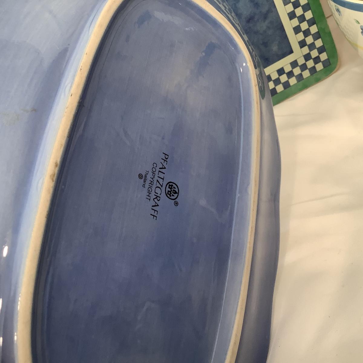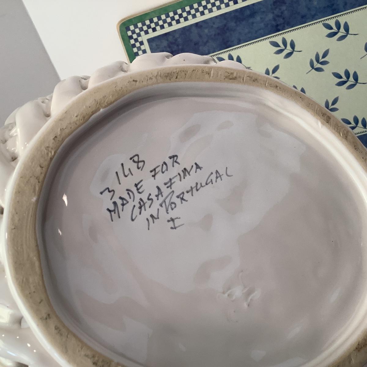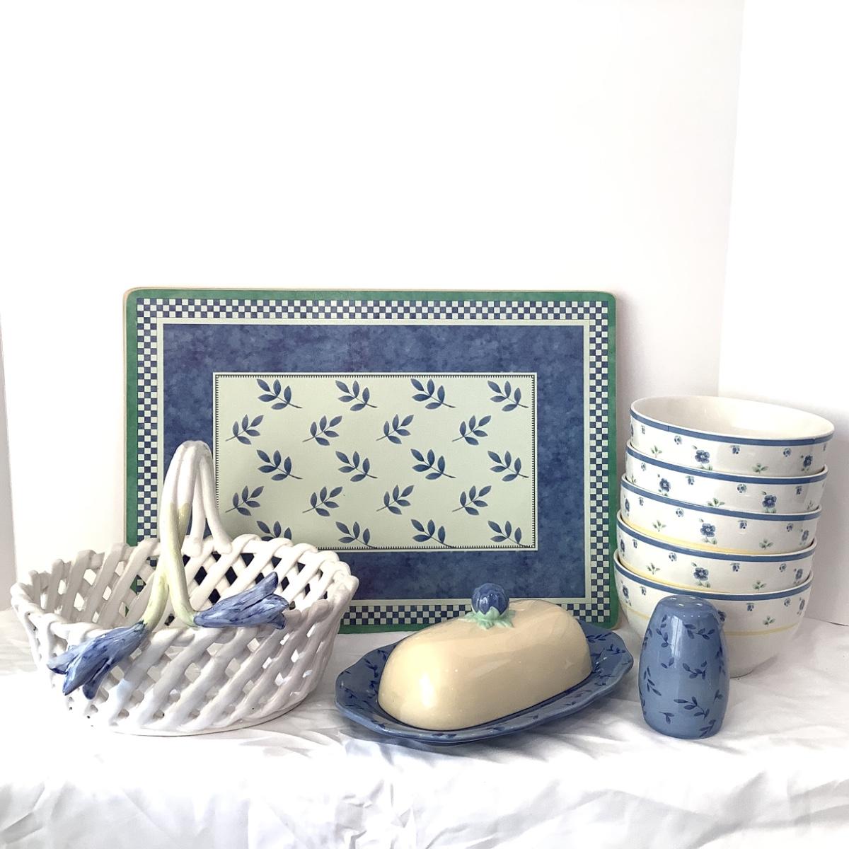 Set of 4 corkboard back placemats with 5 round bowls in shelby pattern and italian baskets and covered butter dish with one salt shaker