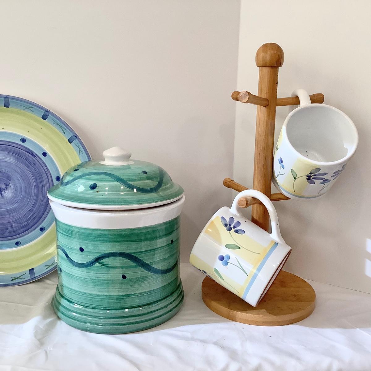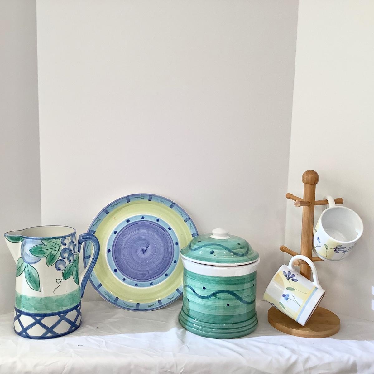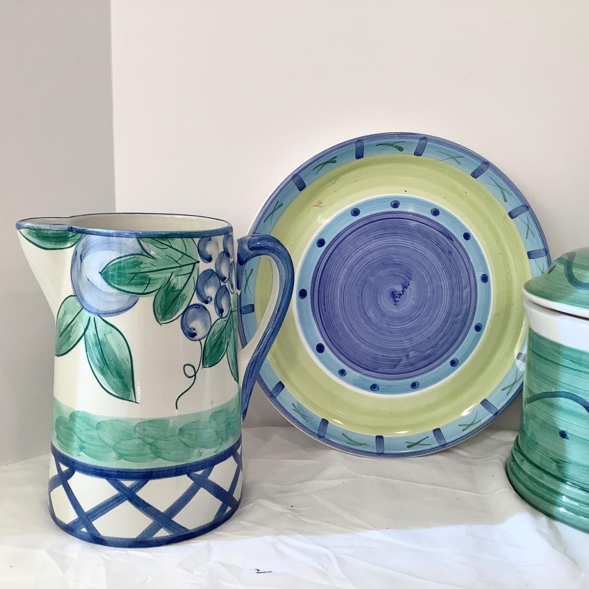 Plate is 11" round , pitcher is 8.5" high , with canister And 2 mugs