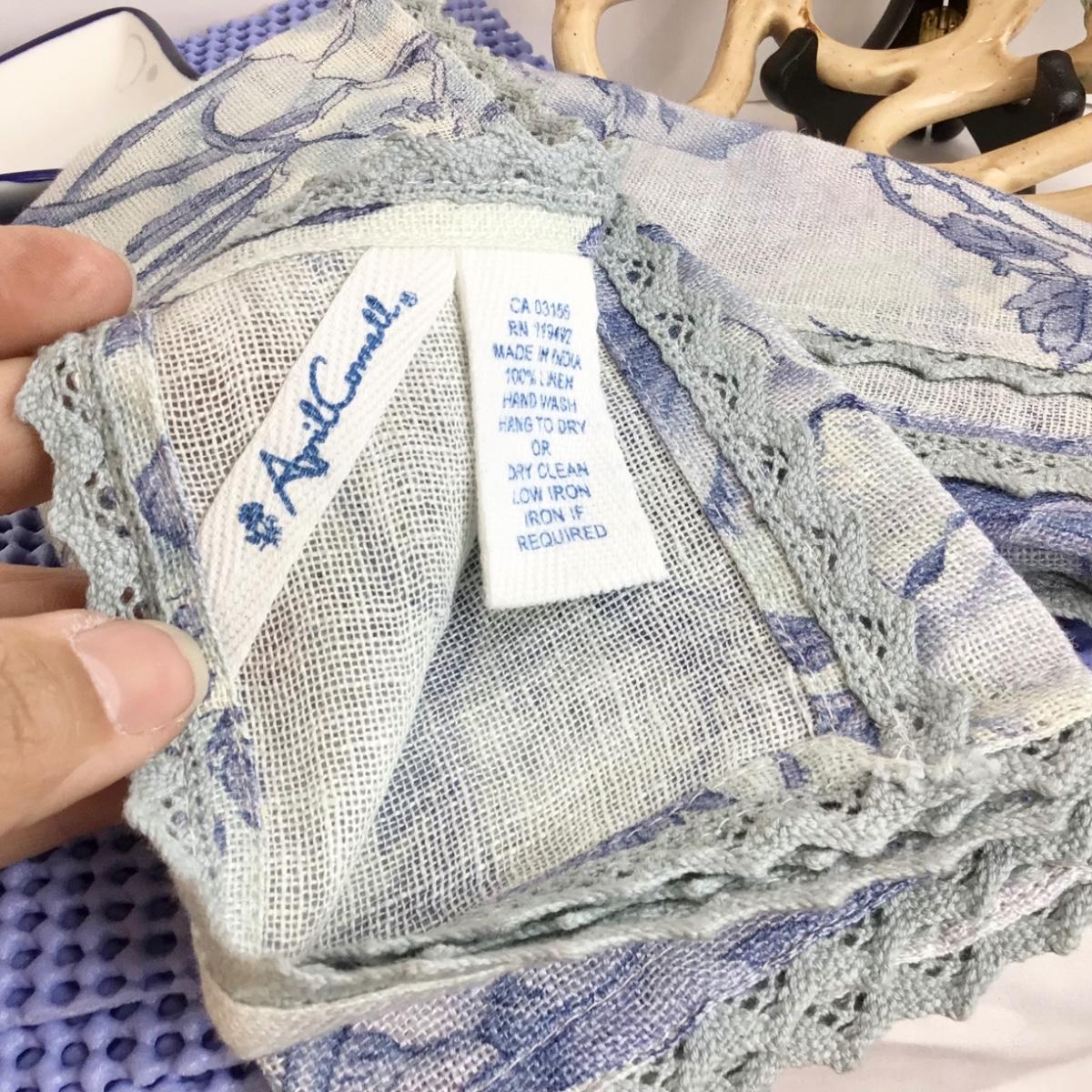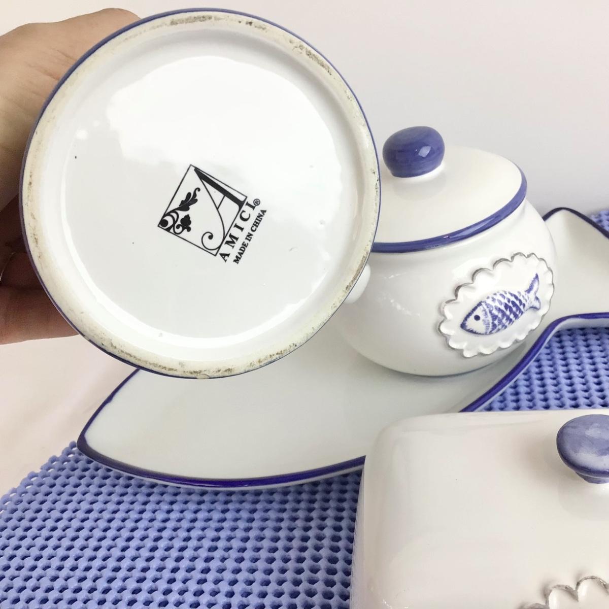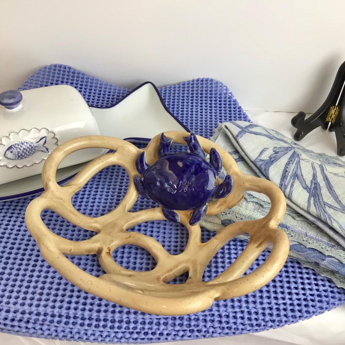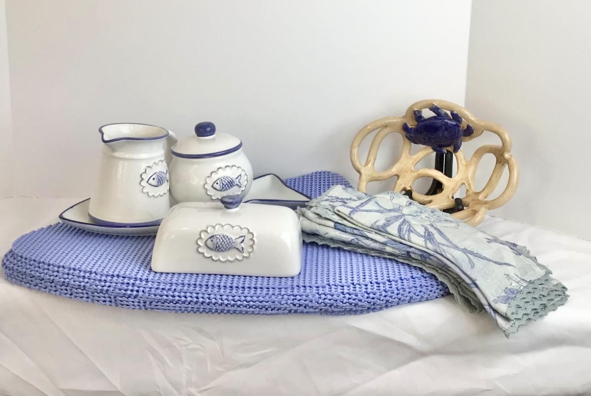 Set of 4 April Cornell Napkins , set of 8 New Serenity Wedge Placemats, open blue crab pottery bowl with cream and sugar fish pottery