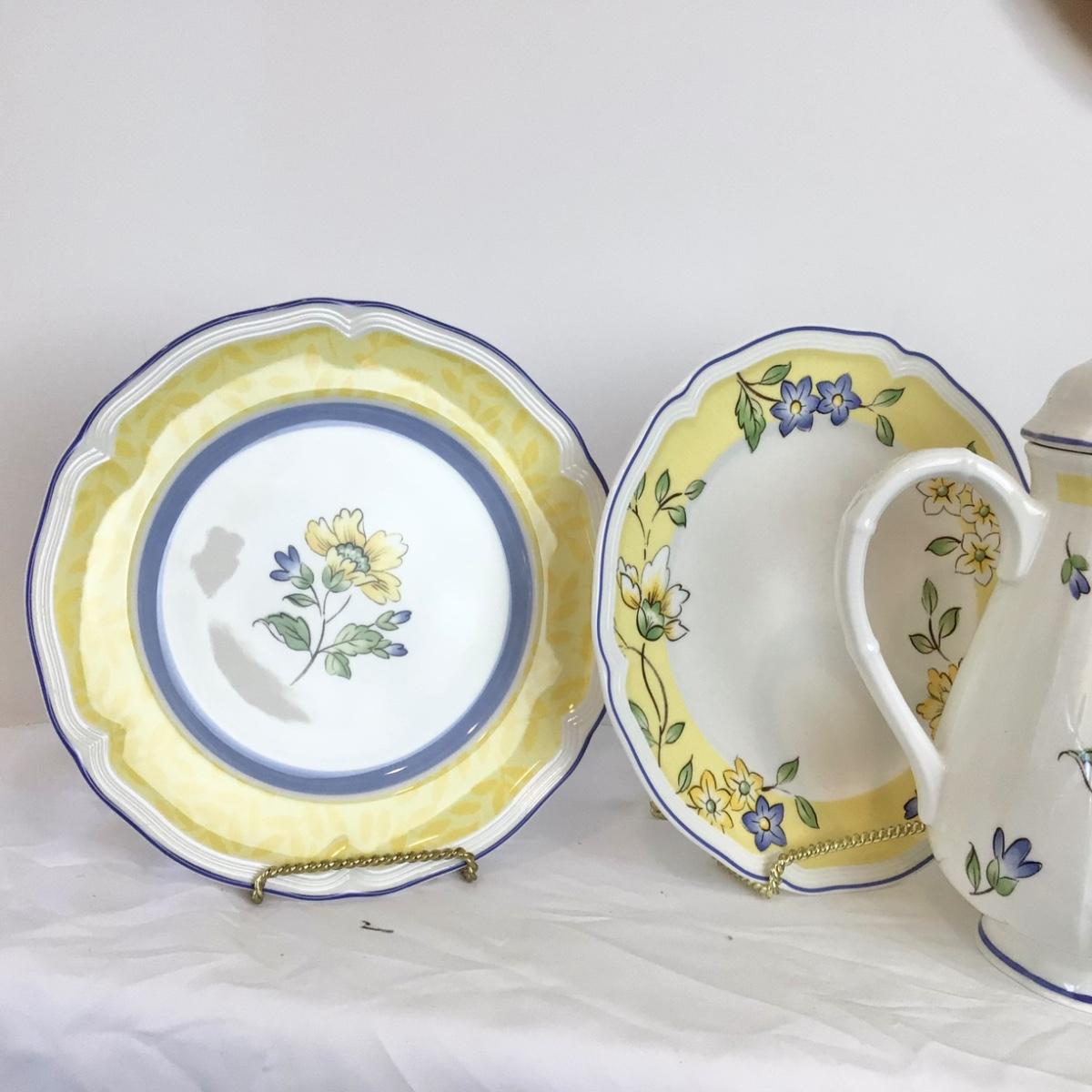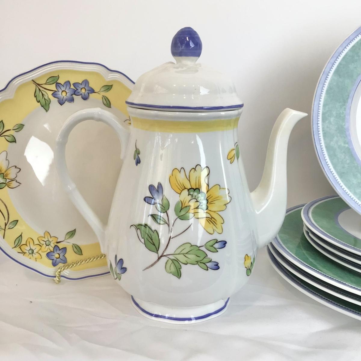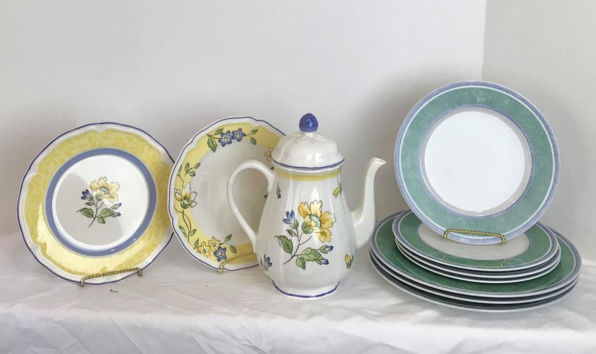 4 salad, 3 dinner, 2 floral plates, one coffee pot